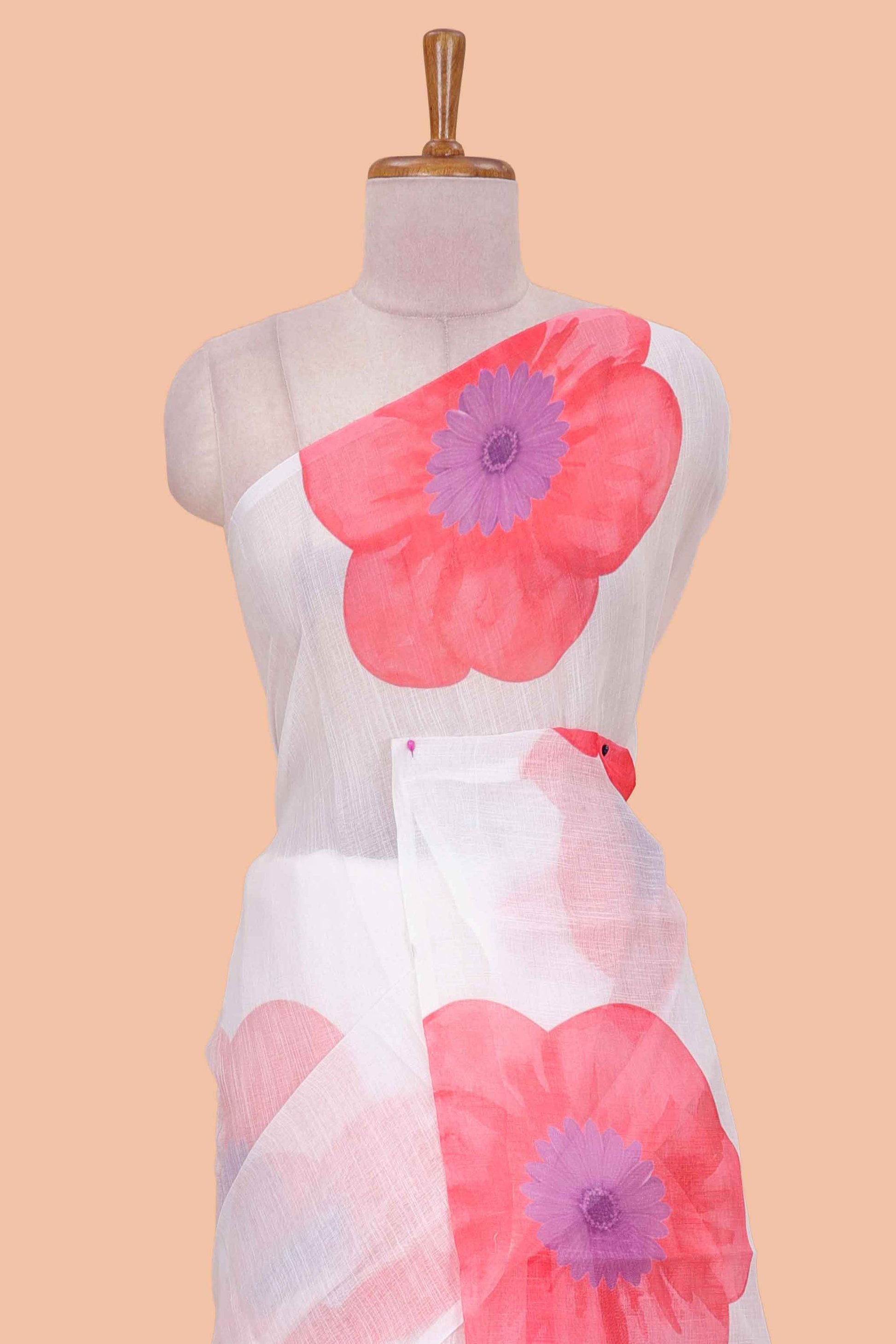 Borderless white linen cotton with pink floral print saree and contrast blouse