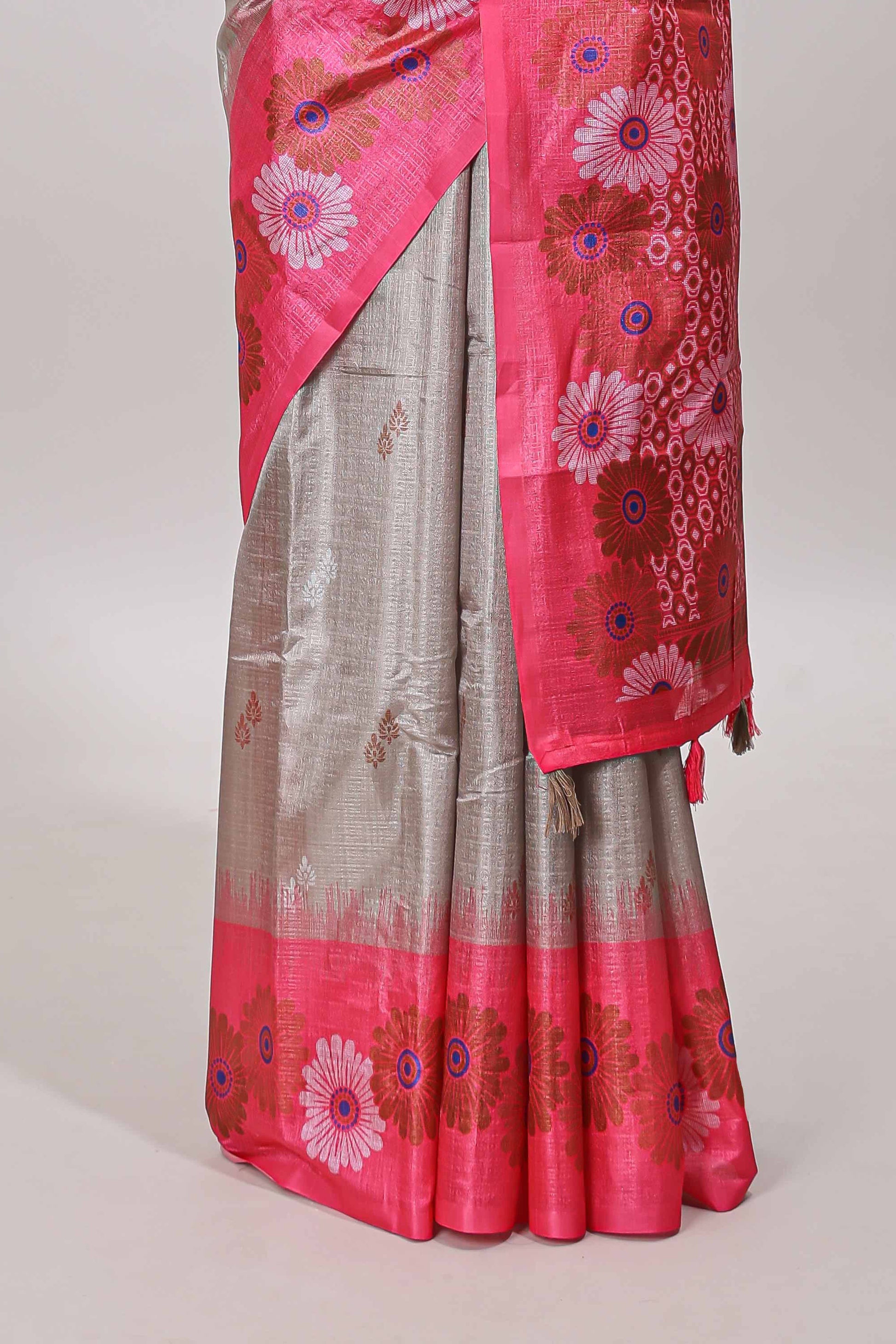 Brown floral design motifs tussar sarees with contrast floral print border and printed pallu