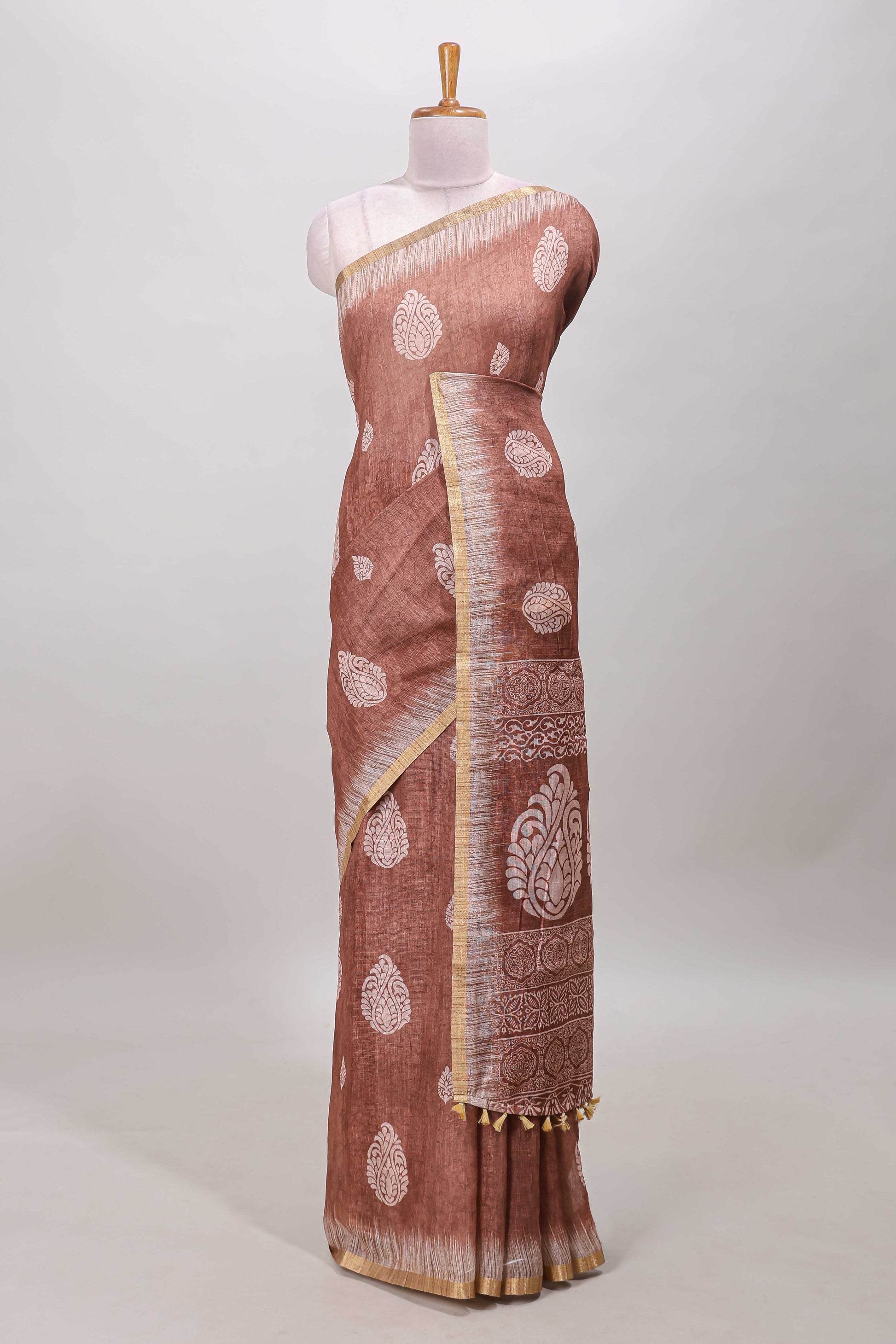 Brown paisley motifs linen cotton saree with self zari border and matching blouse