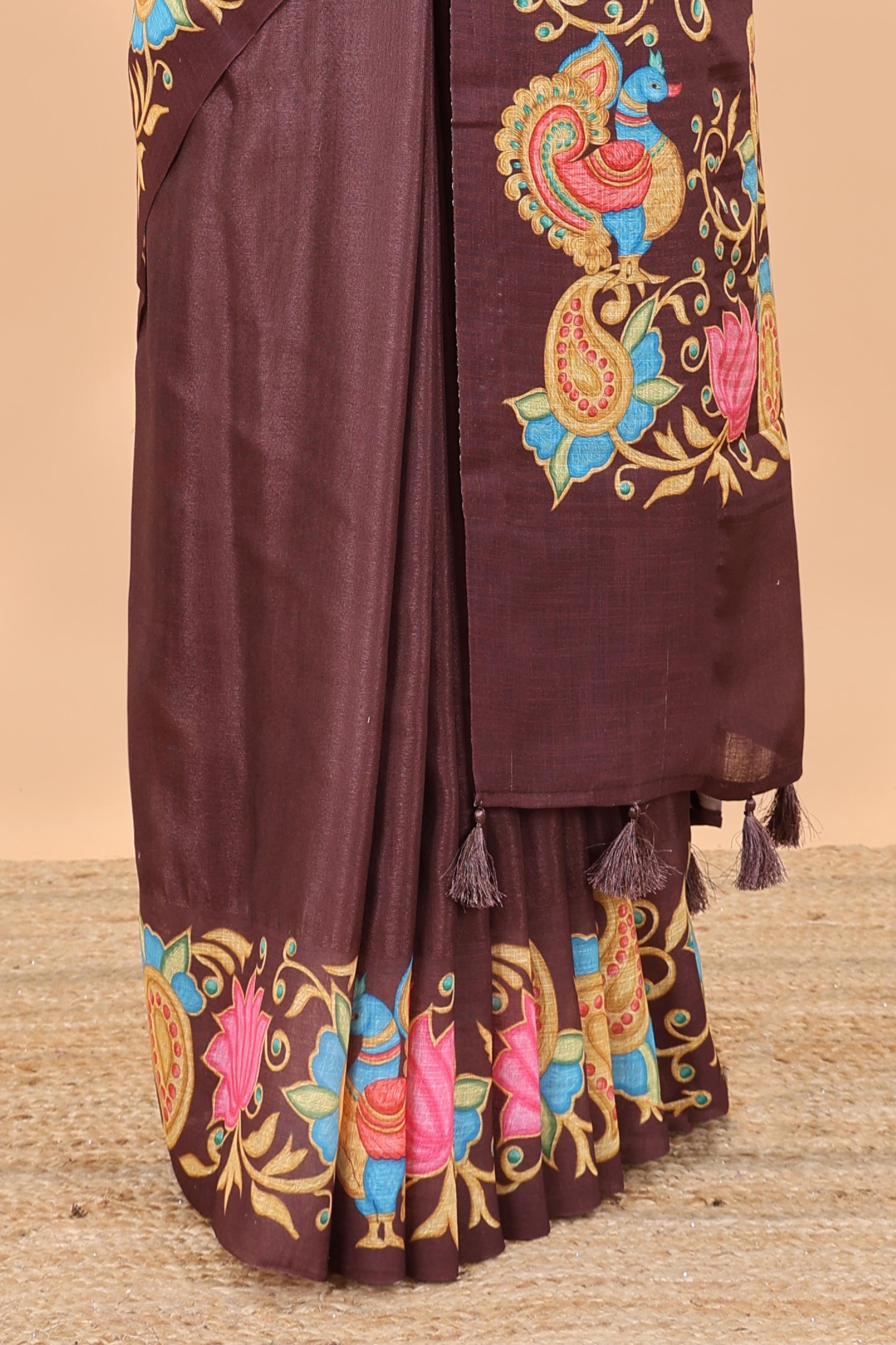 Brown tanjore painting style linen tussar saree with peacock & lotus motifs and printed pallu
