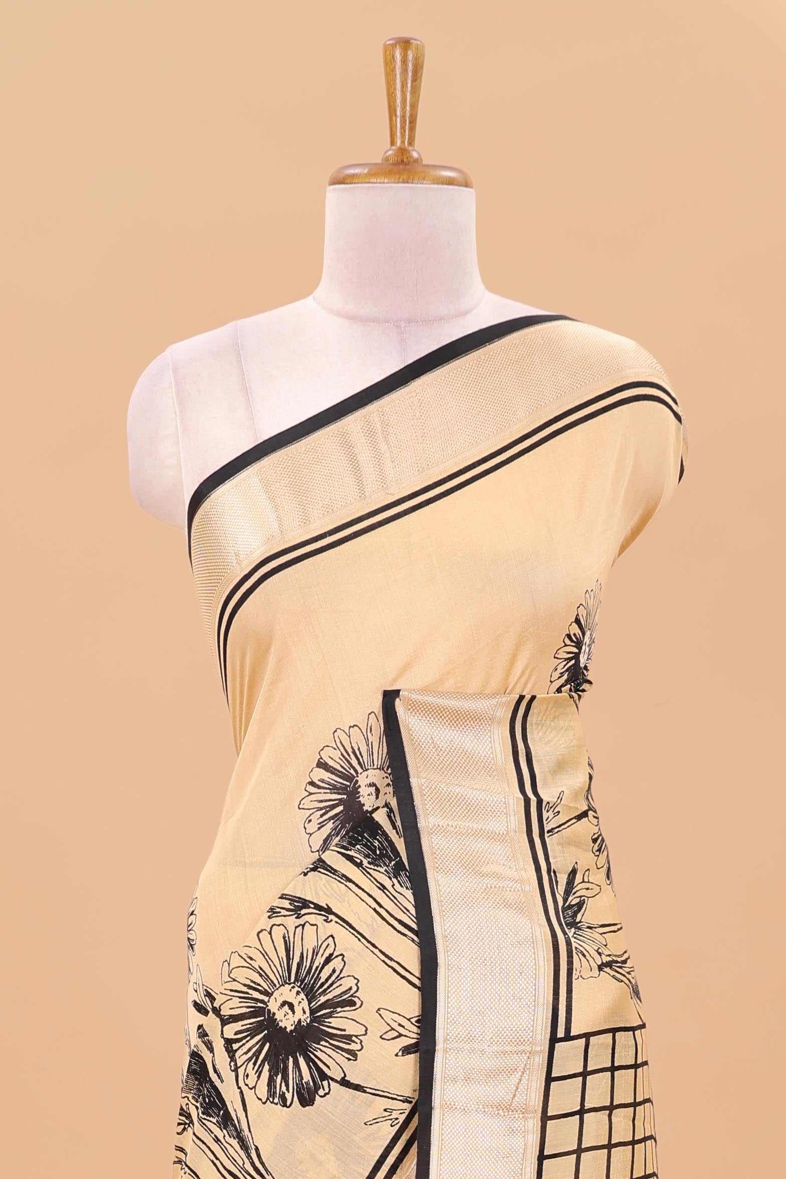 Pastal orange floral print chanderi cotton saree with zari pallu
