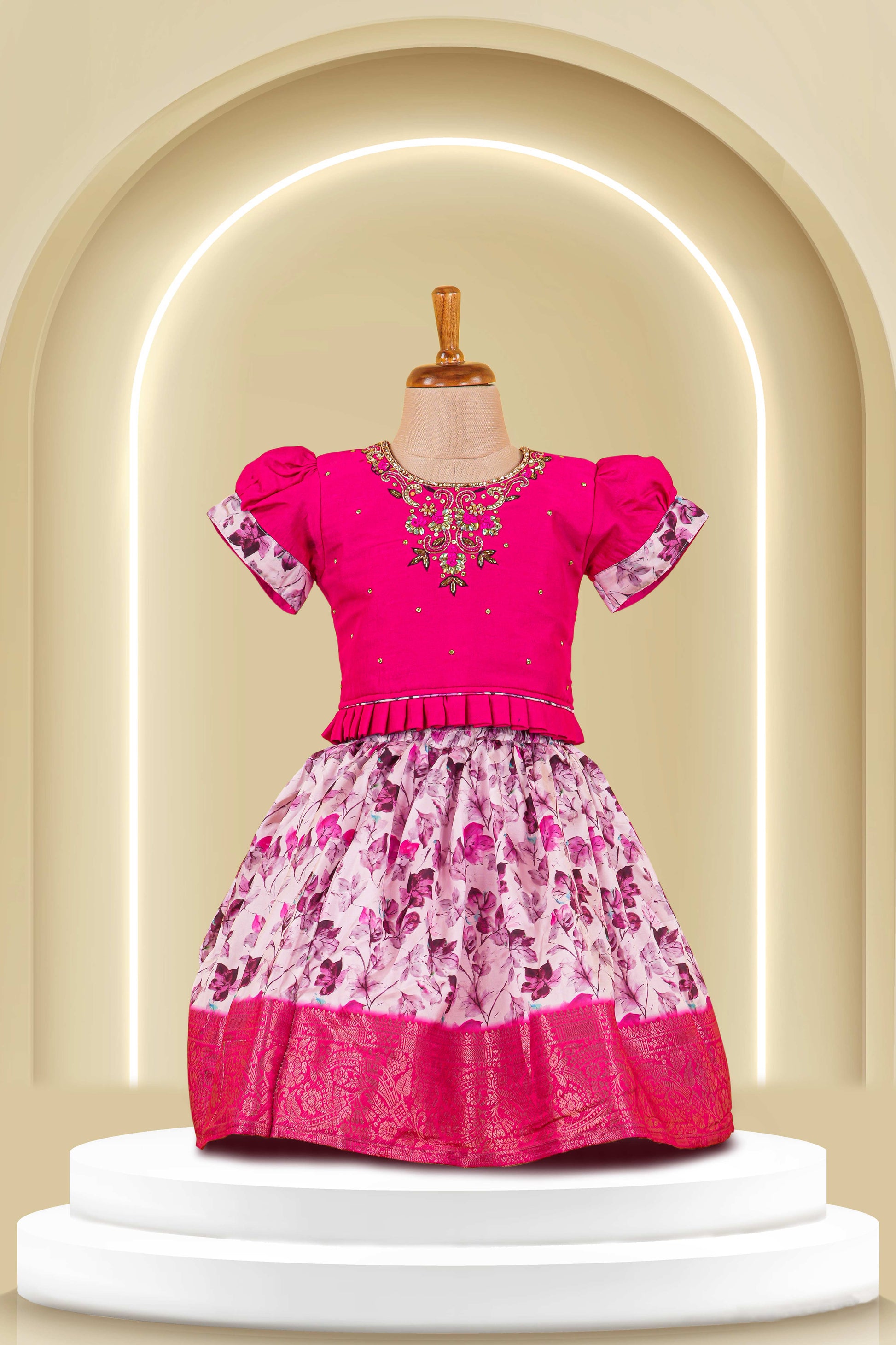 Pink Choli Lehenga Set Top Stone Embroidery ,Puff Sleeves With Skirt All-Over Floral Print & Net Dupatta