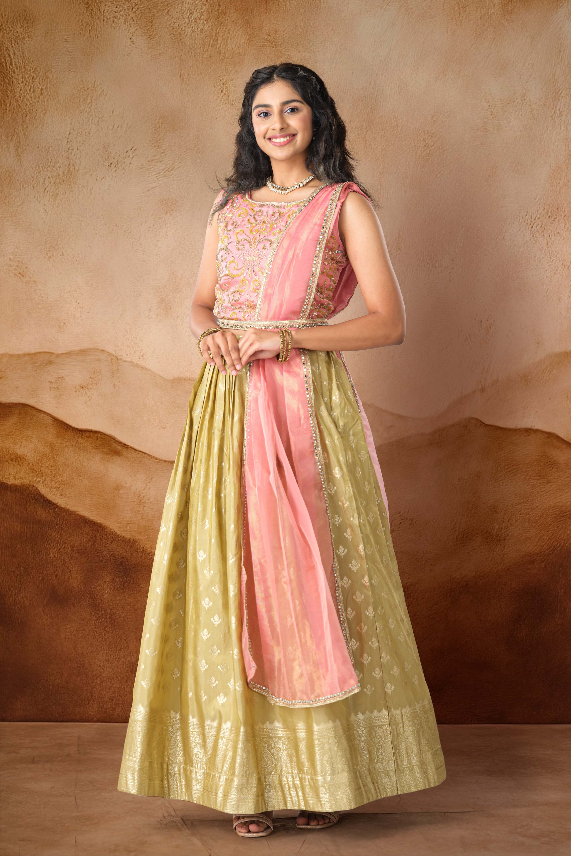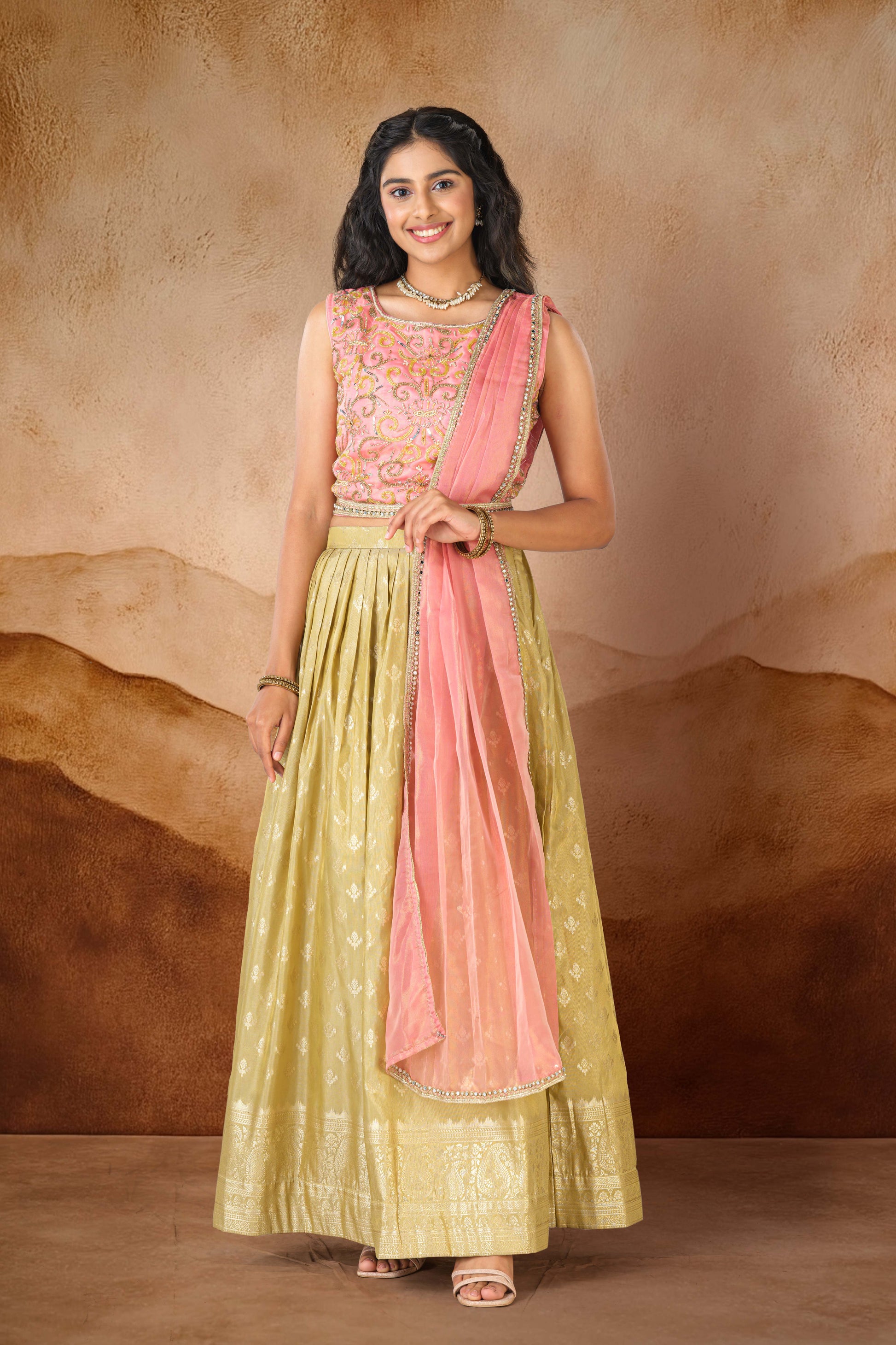 Make a Statement In This Exquisite Party Wear Lehenga Set Peach Stone Embroidery Top And Olive Green Flared Skirt Adorned With Detailed Zari Buttas That Adds A Touch Of Regal Charm. Paired With a Matching Crop Top & A Sheer Dupatta