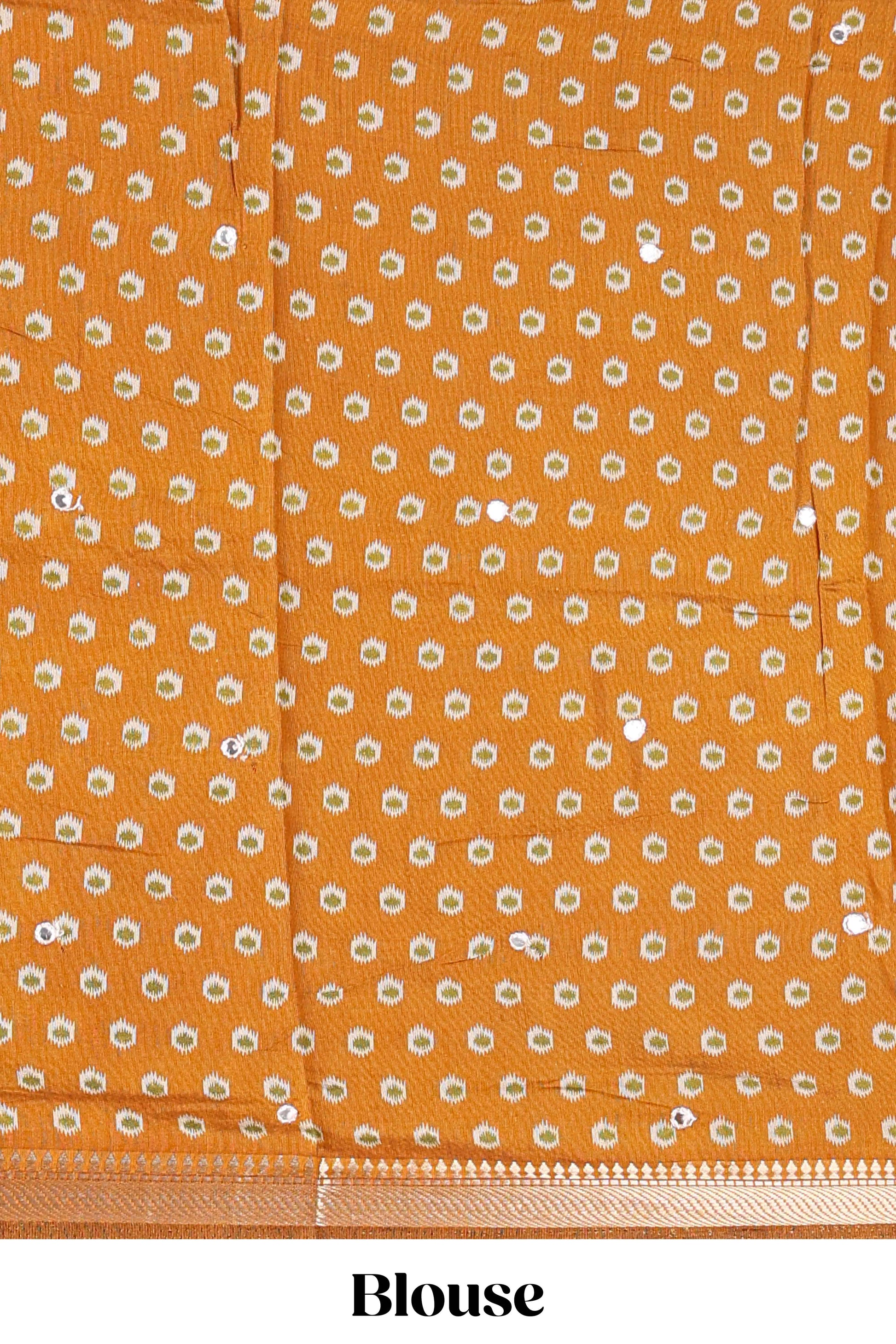 Cream chanderi cotton saree with geometric floral butta, mustard zari border and patola inspired mirror work
