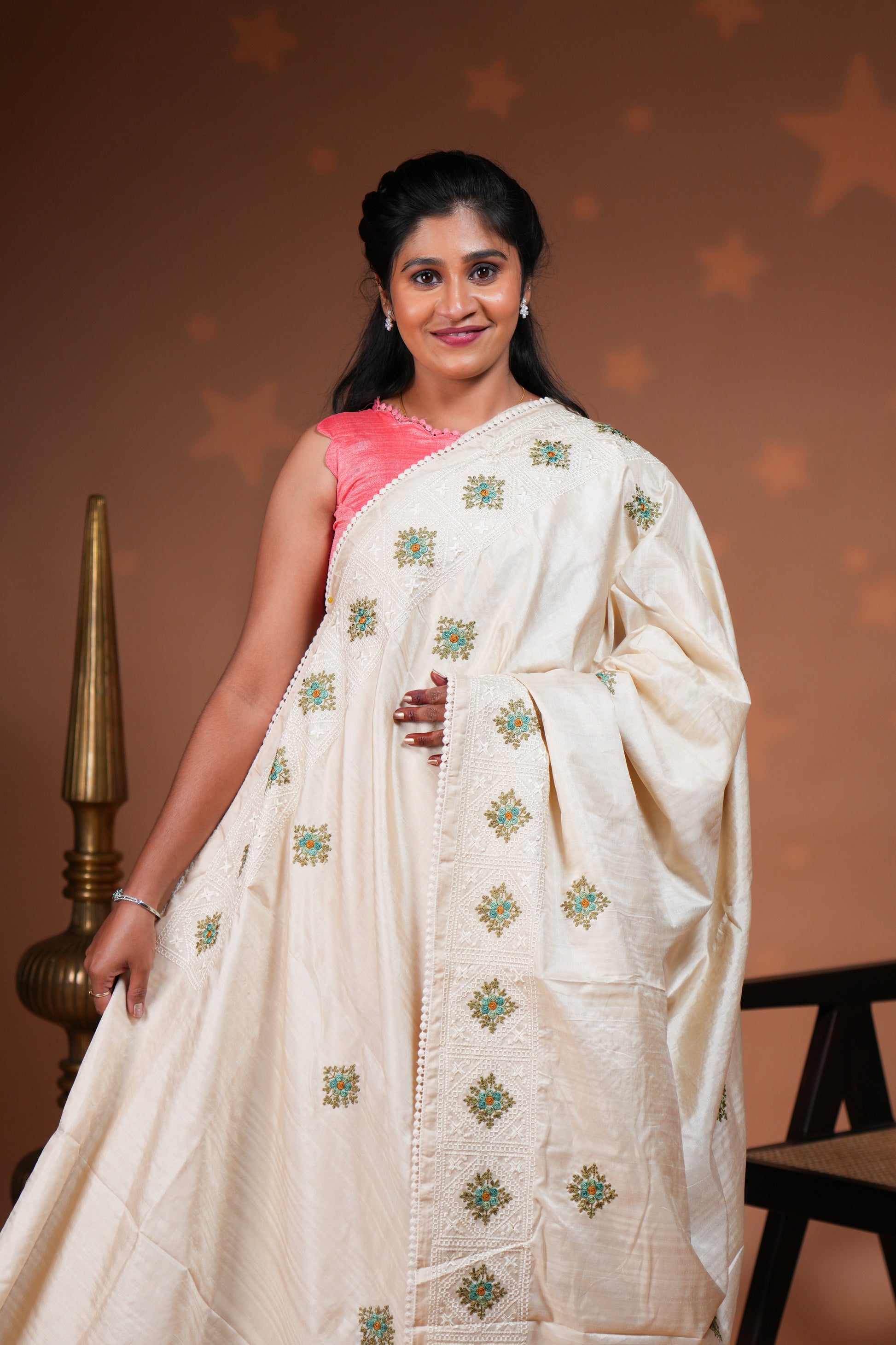 Cream embroidery floral motifs design raw silk saree with self border and matching blouse