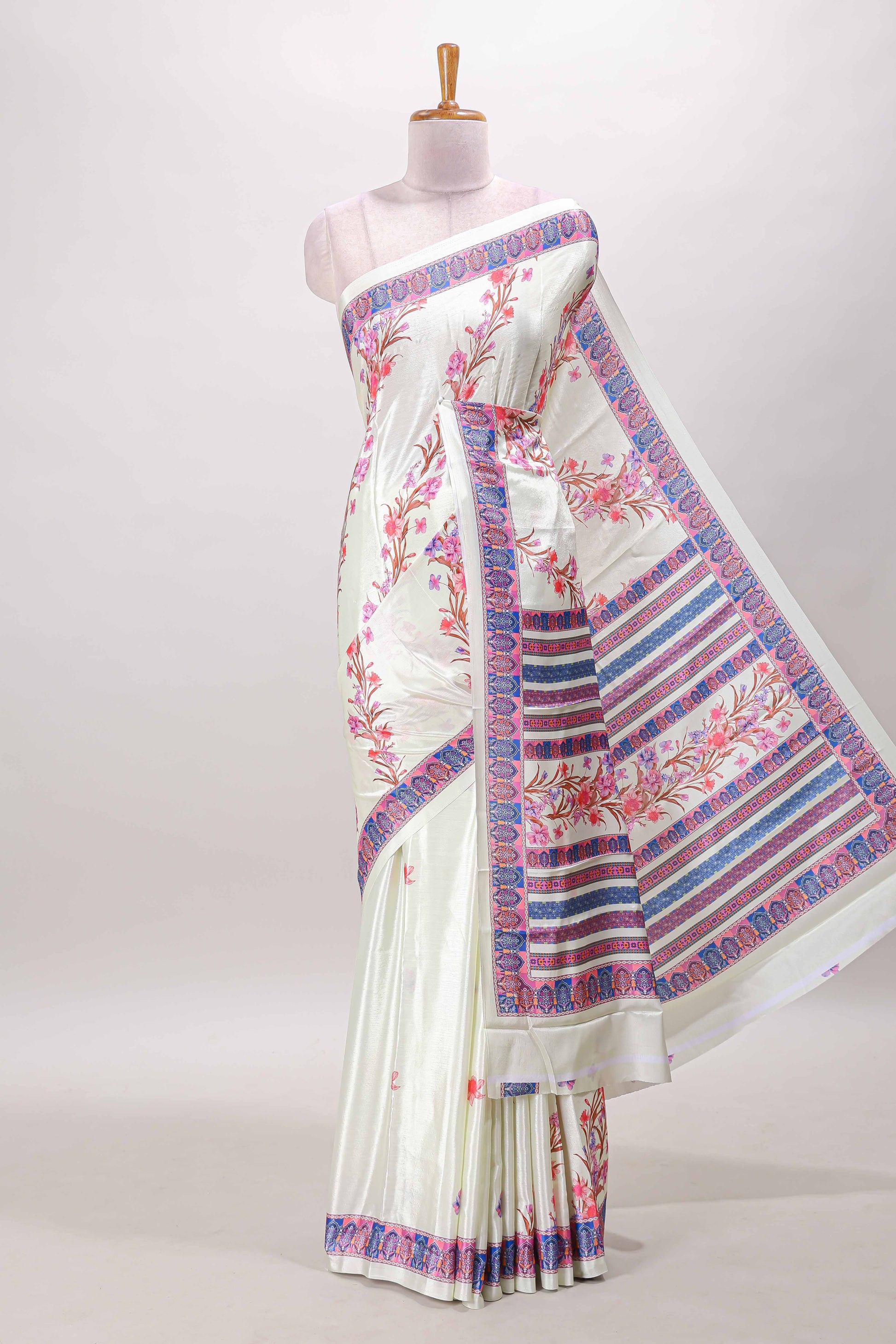 Cream floral print georgettte saree with self floral design border matching striped pallu