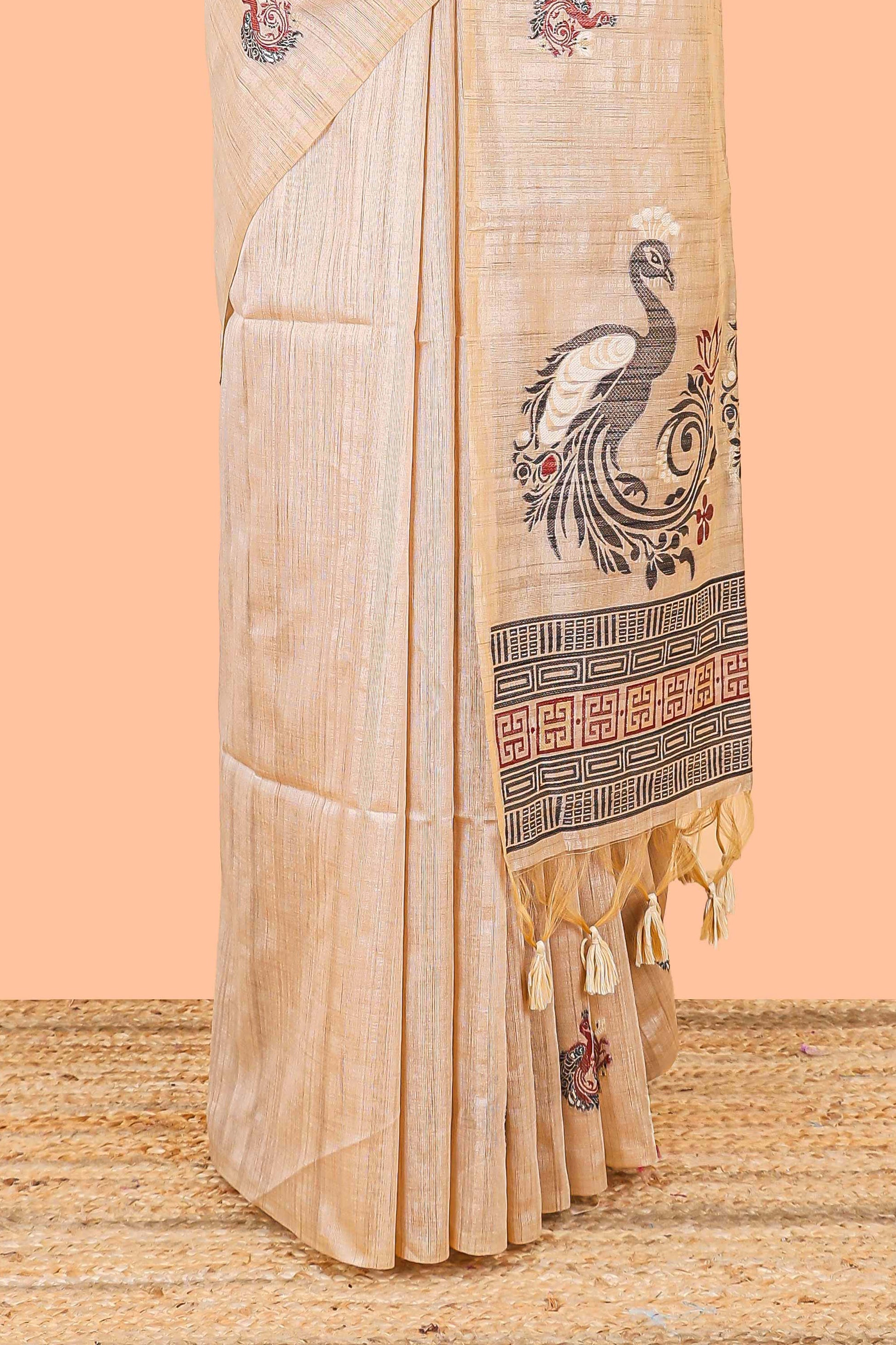 Cream munga cotton peacock butta saree with fine thread weaving, borderless style and matching blouse