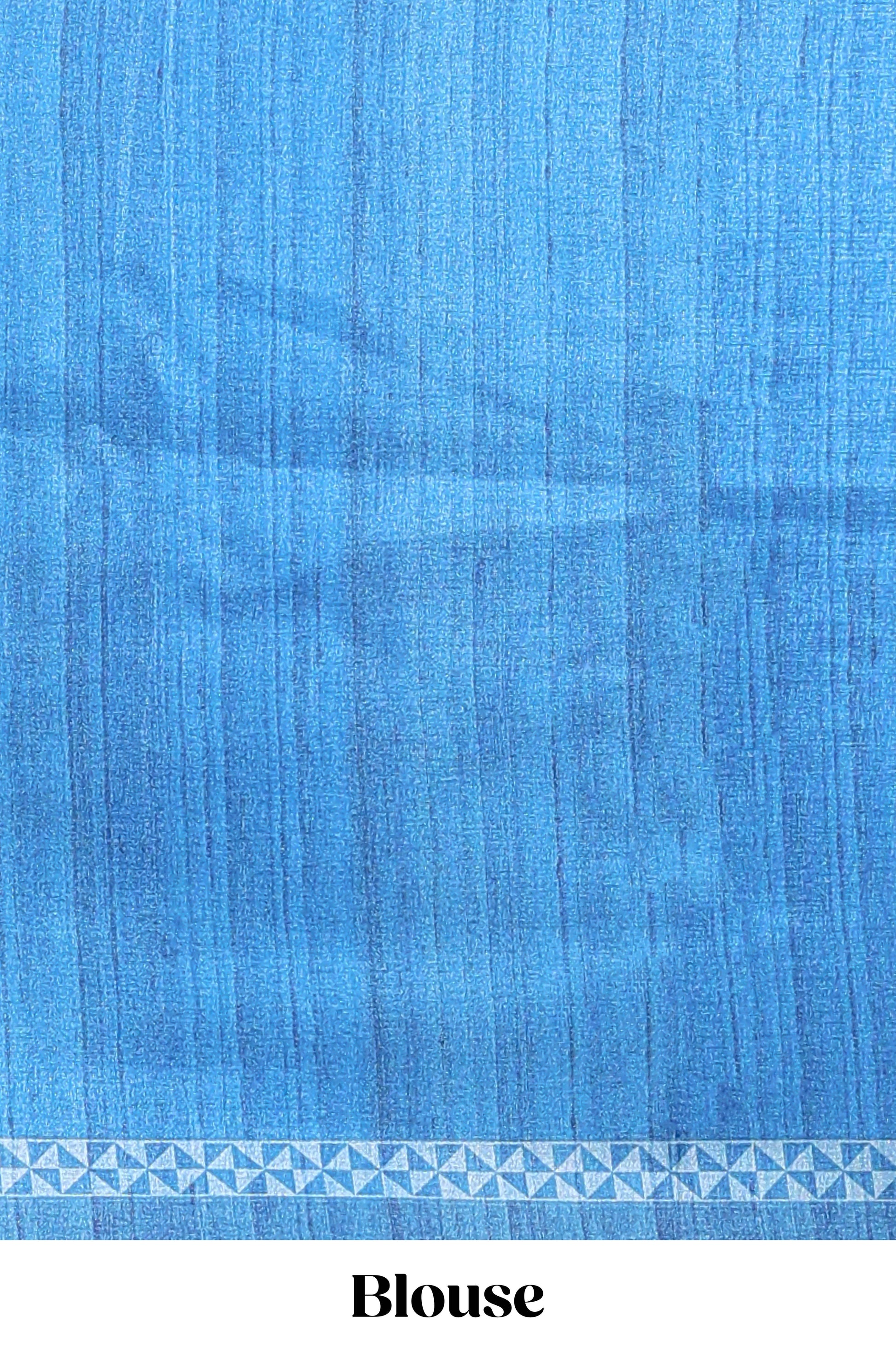 Cream peacock motifs tussar saree with contrast blue border and peacock printed pallu