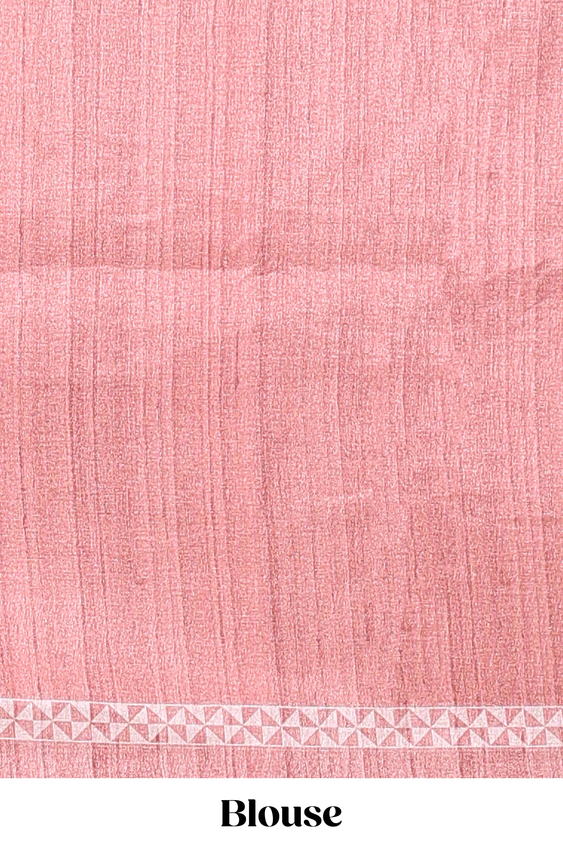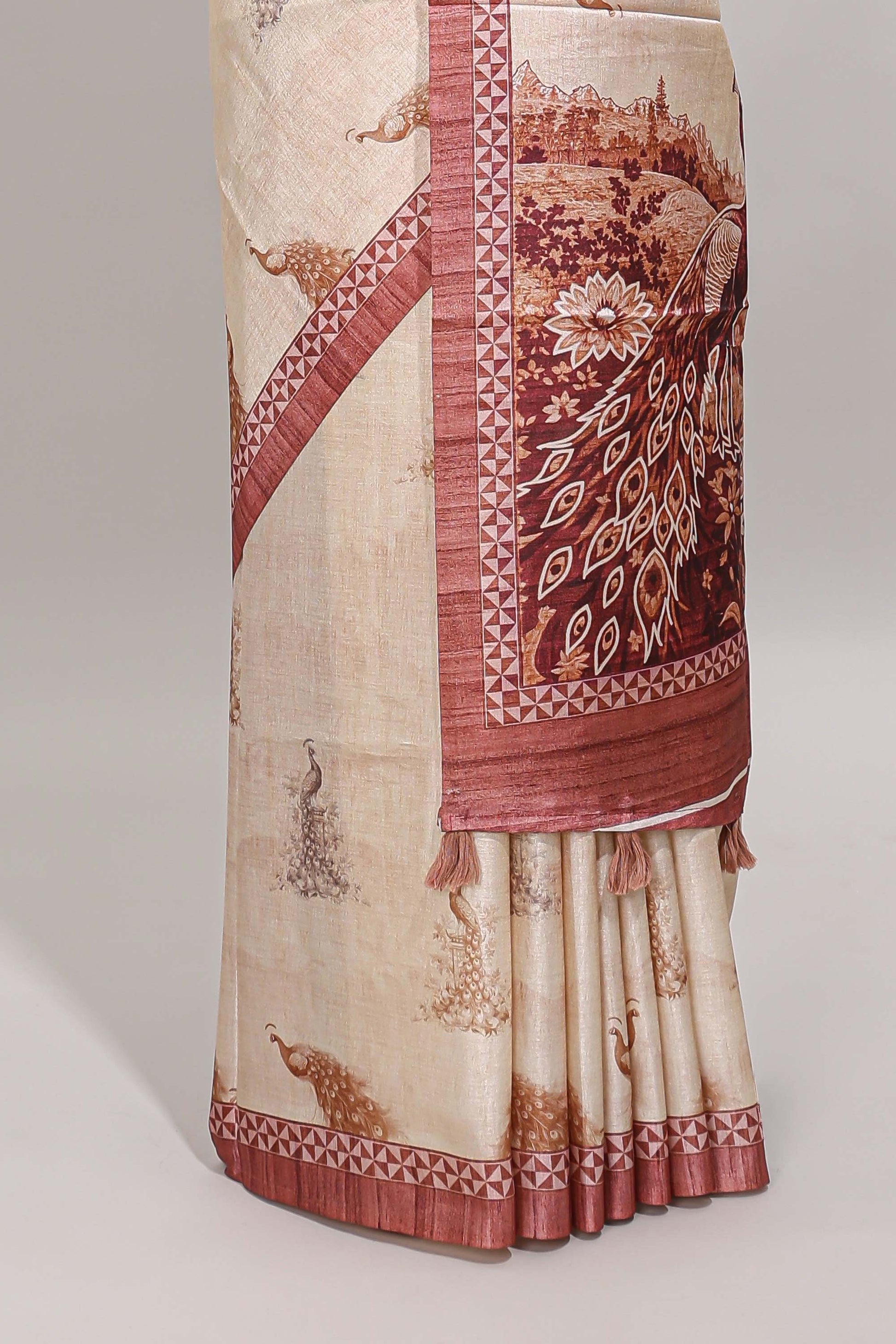 Cream peacock motifs tussar saree with contrast peach border and peacock printed pallu
