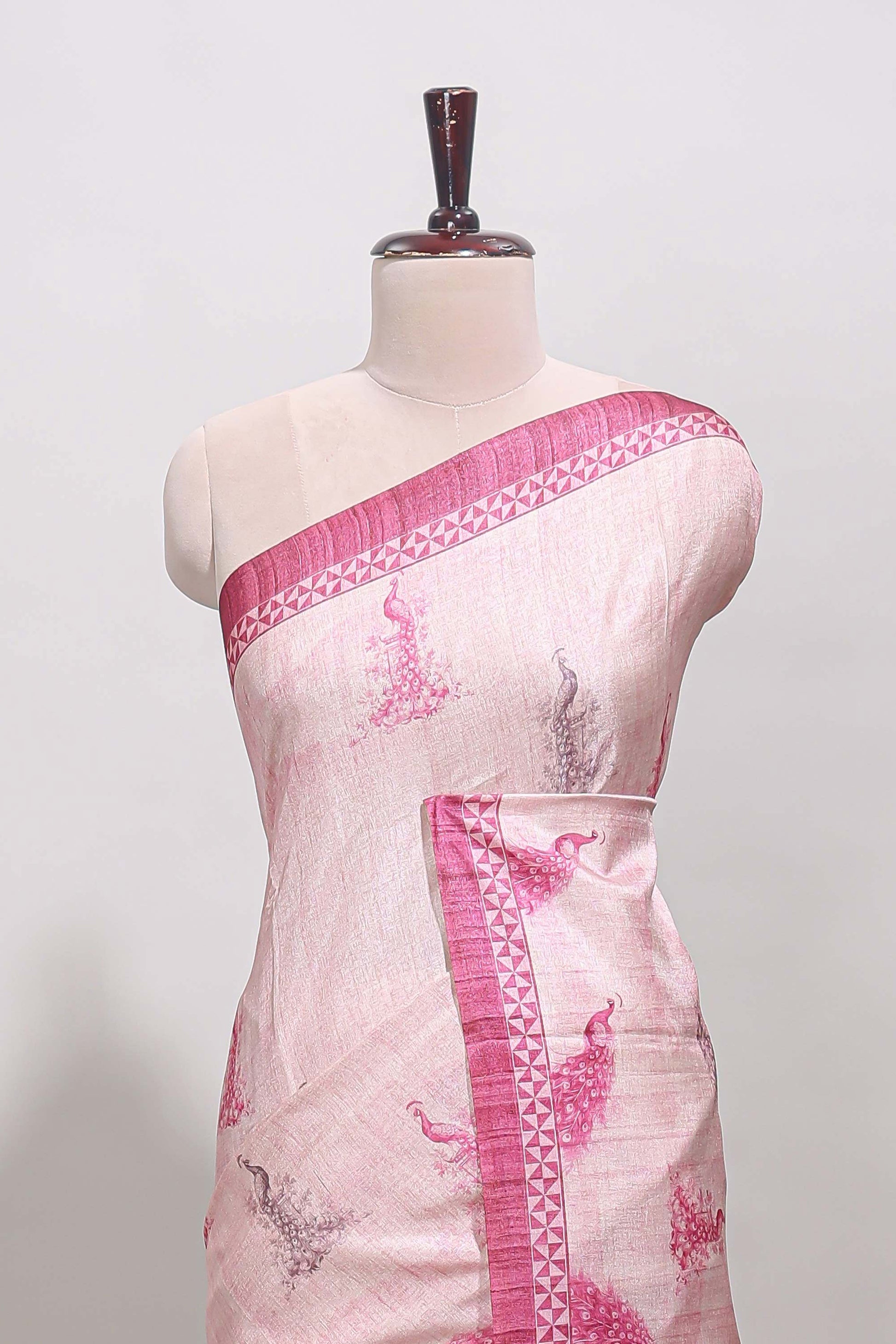 Cream peacock motifs tussar saree with contrast pink border and peacock printed pallu