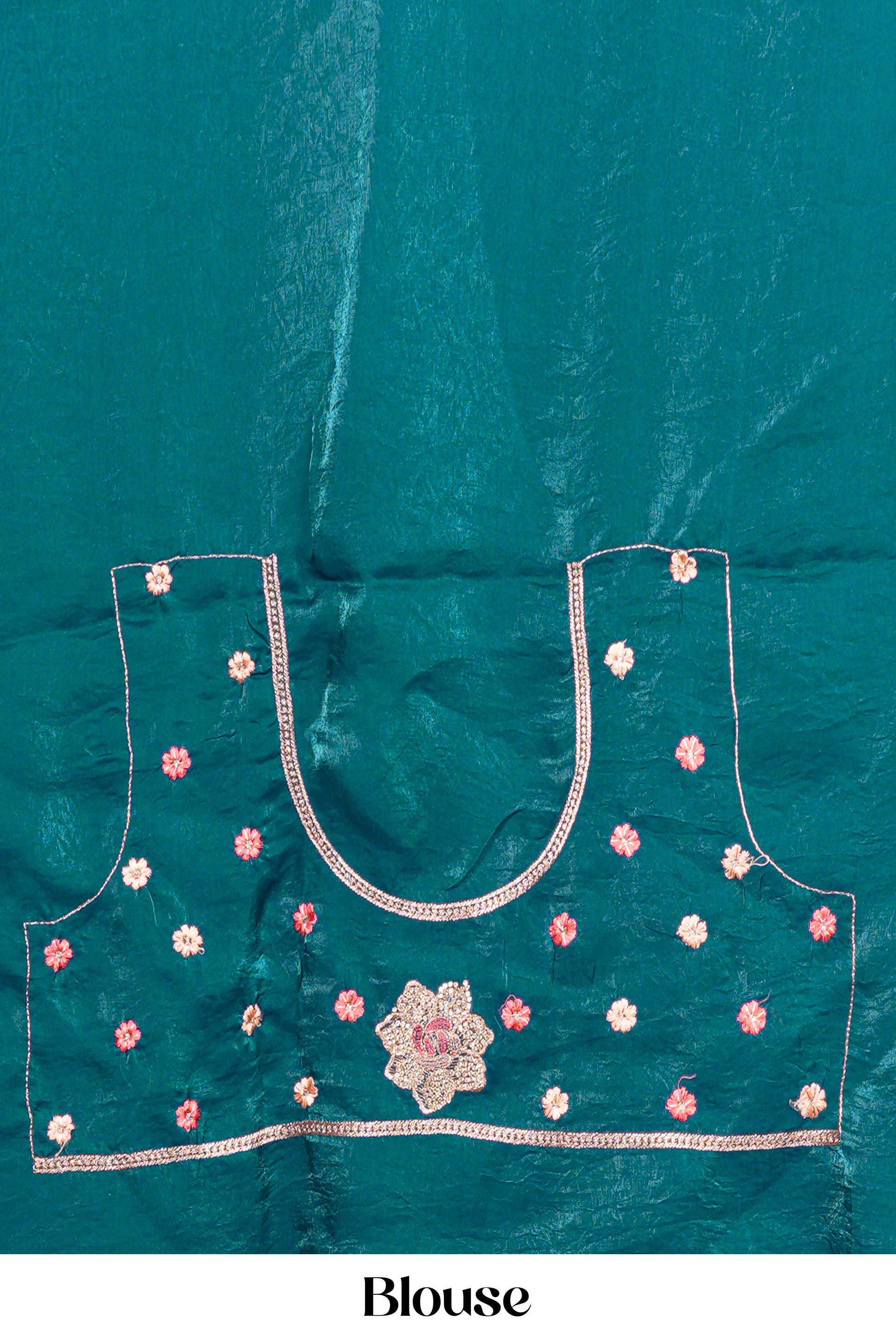 Peacock Green Fendi Satin saree Detailing Gold Zari Embroidery With Zarkan Diamond Along With Stone Embroidery Blouse