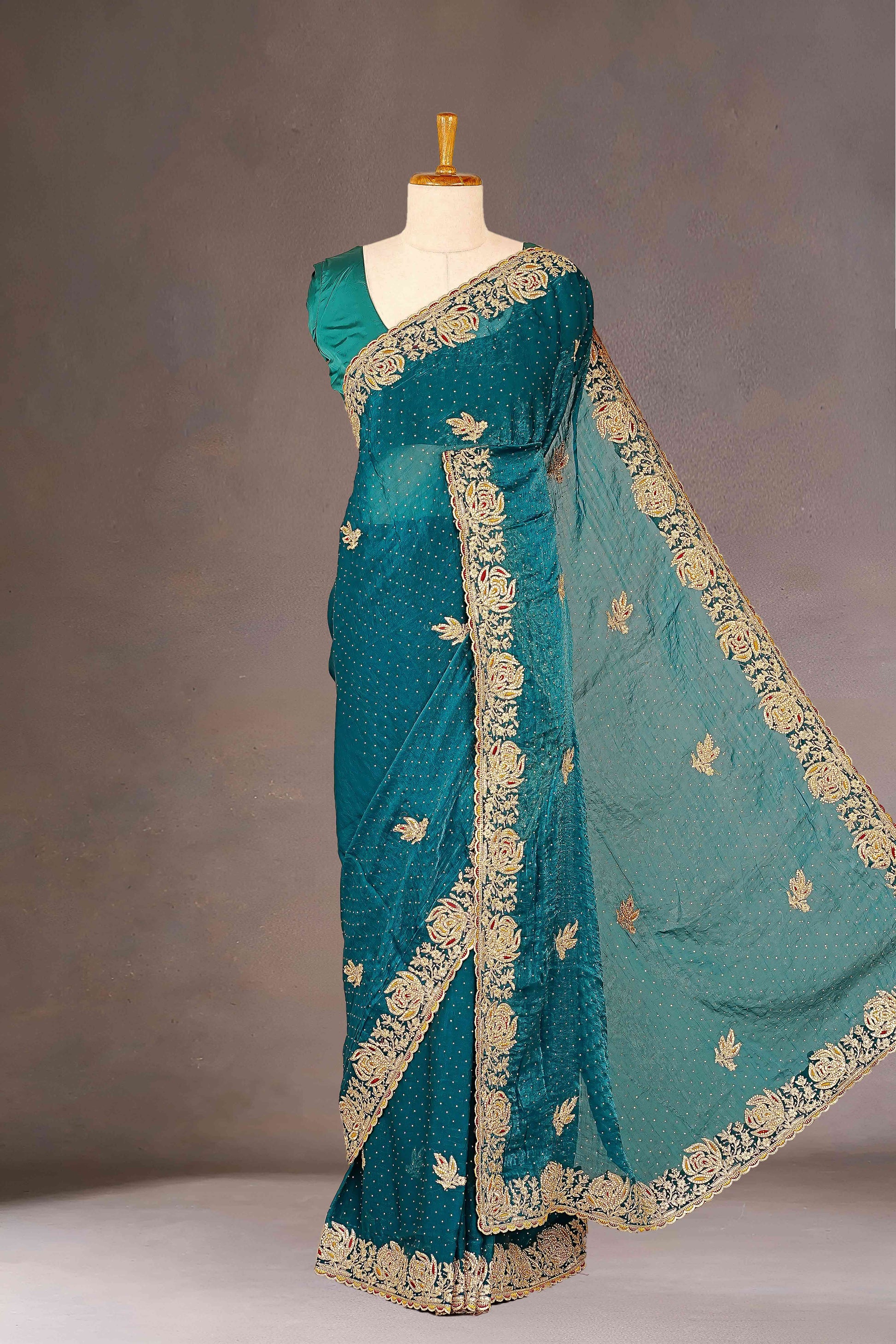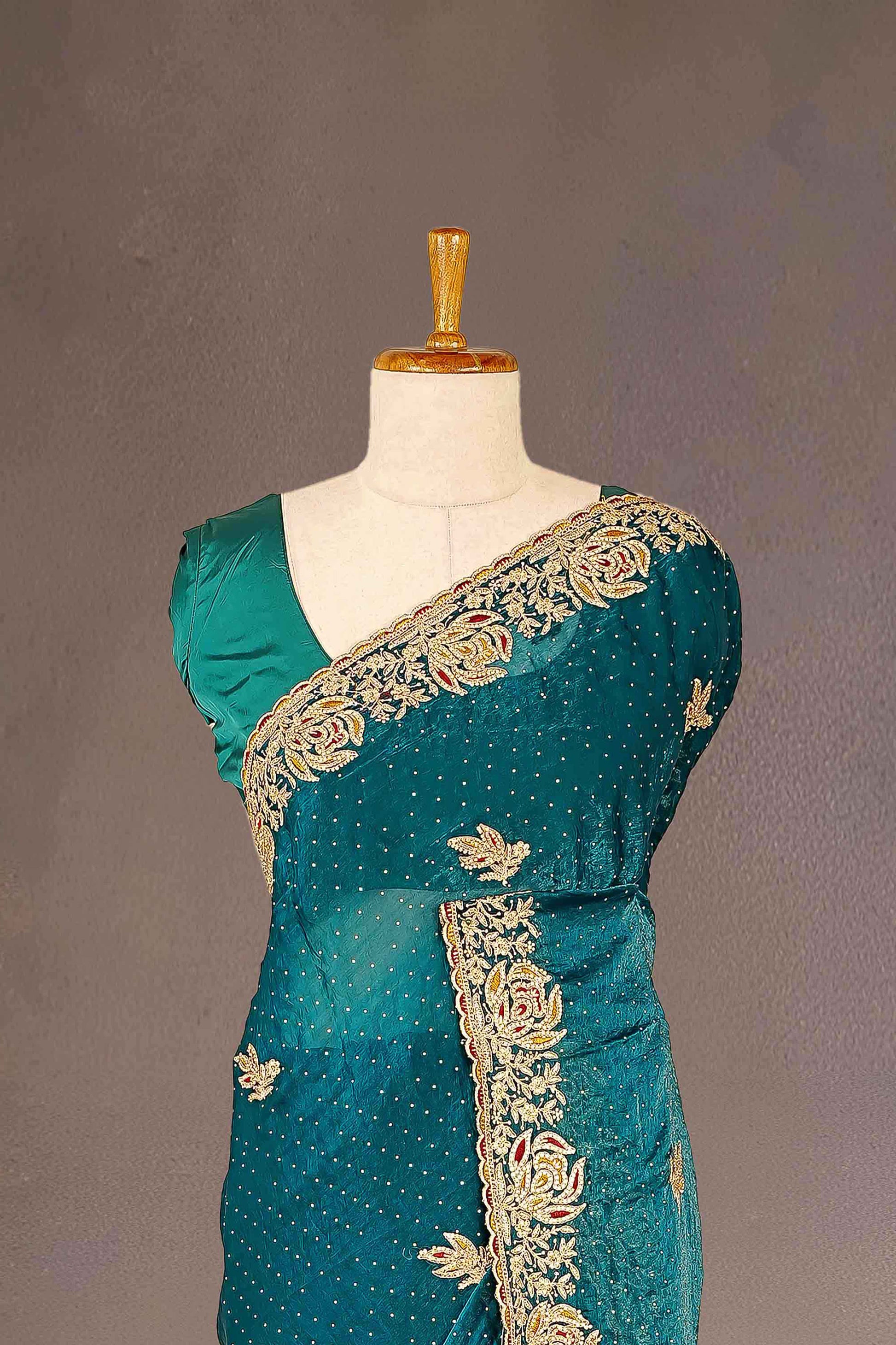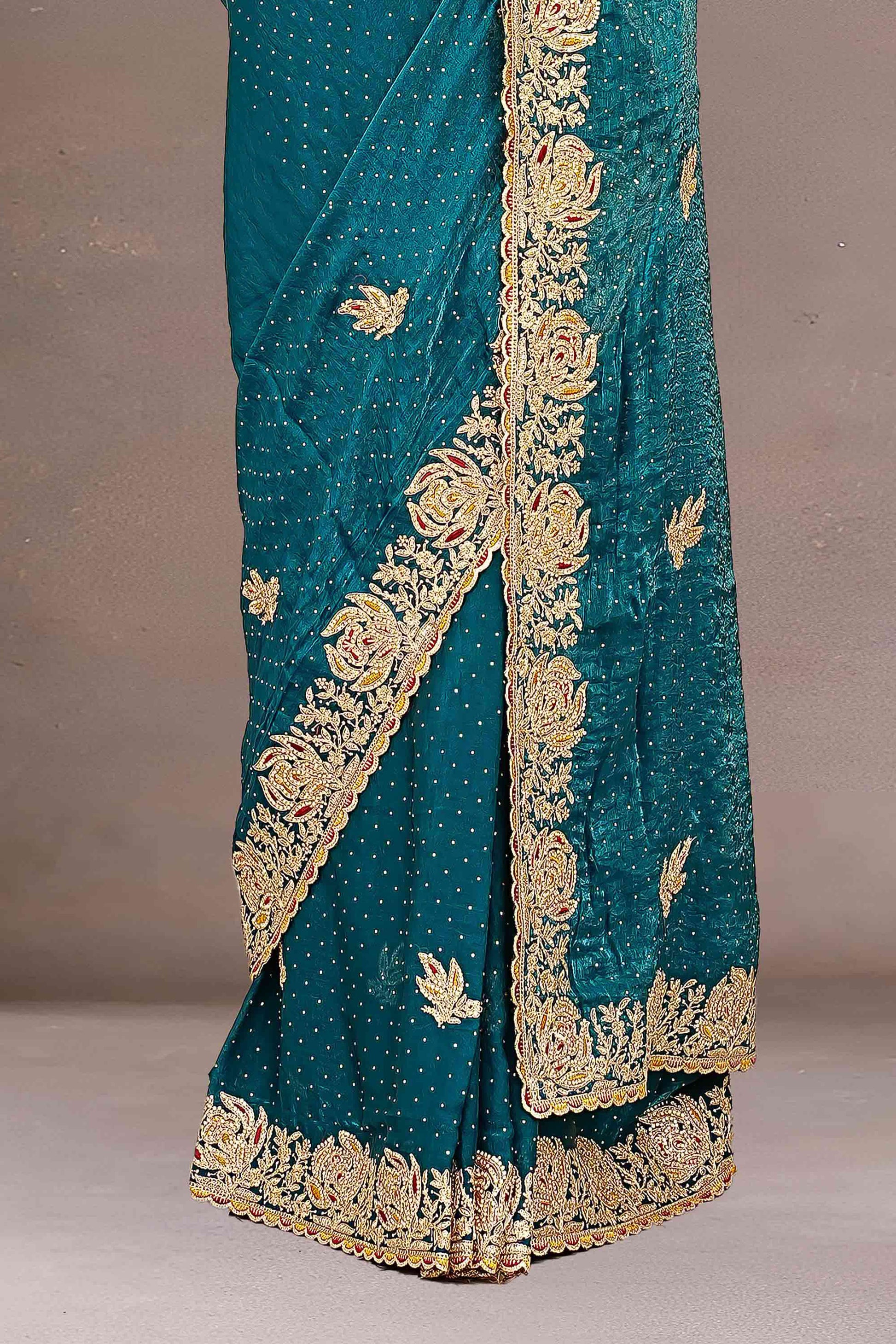 Fendi Satin Gold Zari Embroidery With Zarkan Diamond Saree