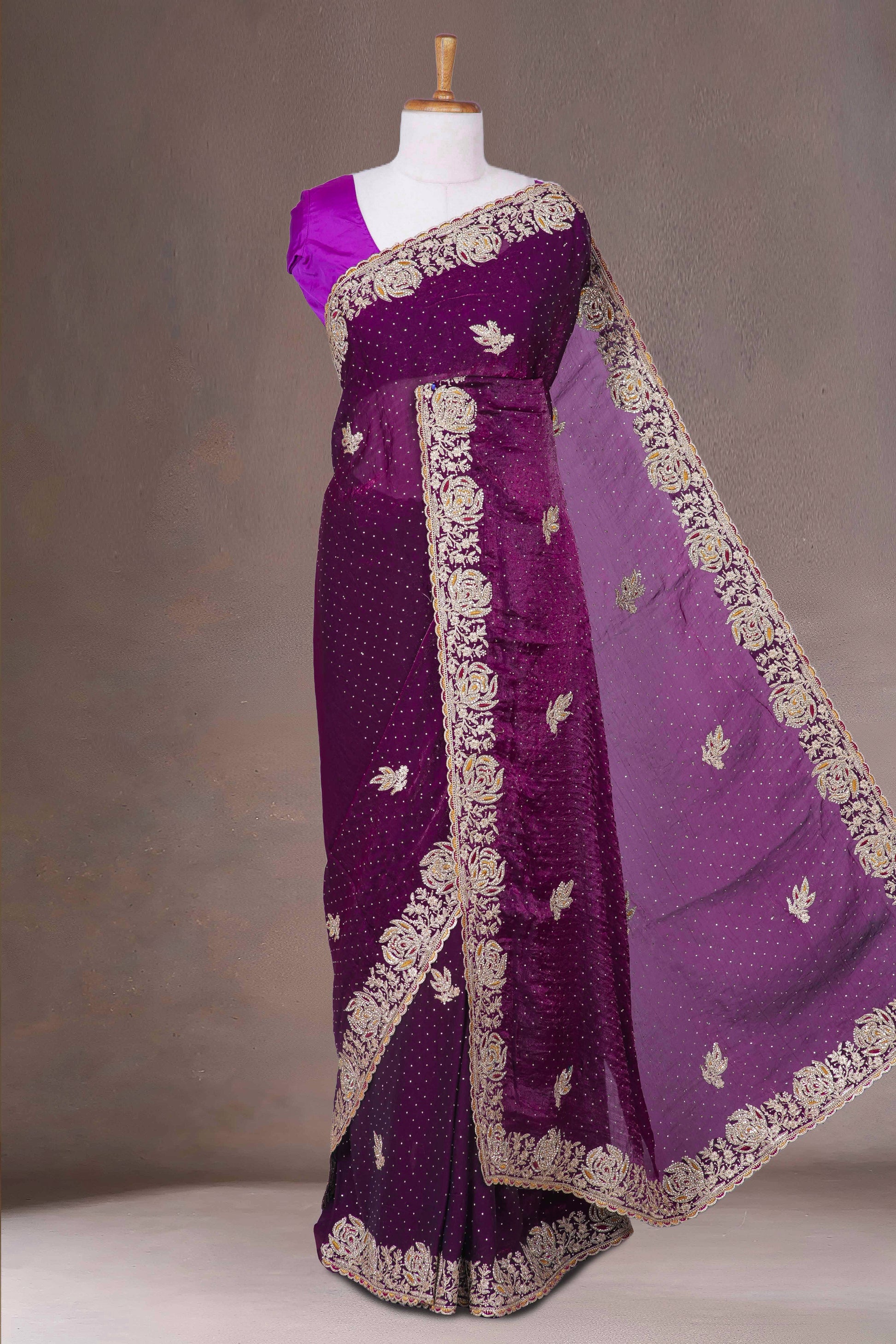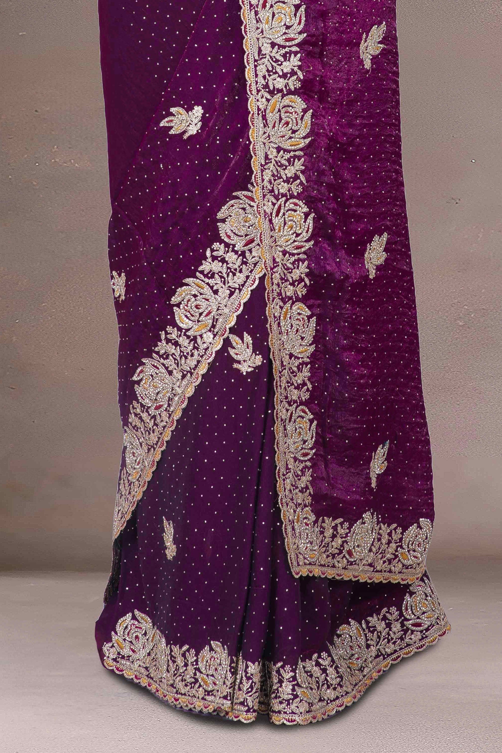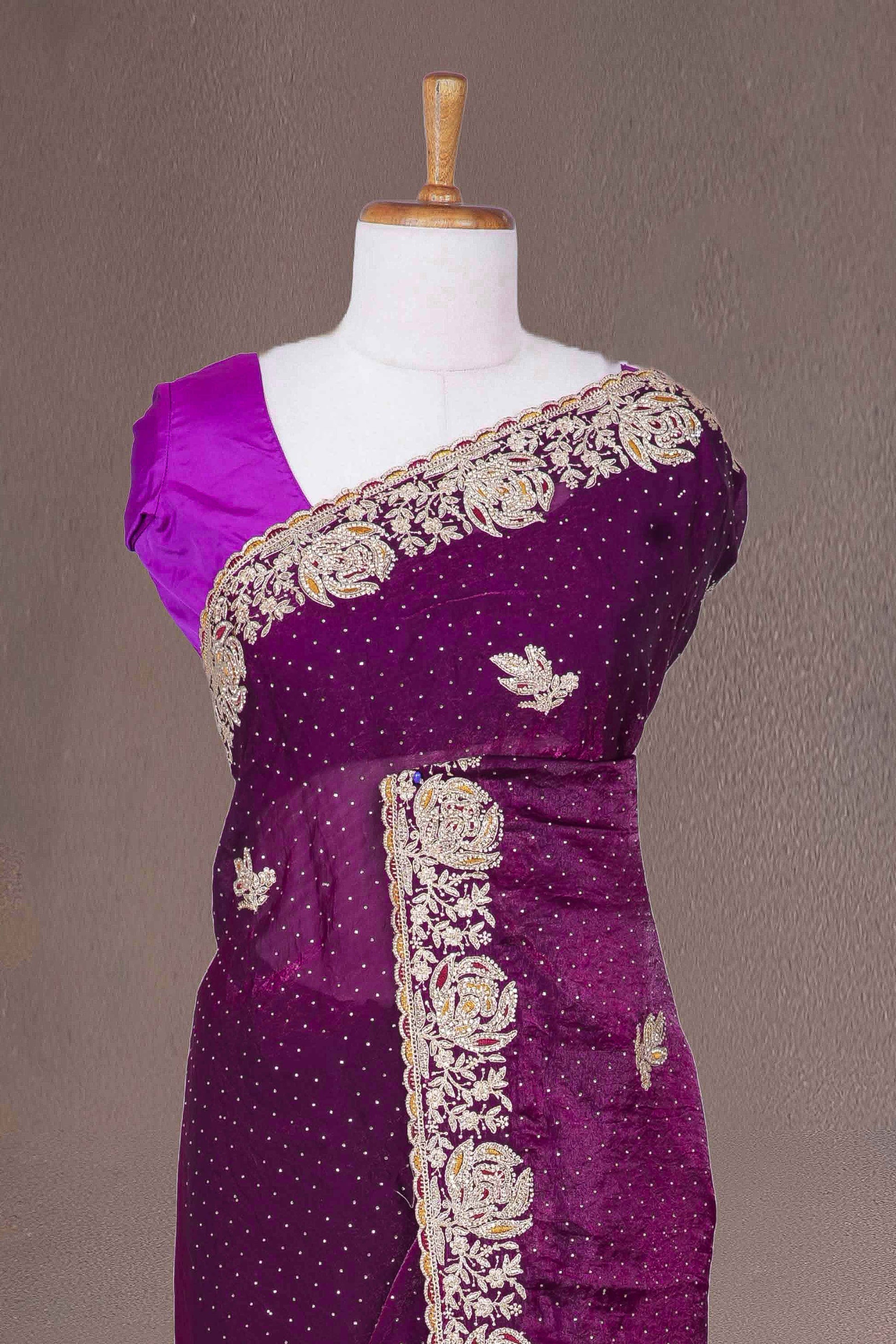 Fendi Satin Gold Zari Embroidery With Zarkan Diamond Saree
