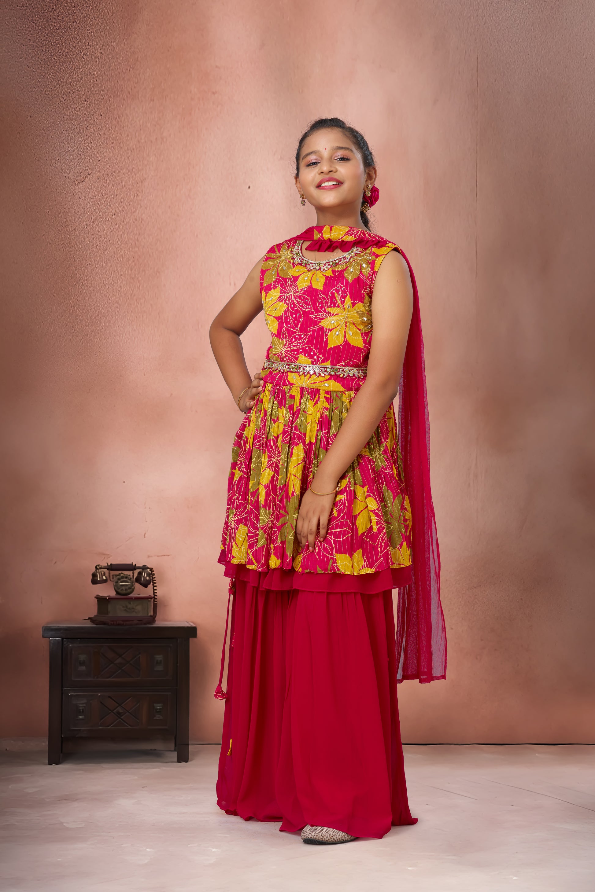 Vibrant Rani Pink Rangoli Digital Printed Top, perfectly paired with comfy plain Palazzo pants