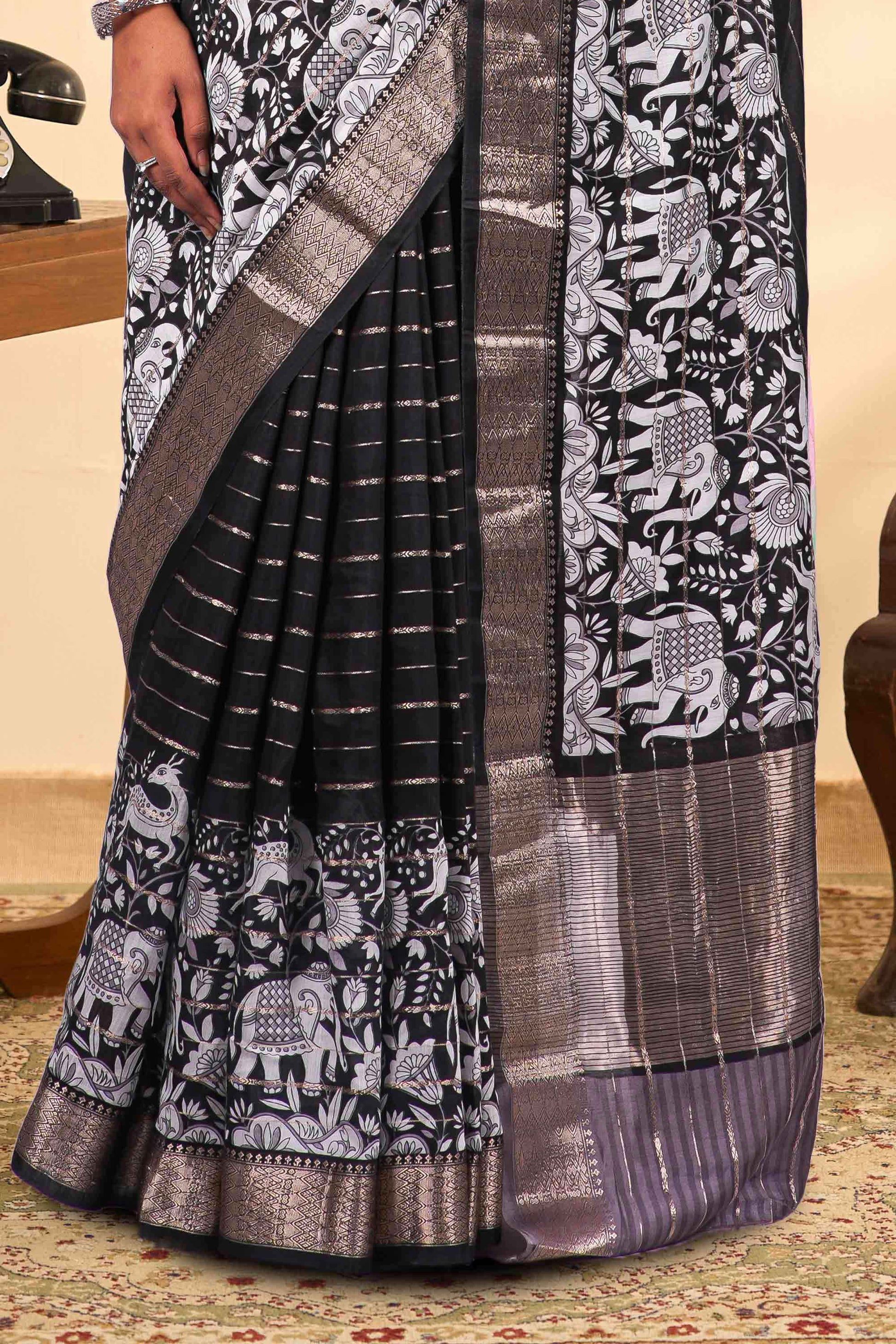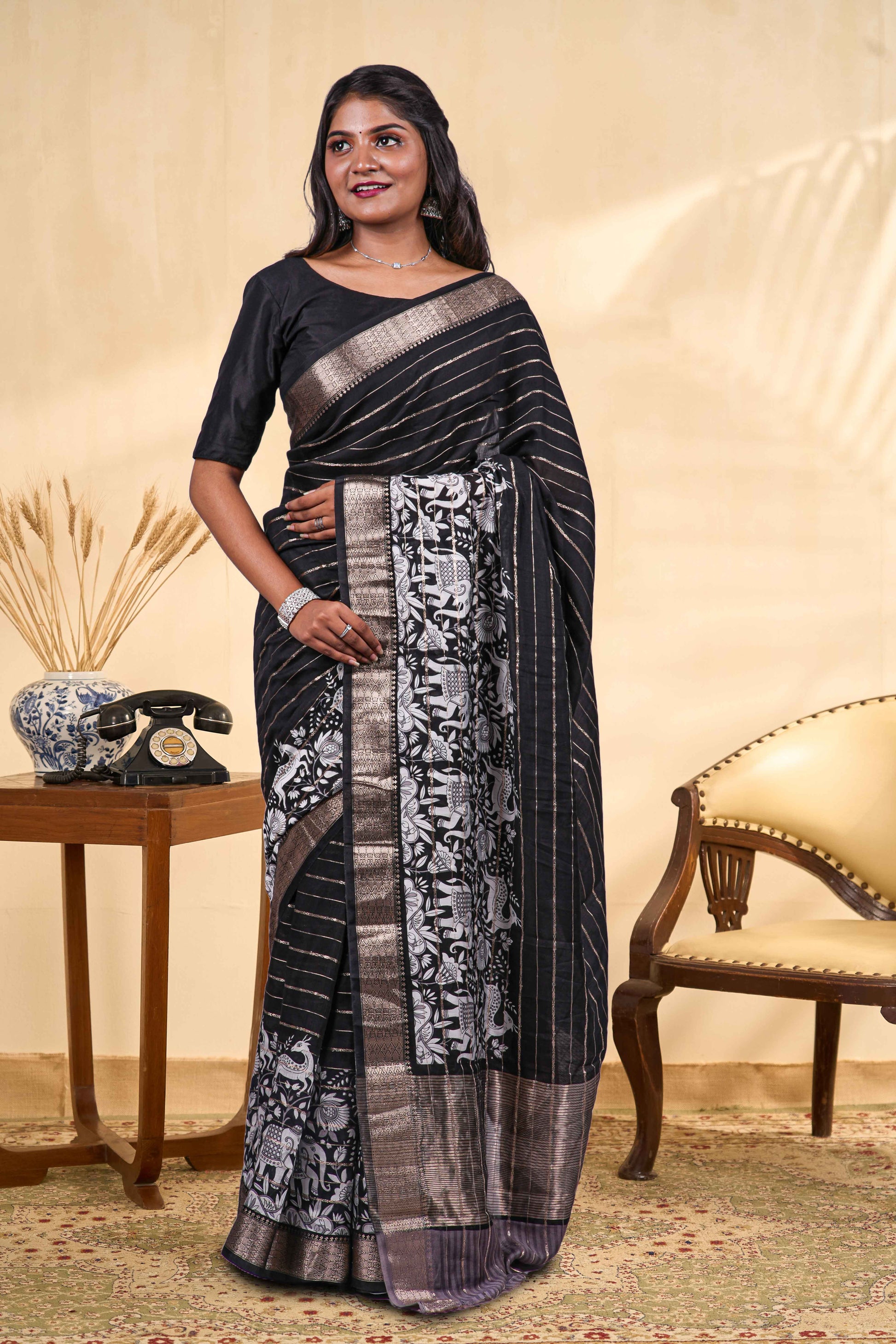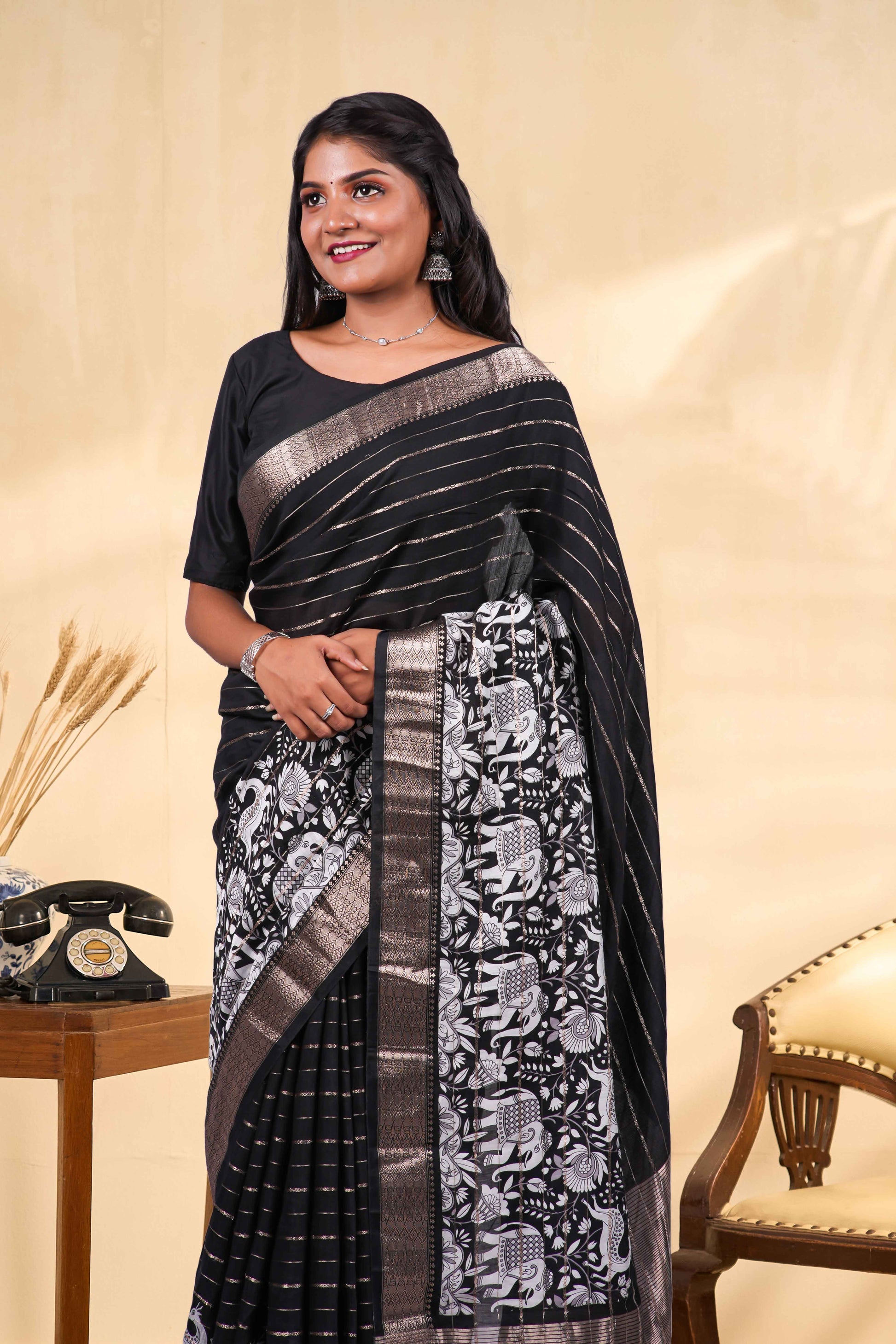 Dola Silk Classic Kalamkari prints. The saree along with the soft, lightweight, breathable fabric paired with golden zari border