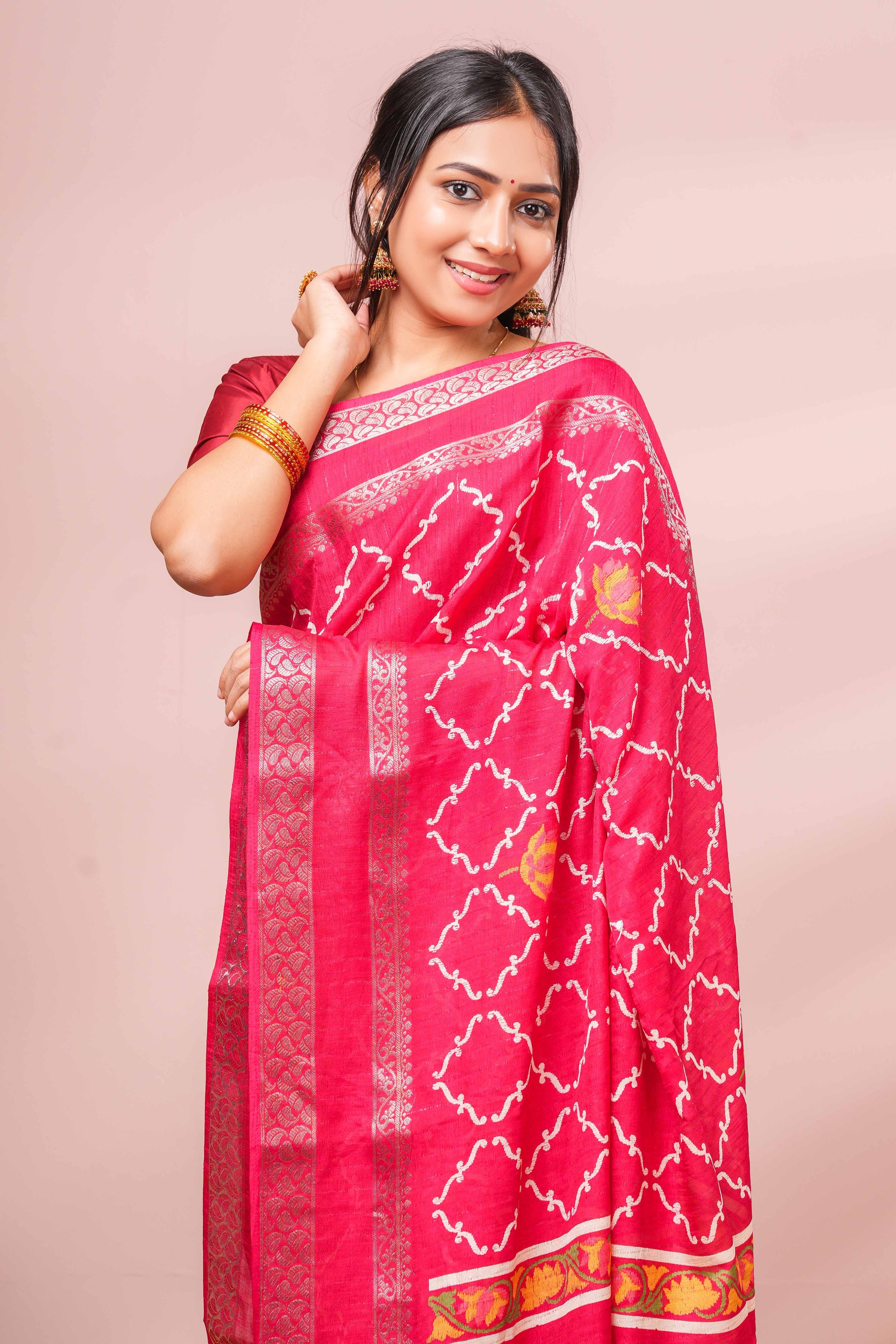 Red Dola Silk Saree Jaali Design , Yellow Lotus Motifs Across The Body With Gold Zari Bentex Border & Pichwai Design Pallu Along With Blouse