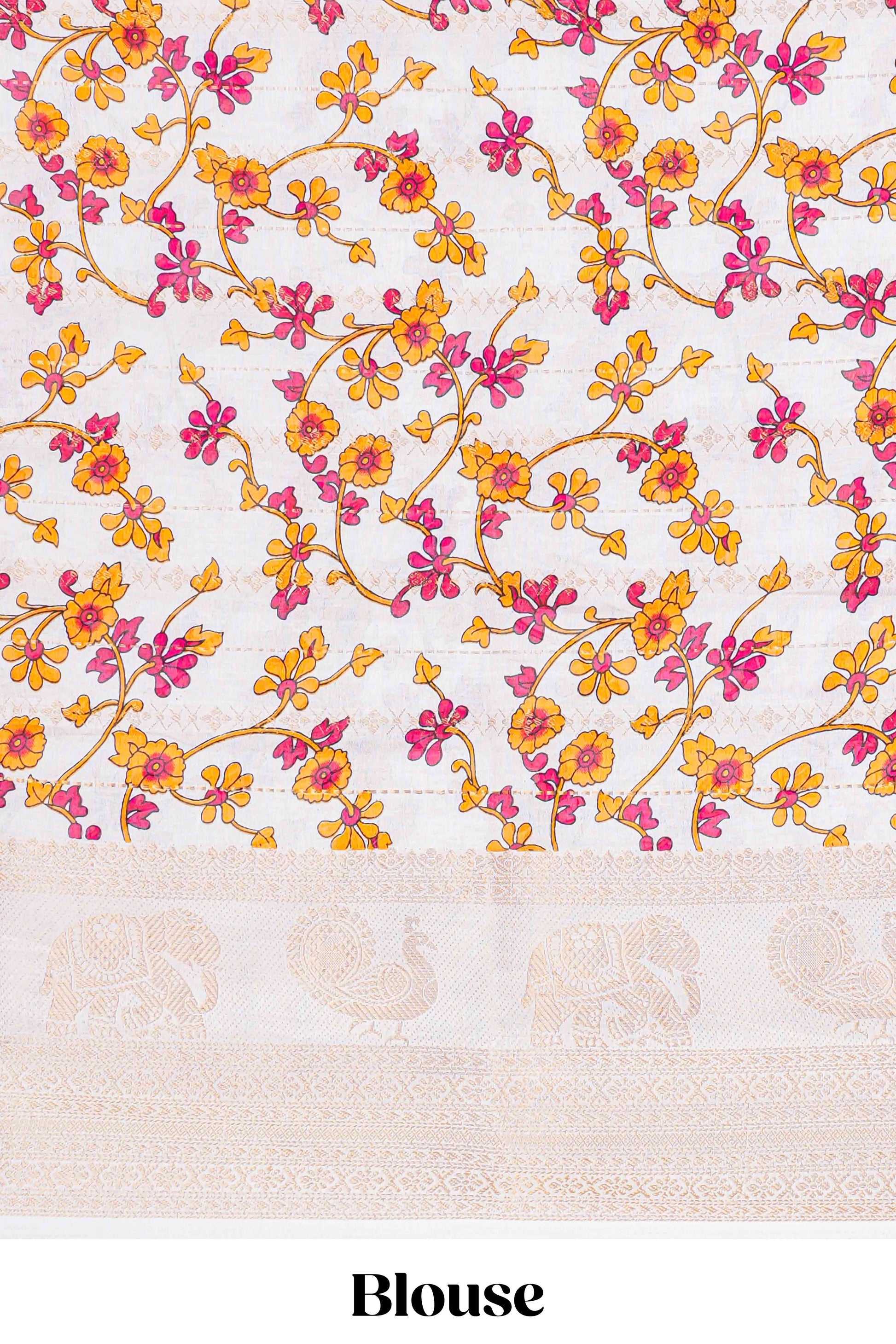 Dolo Silk Saree With tie and dye Abstract Print all Over Body with Kanchipuram Border and Rajastani Village art Pallu and Floral Print Blouse