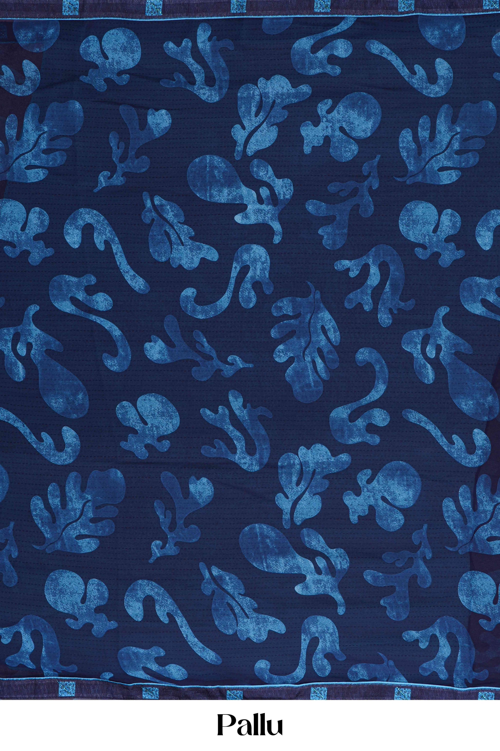 Blue Georgette Saree Botanical prints Attached Piping Border