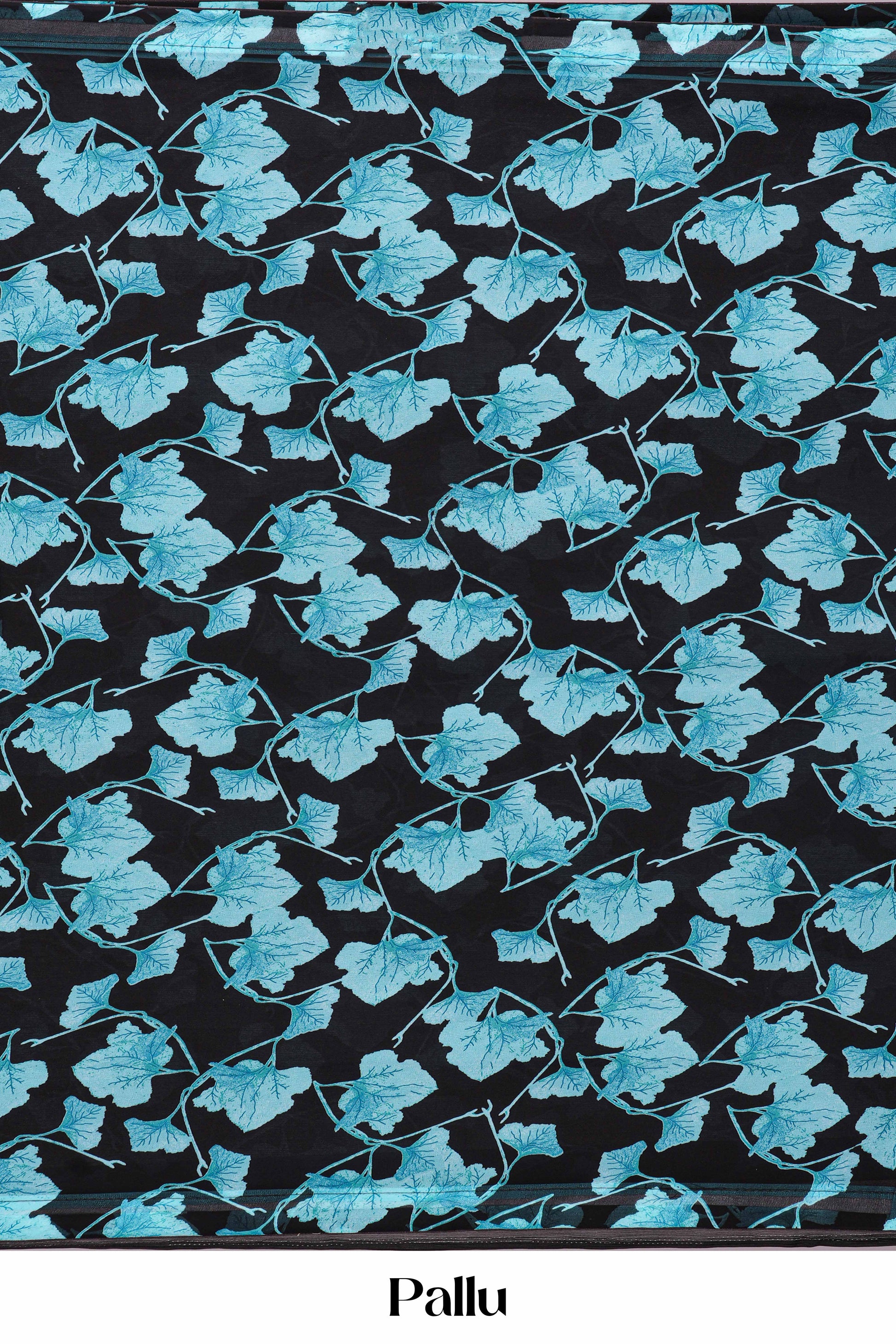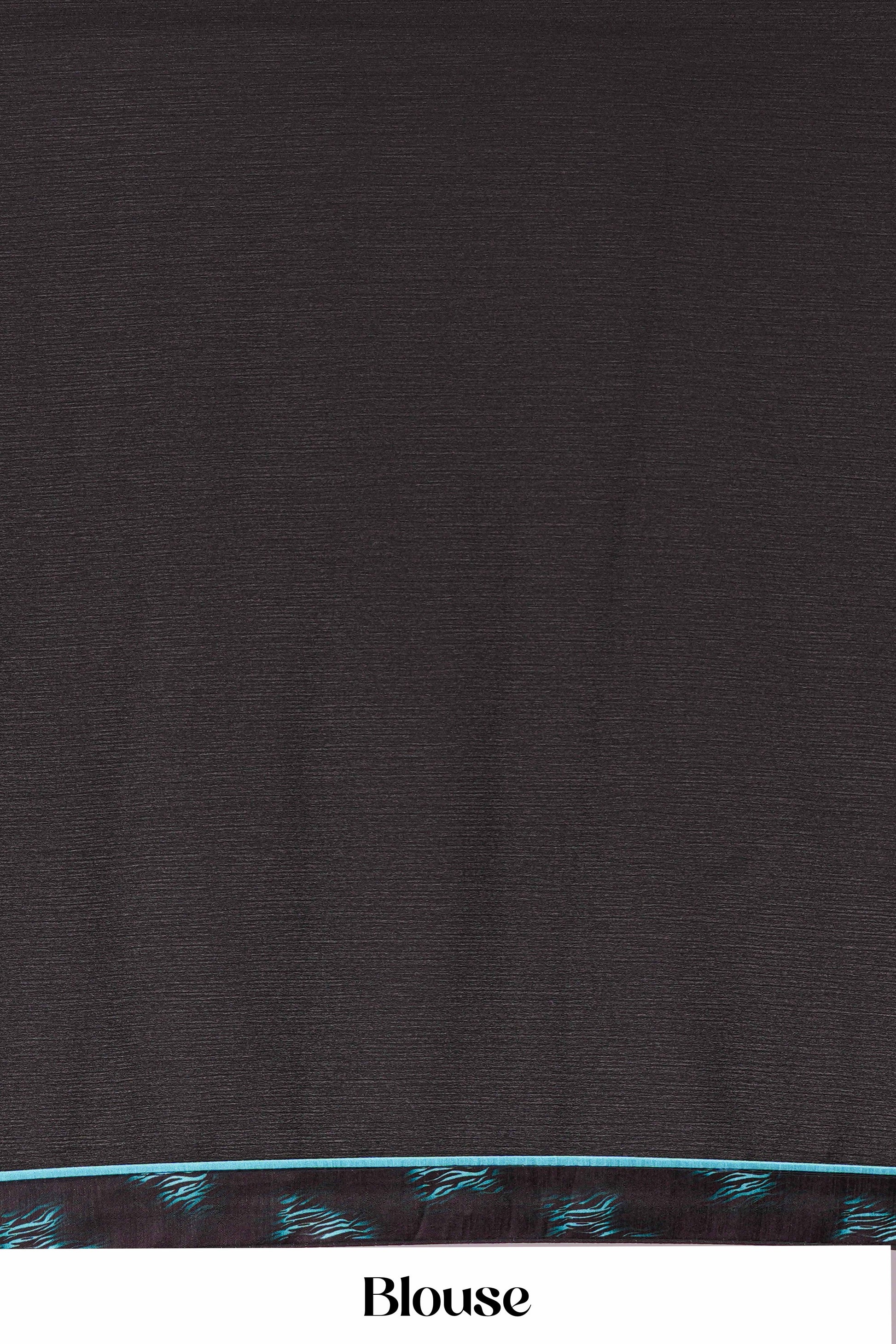 Black Georgette Saree Body Detailing Aqua Blue Floral Pattern & Black Piping Border Along With Contrast Blouse