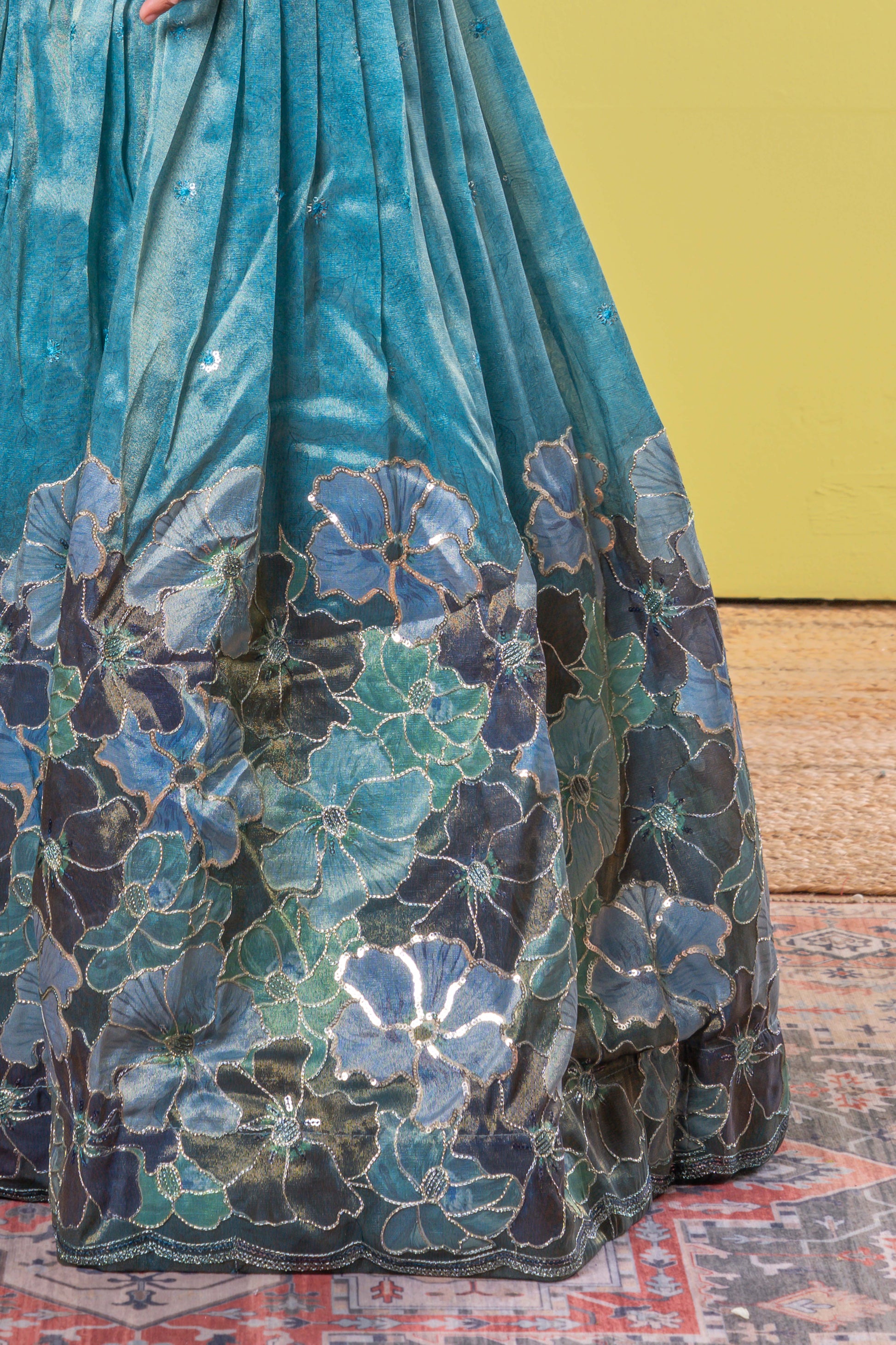 Green Girls Party Wear Gown Minimal Stone Embroidery With Flower Motifs