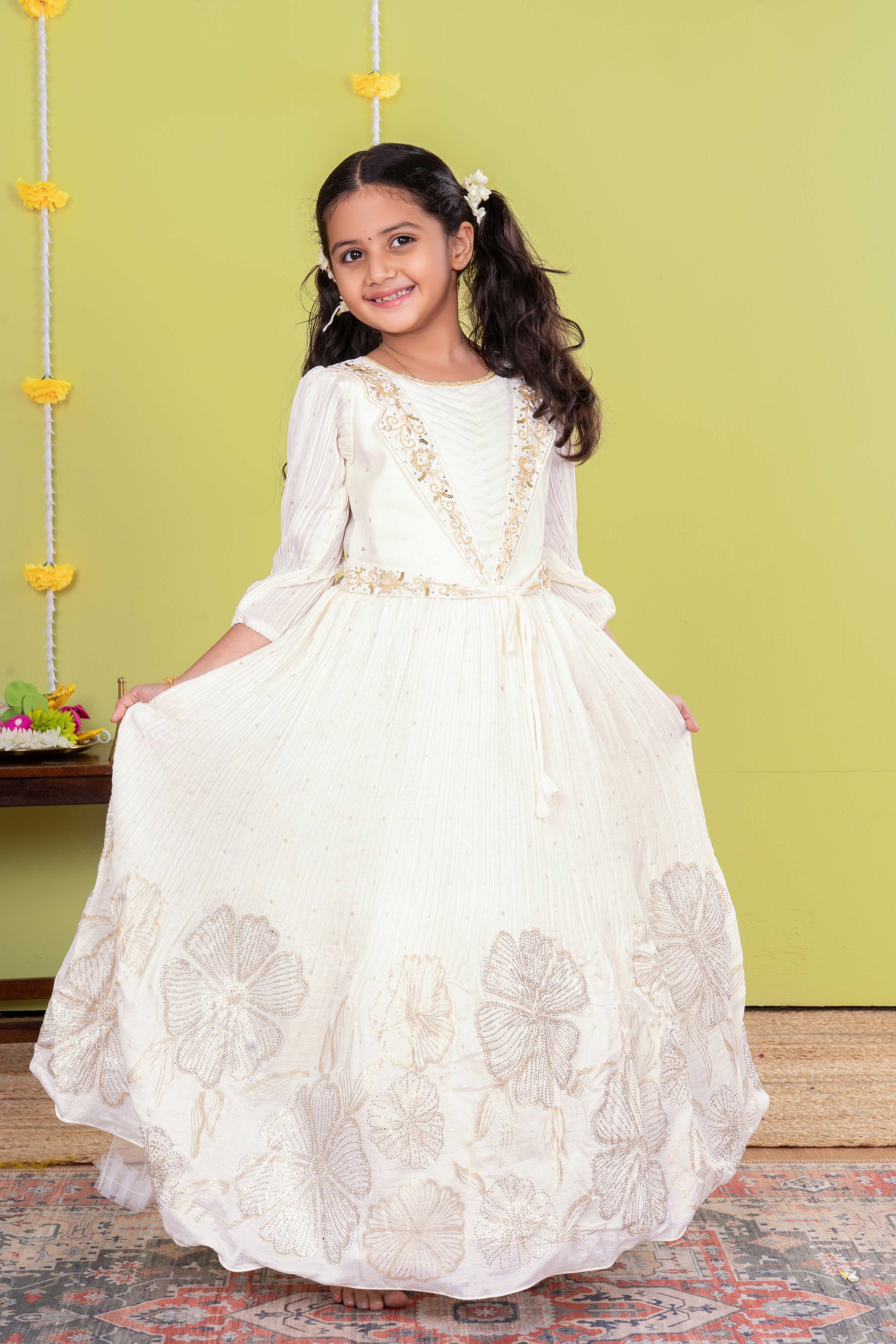 Off- White Girl's Traditional Gown Detailing Deep V pattern Adorned With Golden Thread Embroidery And Sequins. Full Length permanent pleat Flared Gown Along With Golden Flower Motifs