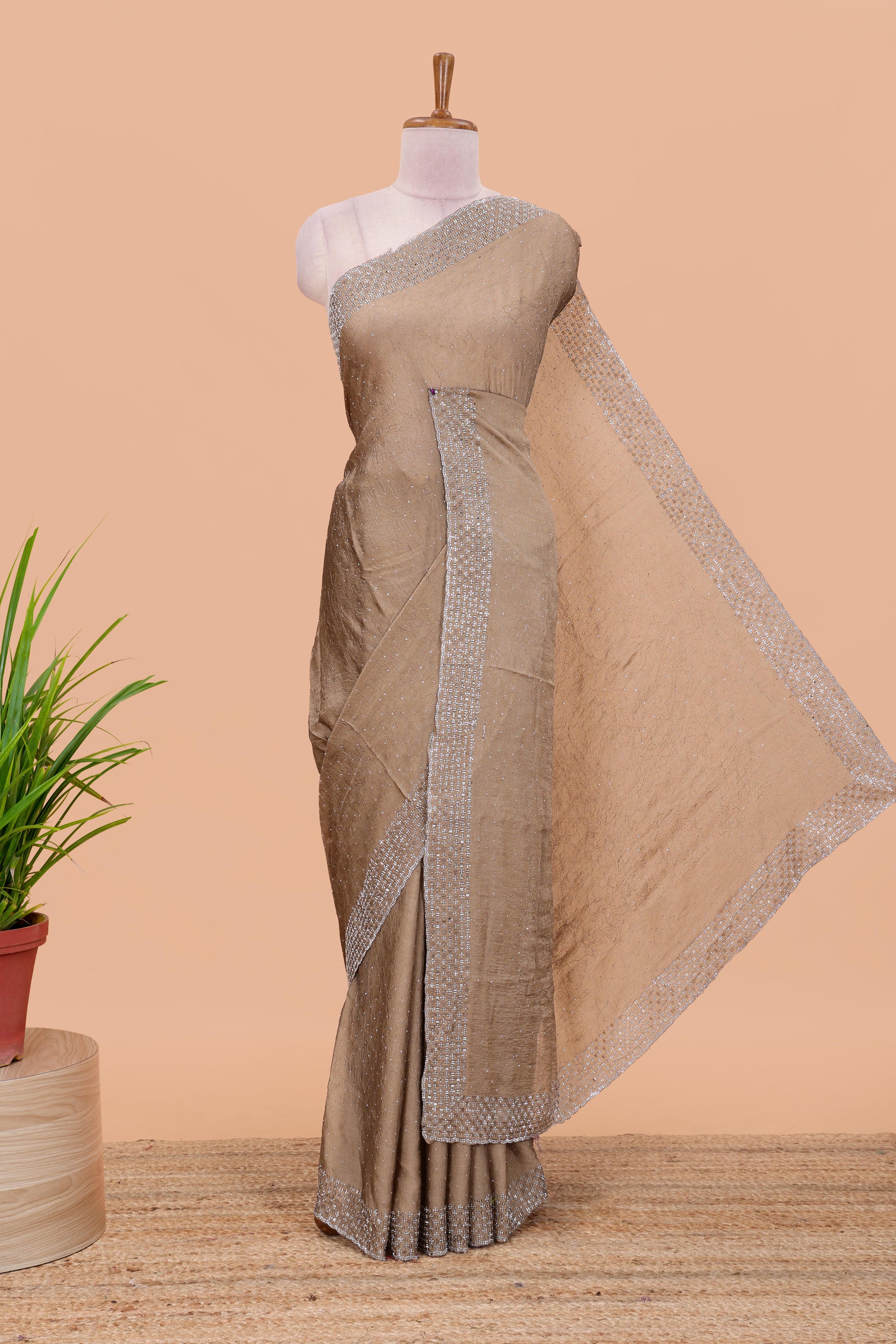 Gold chiffon georgette crush saree with all-over stone work, stone & beads border, and short stone work pallu with contrast embroidery blouse