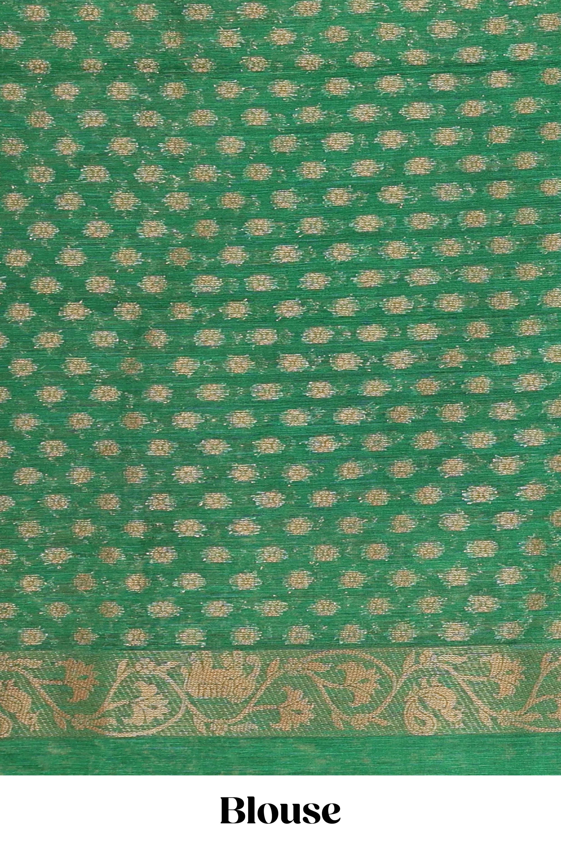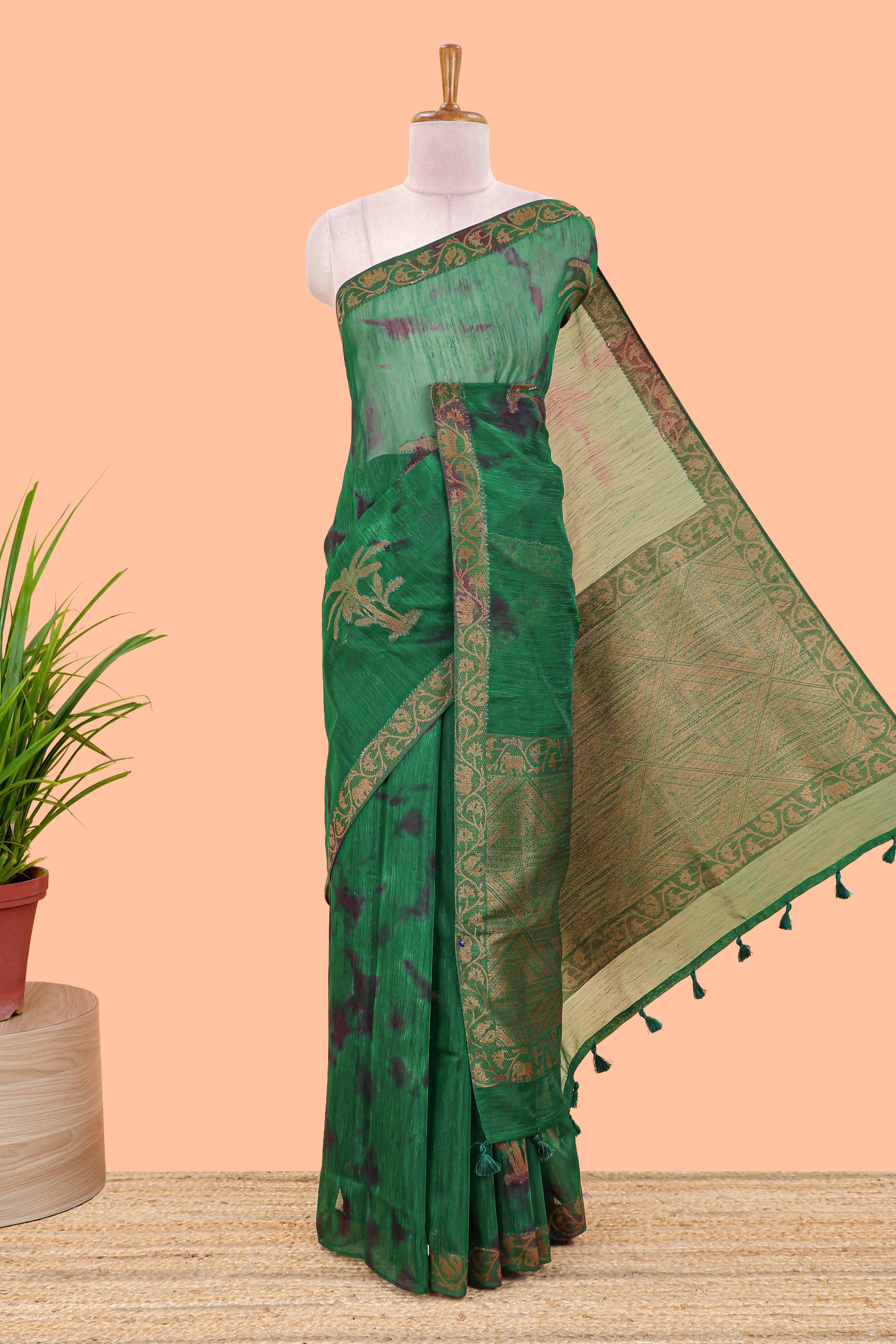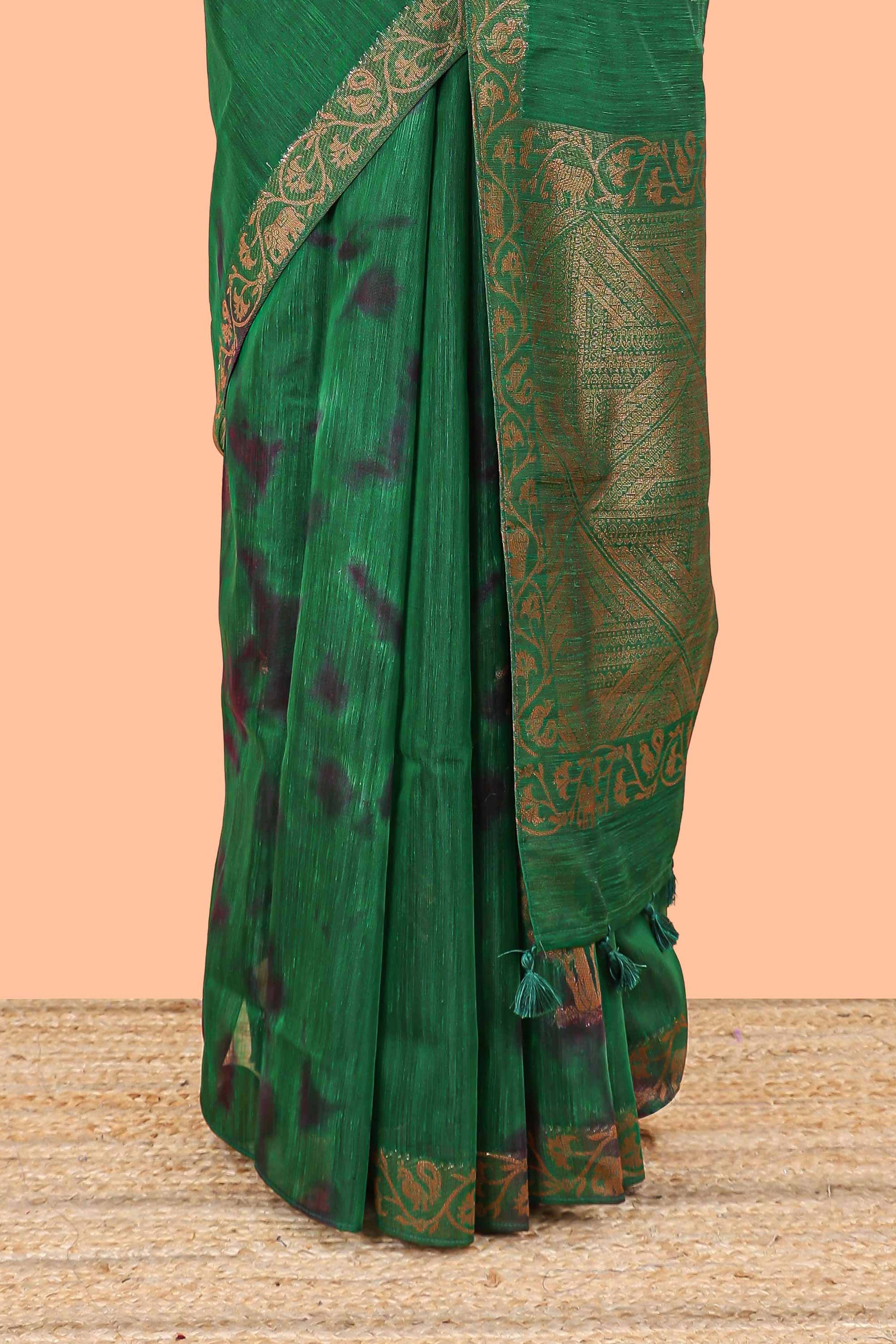 Green and black tie and dye jute cotton saree with self zari border and blouse
