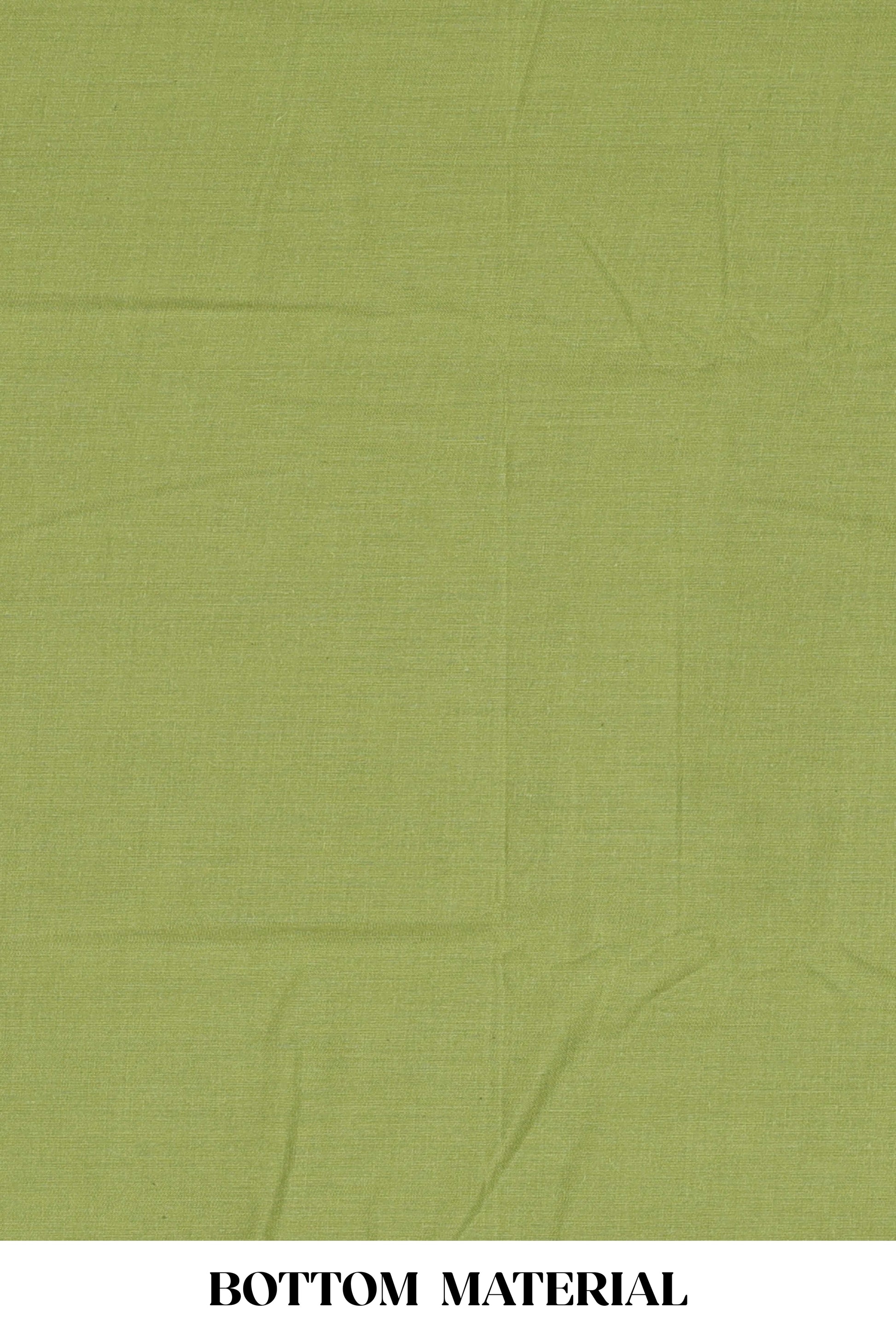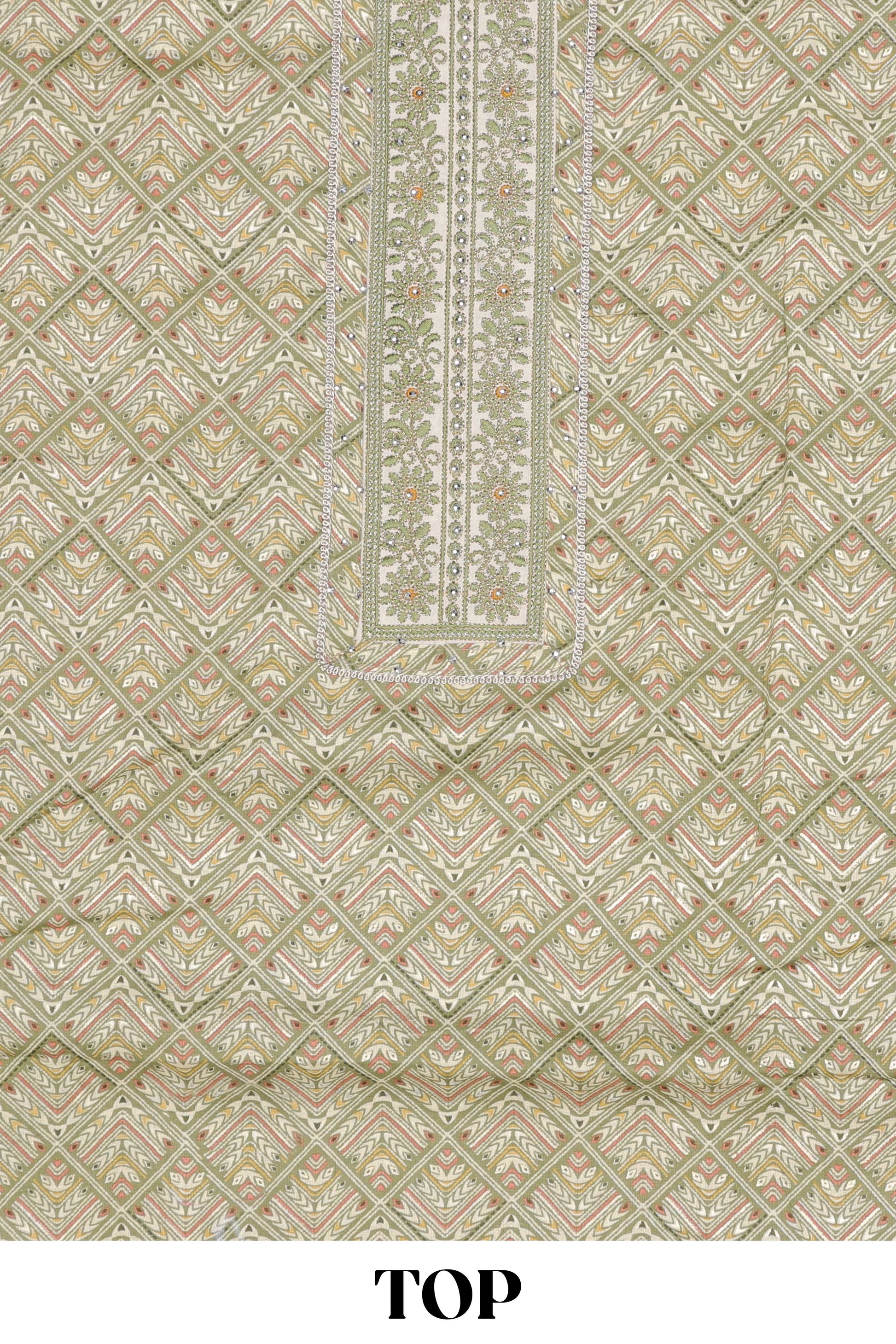 Green cotton geomentrical embroidered chudidhar material with contrast bottom and dupatta