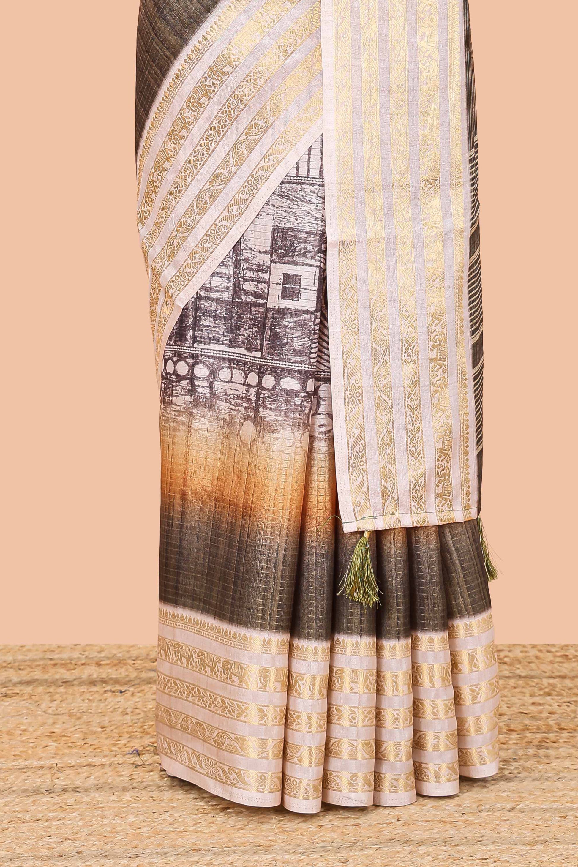 Green dola silk saree with temple architecture print, zari striped pallu and border
