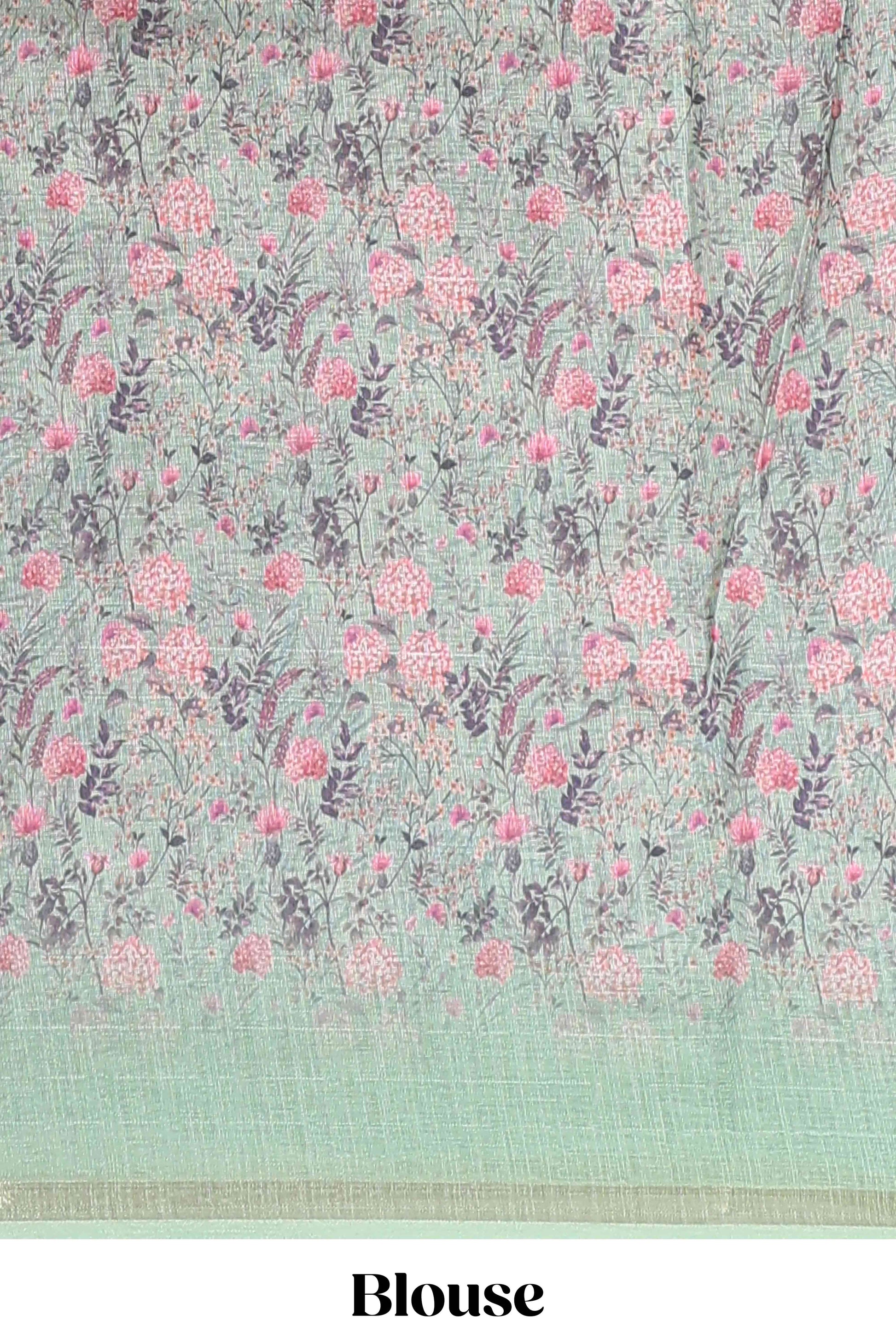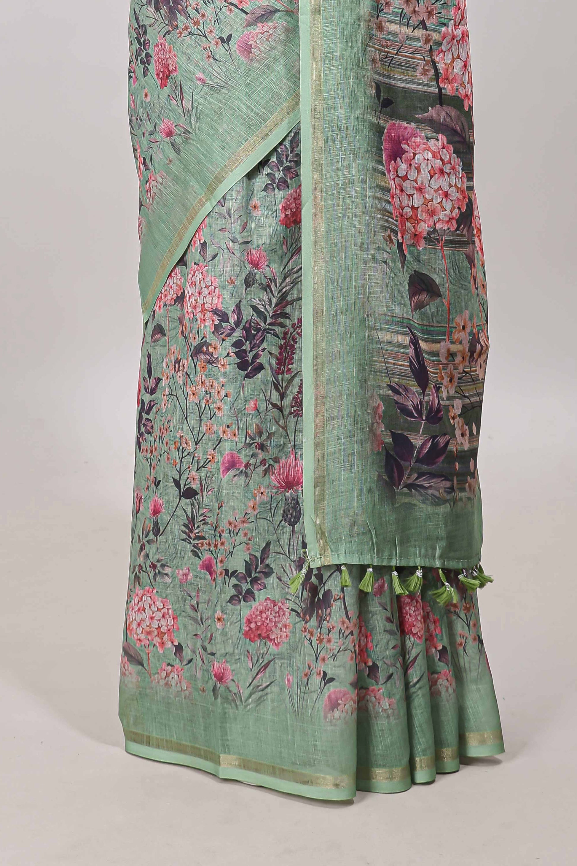 Green floral design linen cotton saree with self zari border and floral printed pallu