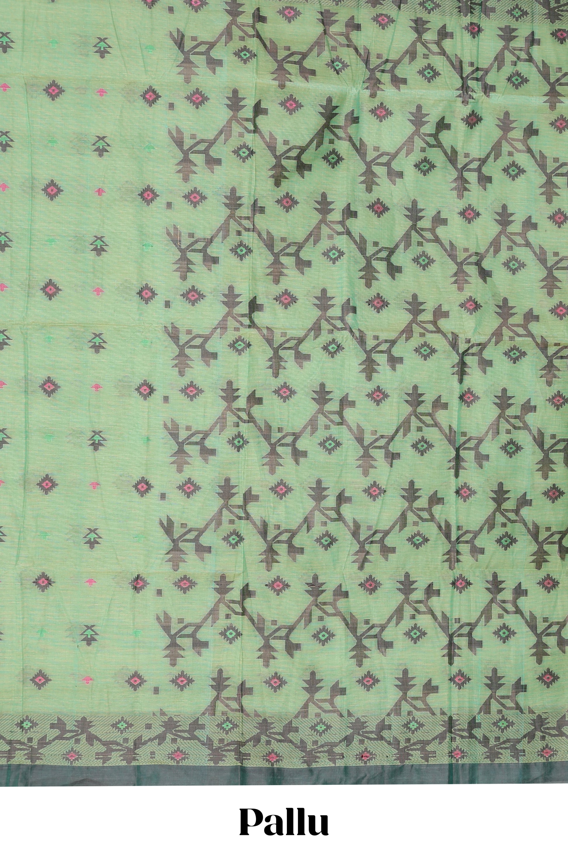 Green geometric pattern small butta bengal cotton saree with contrast border and matching pallu