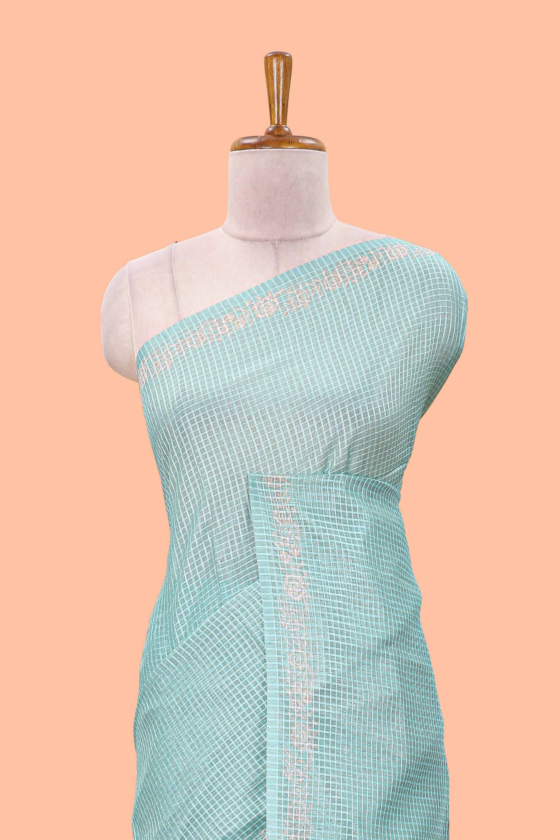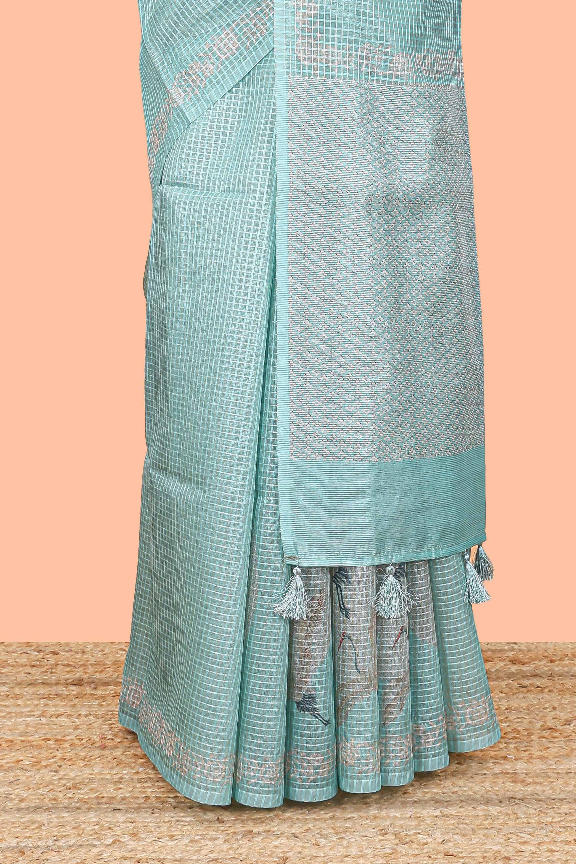 Green kota cotton saree featuring crane bird motif print and contrast pallu