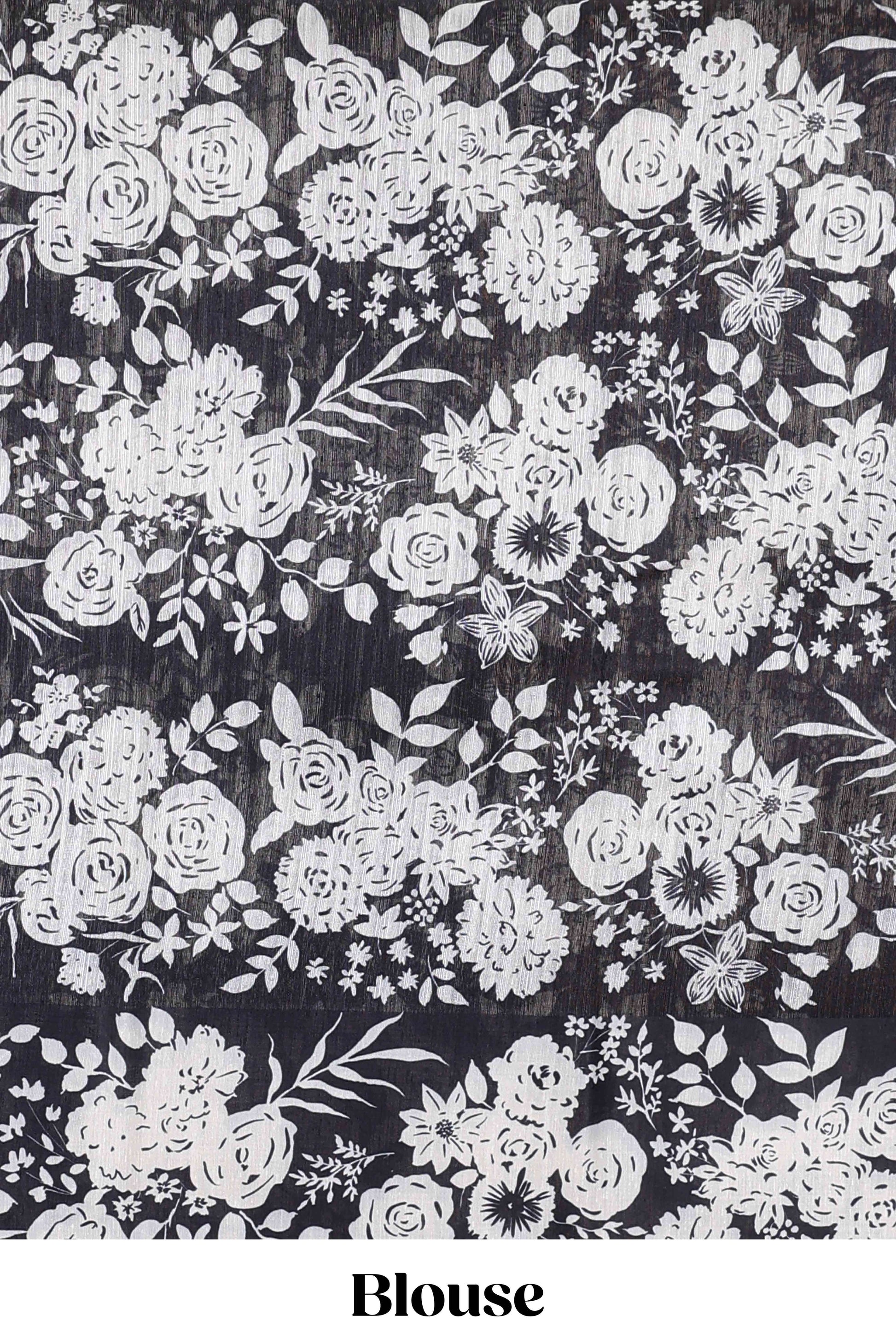 Green linen cotton saree with all-over stripe print and black satin border with floral print pallu
