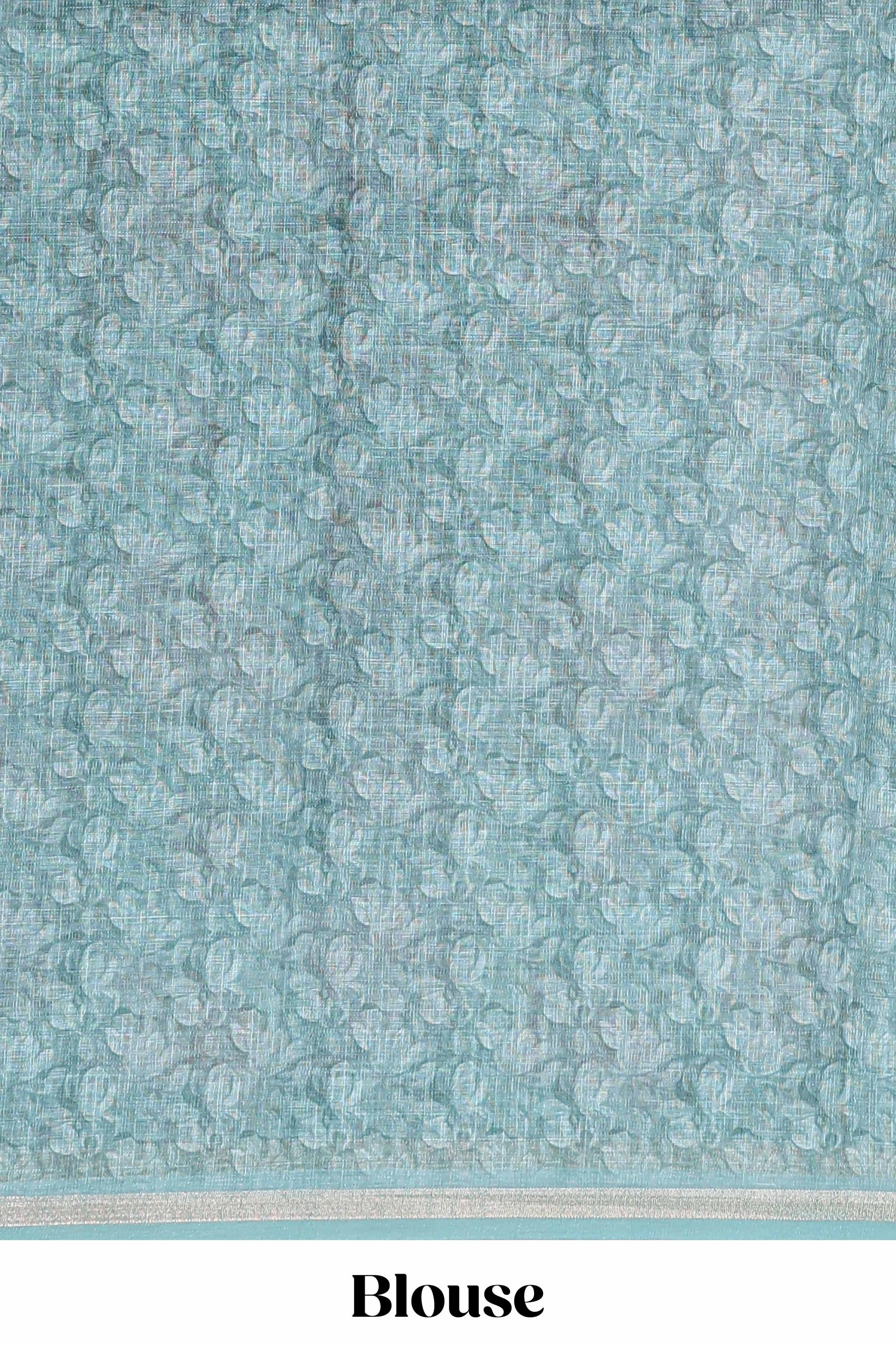 Green linen cotton saree with floral design and Ikkat motif pallu