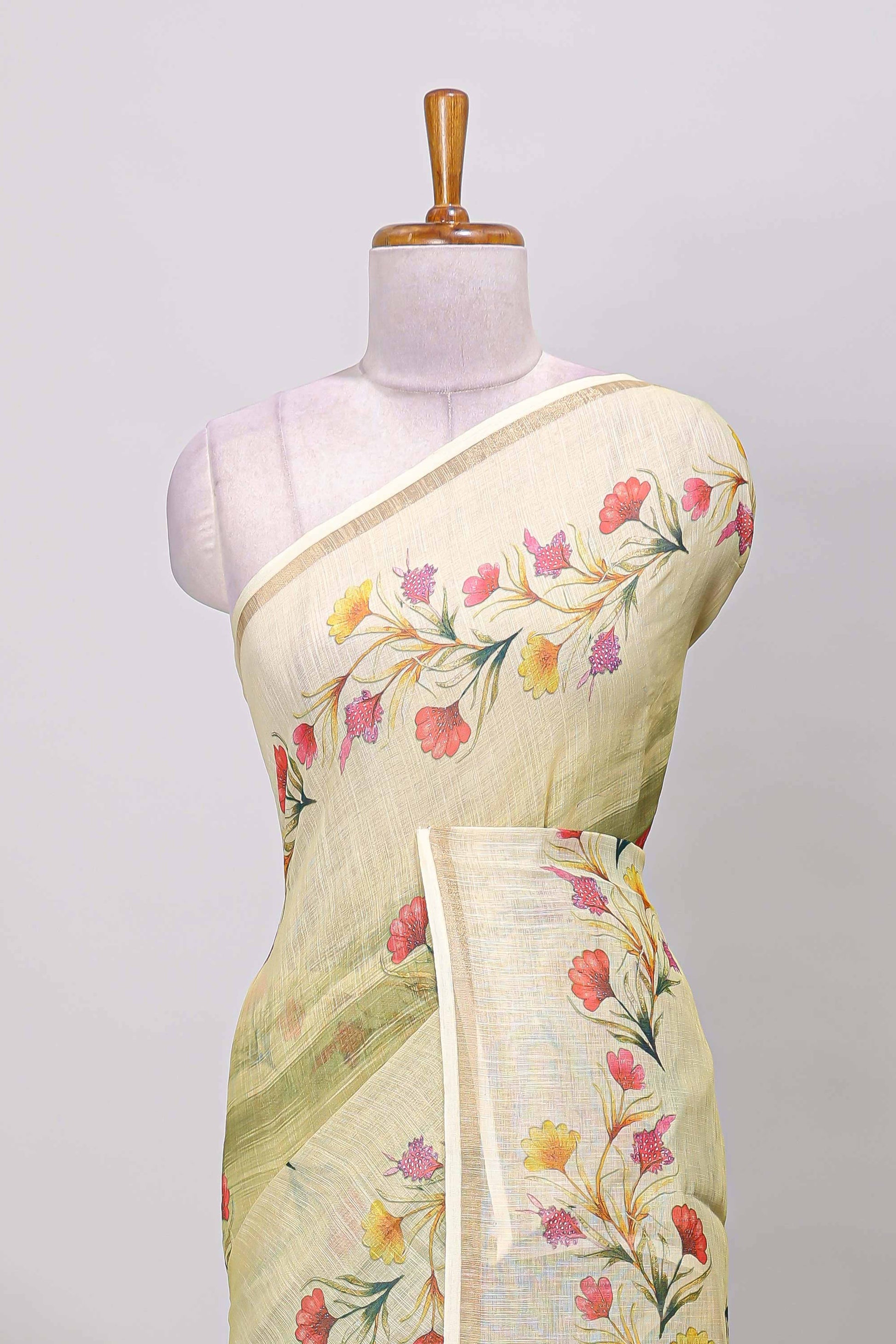 Green linen cotton saree with floral vines print, zari border and printed blouse