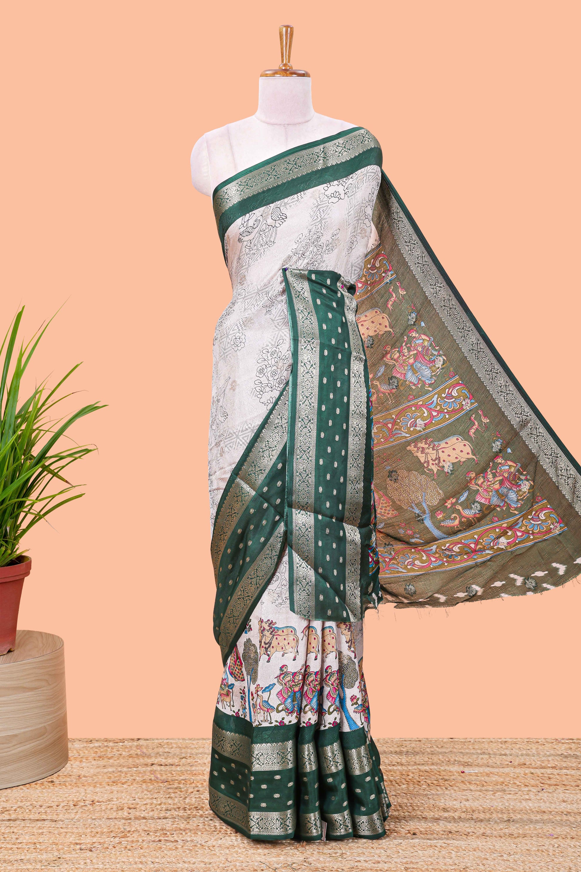 Green Mars Georgette Body Floral Print With Contrast Bentex Border Above Kalamkari Print With Kalamkari Pallu