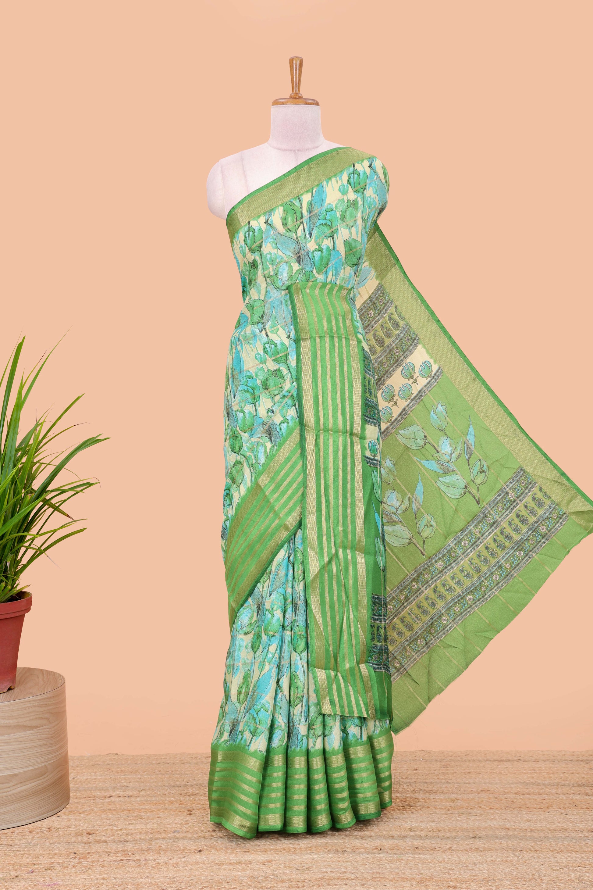 Green moss chiffon saree with striped floral print, contrast zari border and pallu