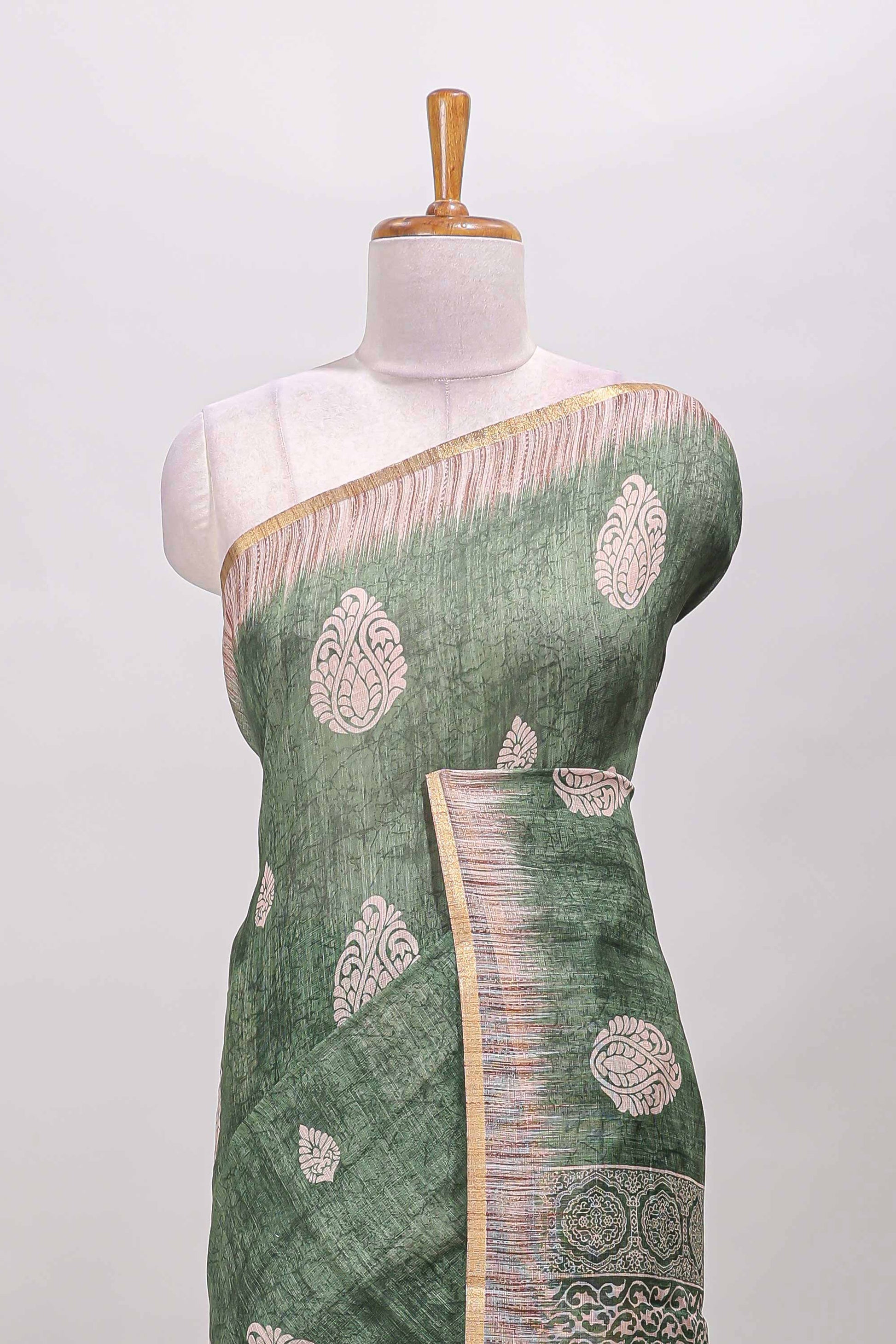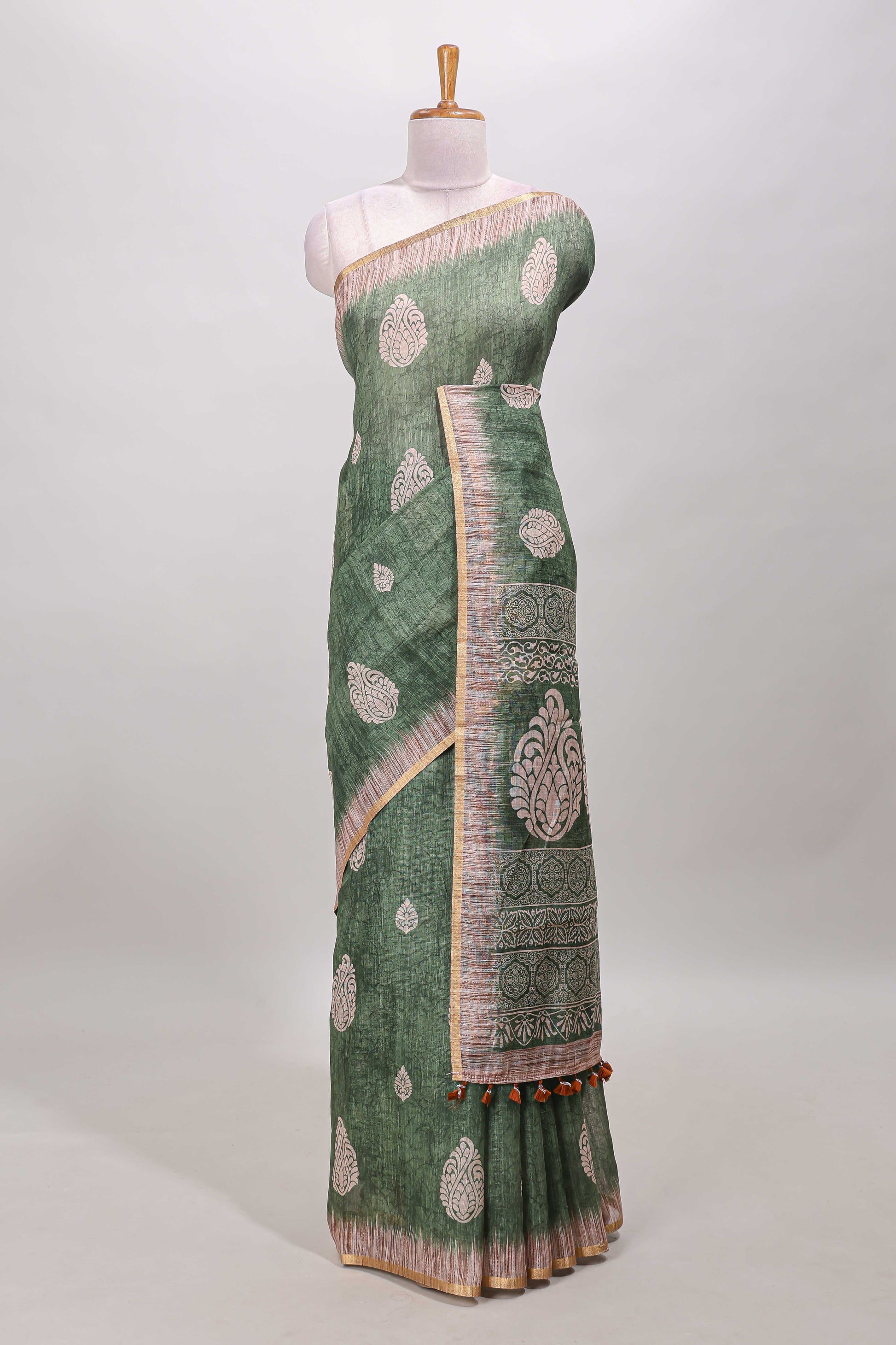 Green paisley motifs linen cotton saree with self zari border and matching blouse