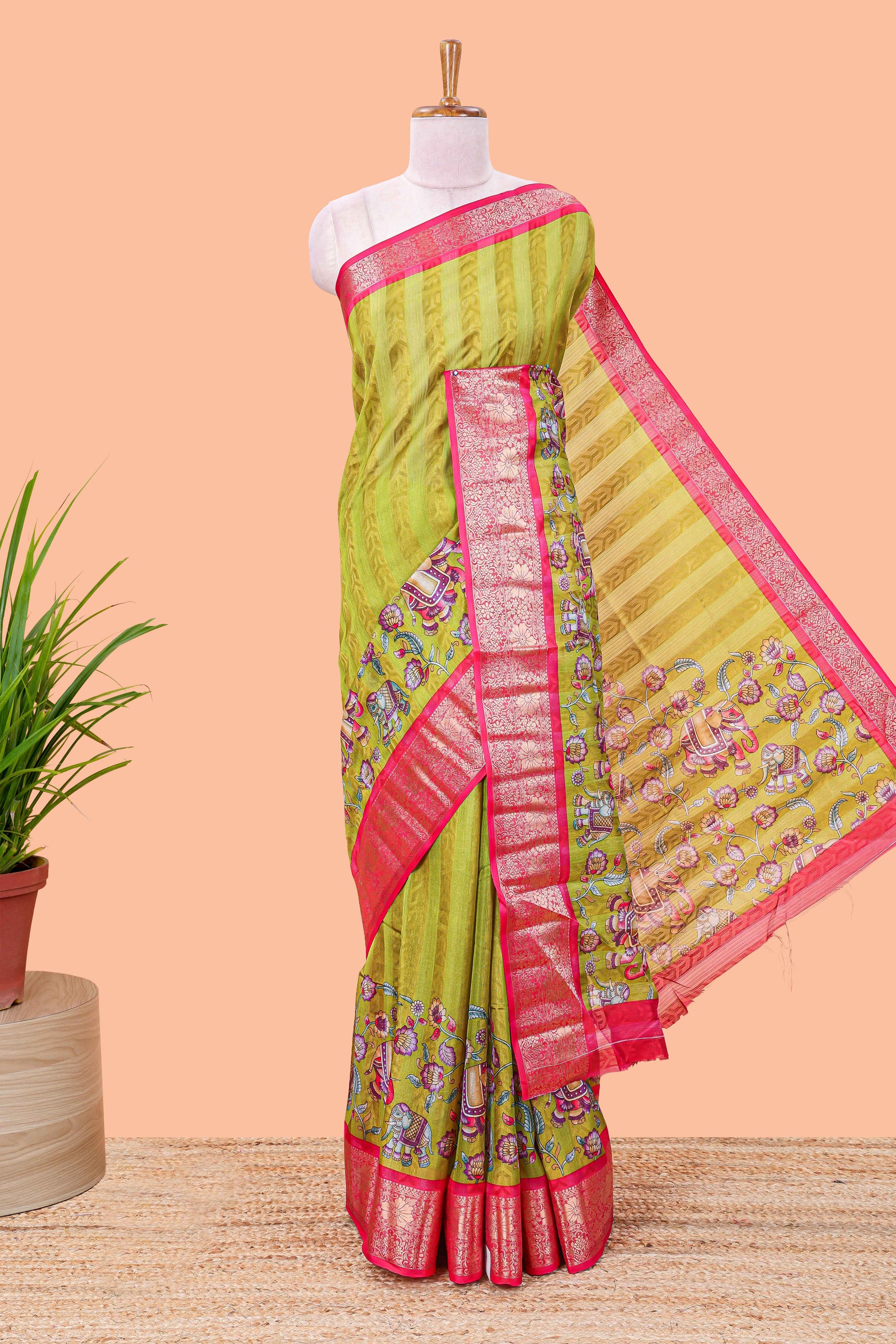 Green striped floral and elephant themed marsh georgette saree with contrast zari border and printed pallu