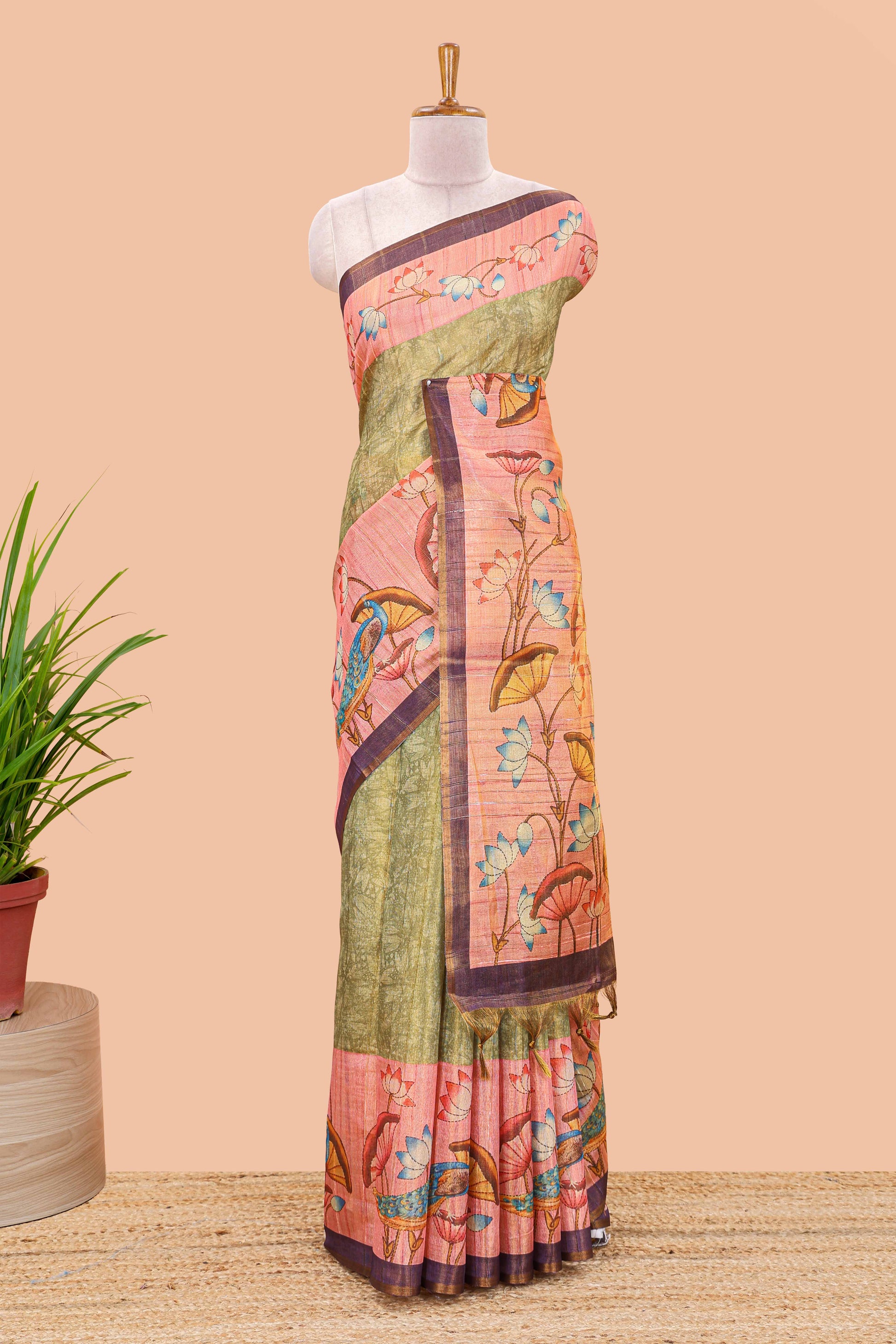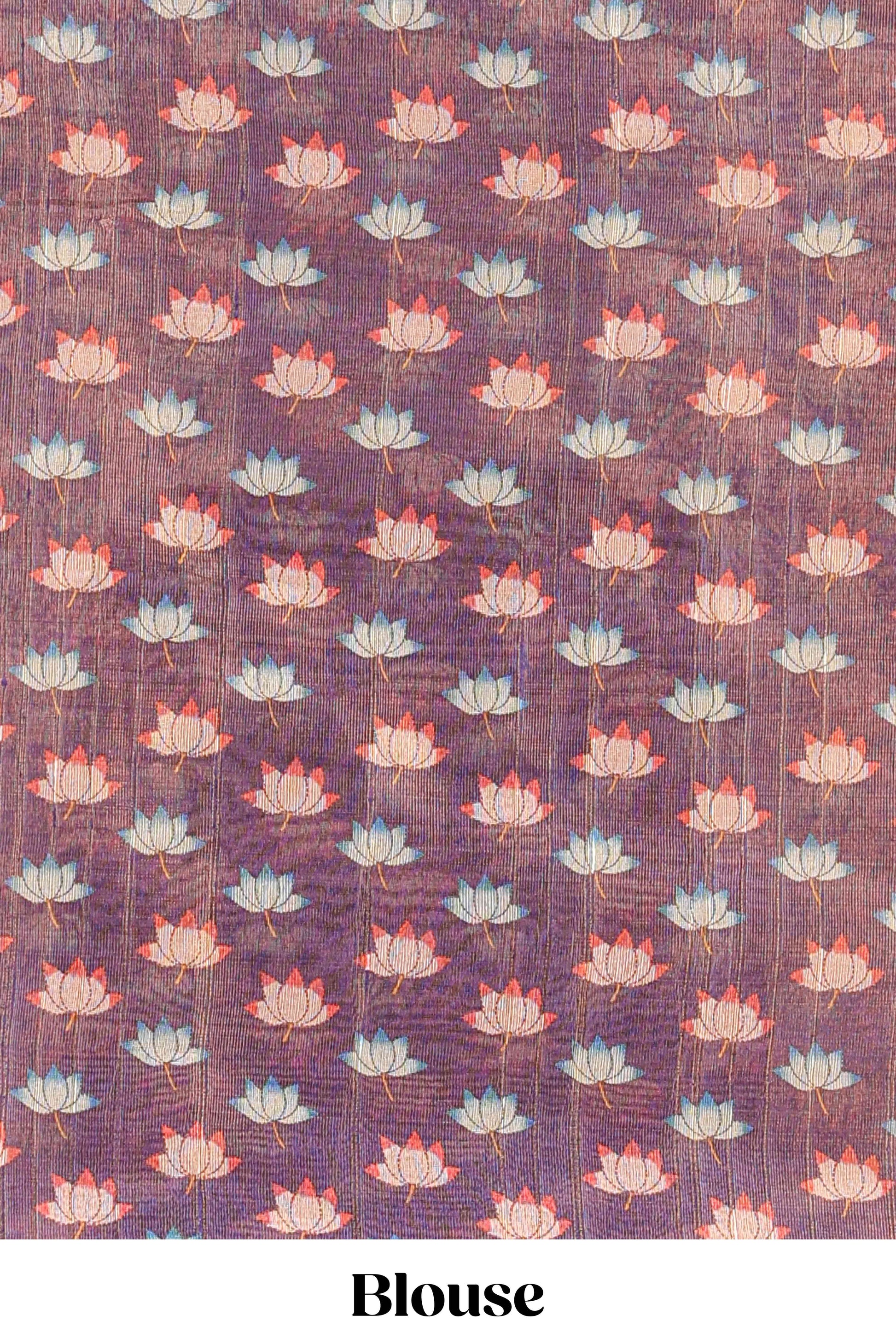Green tissue tussar saree with lotus jaal pallu and scattered lotus motif blouse