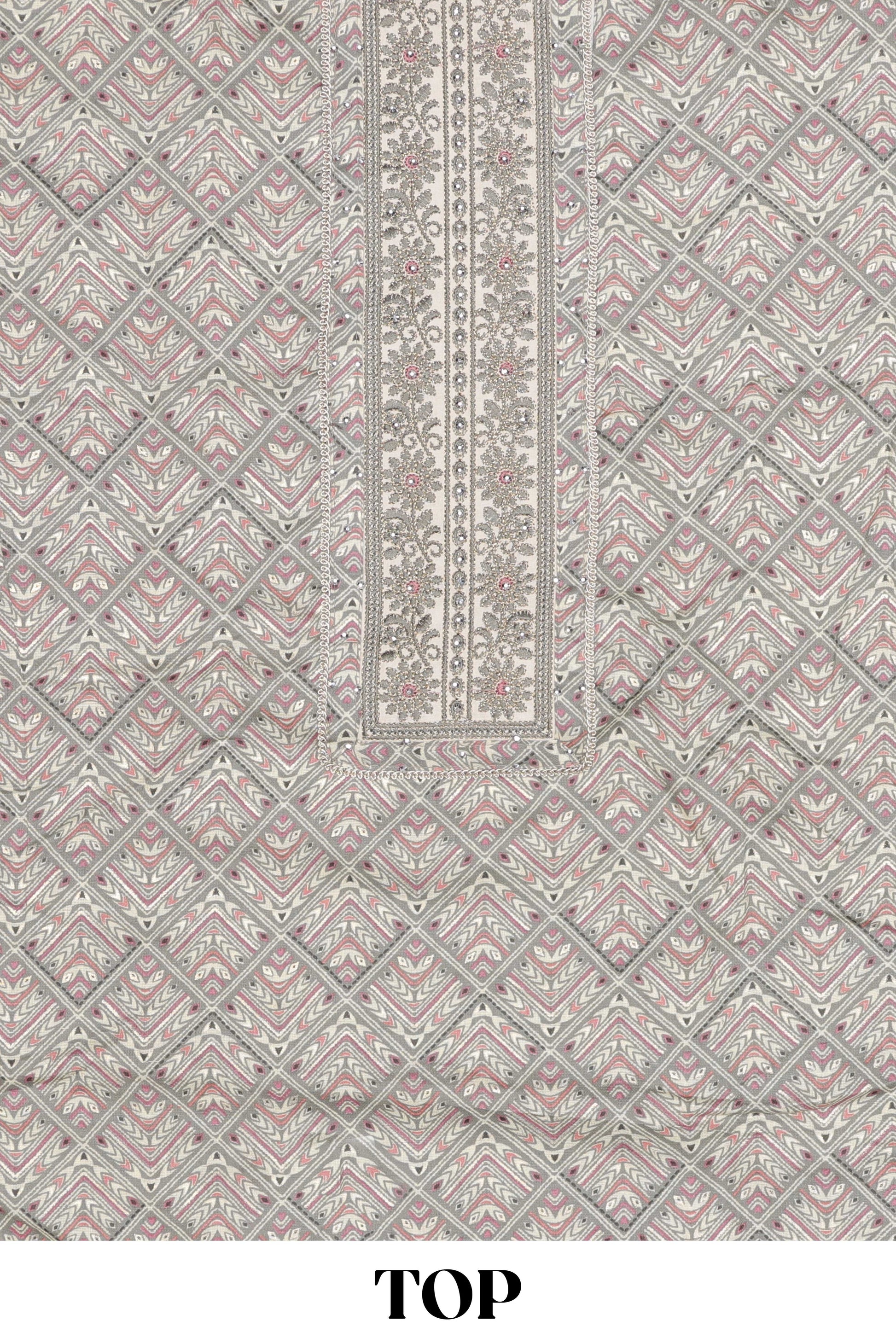 Grey cotton geomentrical embroidered chudidhar material with contrast bottom and dupatta