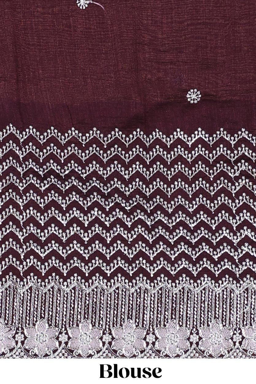 Grey designer georgette space silk saree with heavy stone & beads work, short pallu and contrast sequin embroidered blouse