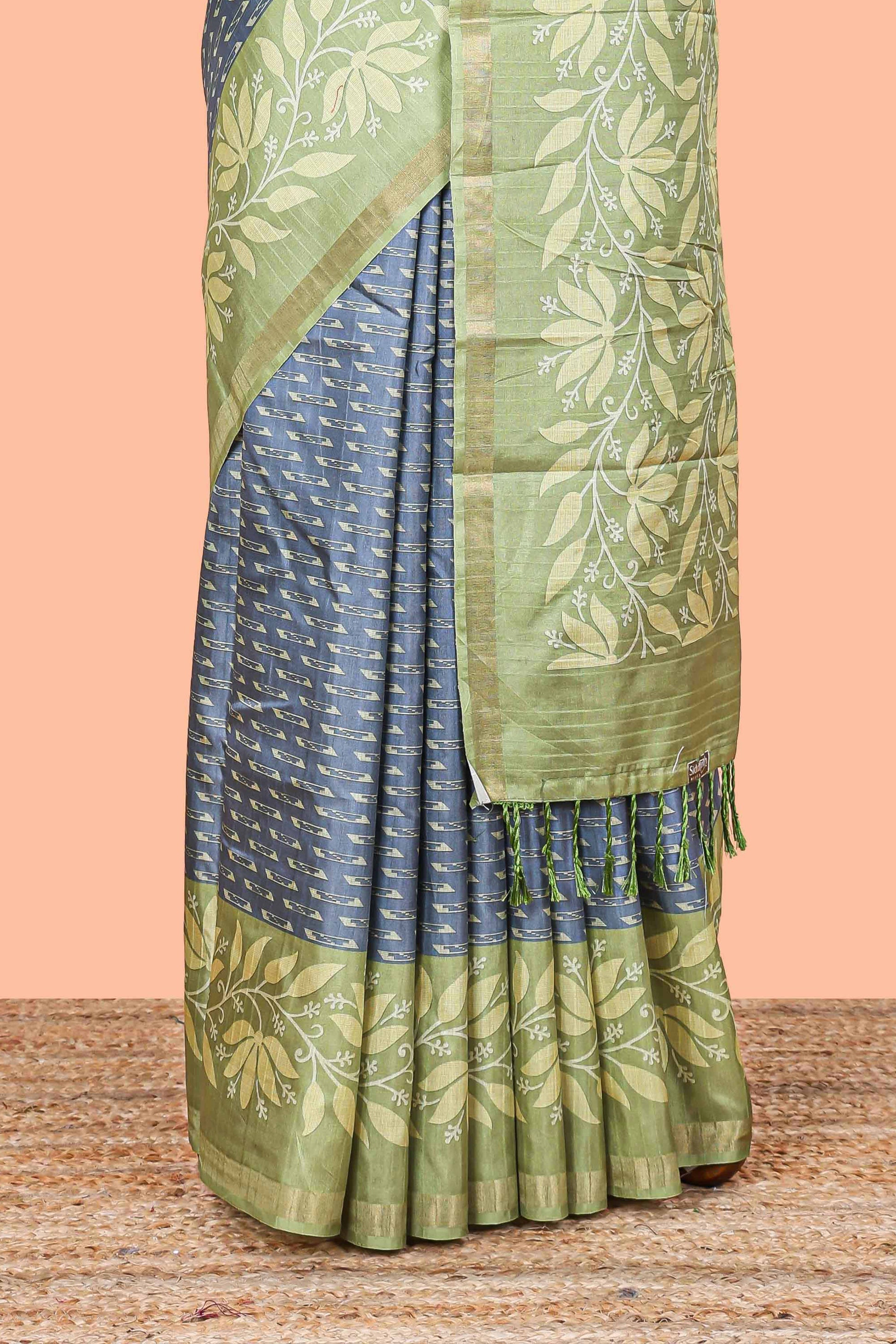 Grey geomentric design motifs art tussar saree with contrast border and blouse