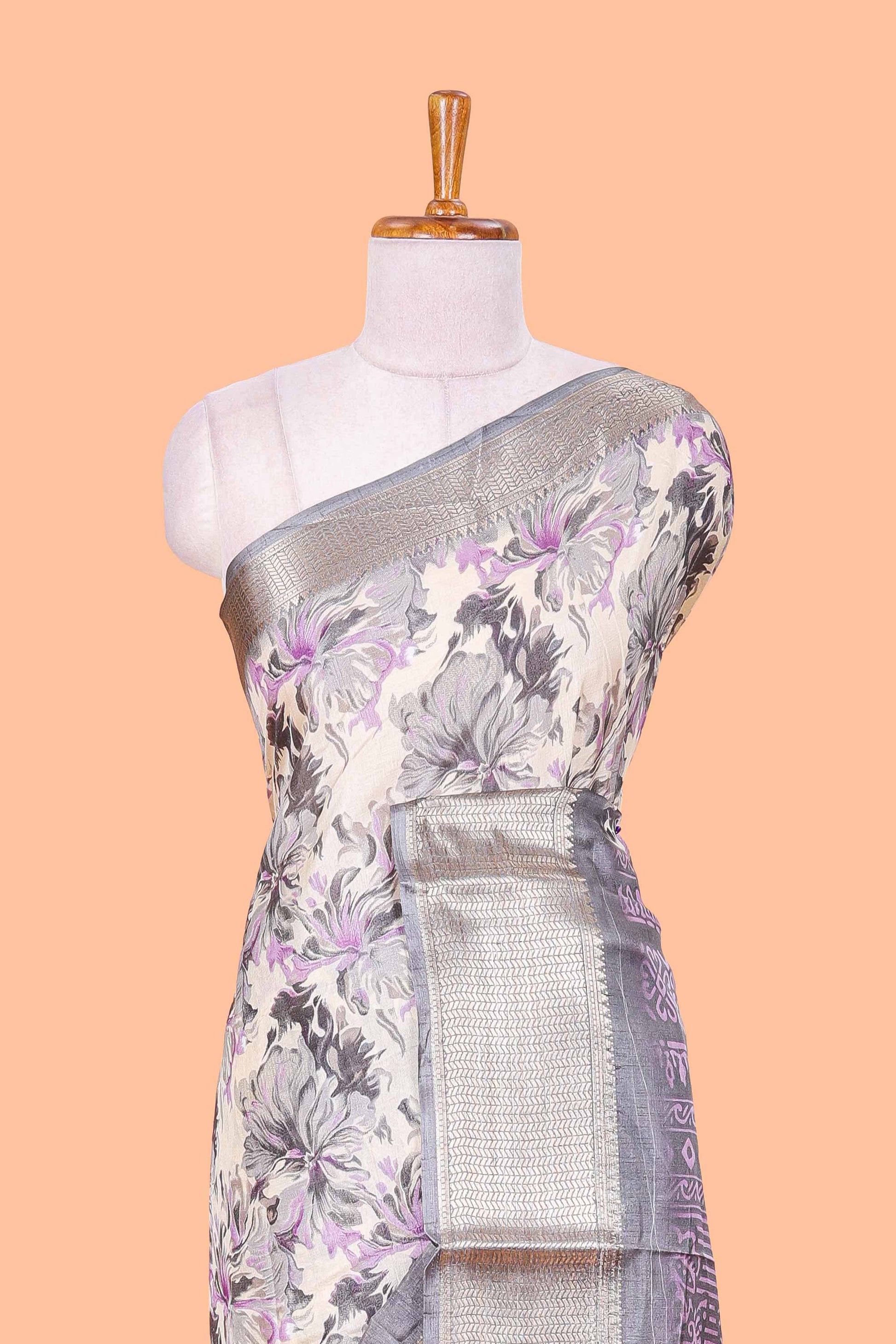 Grey Semi Banaras Dola Silk Floral Printed With Jacquard Border