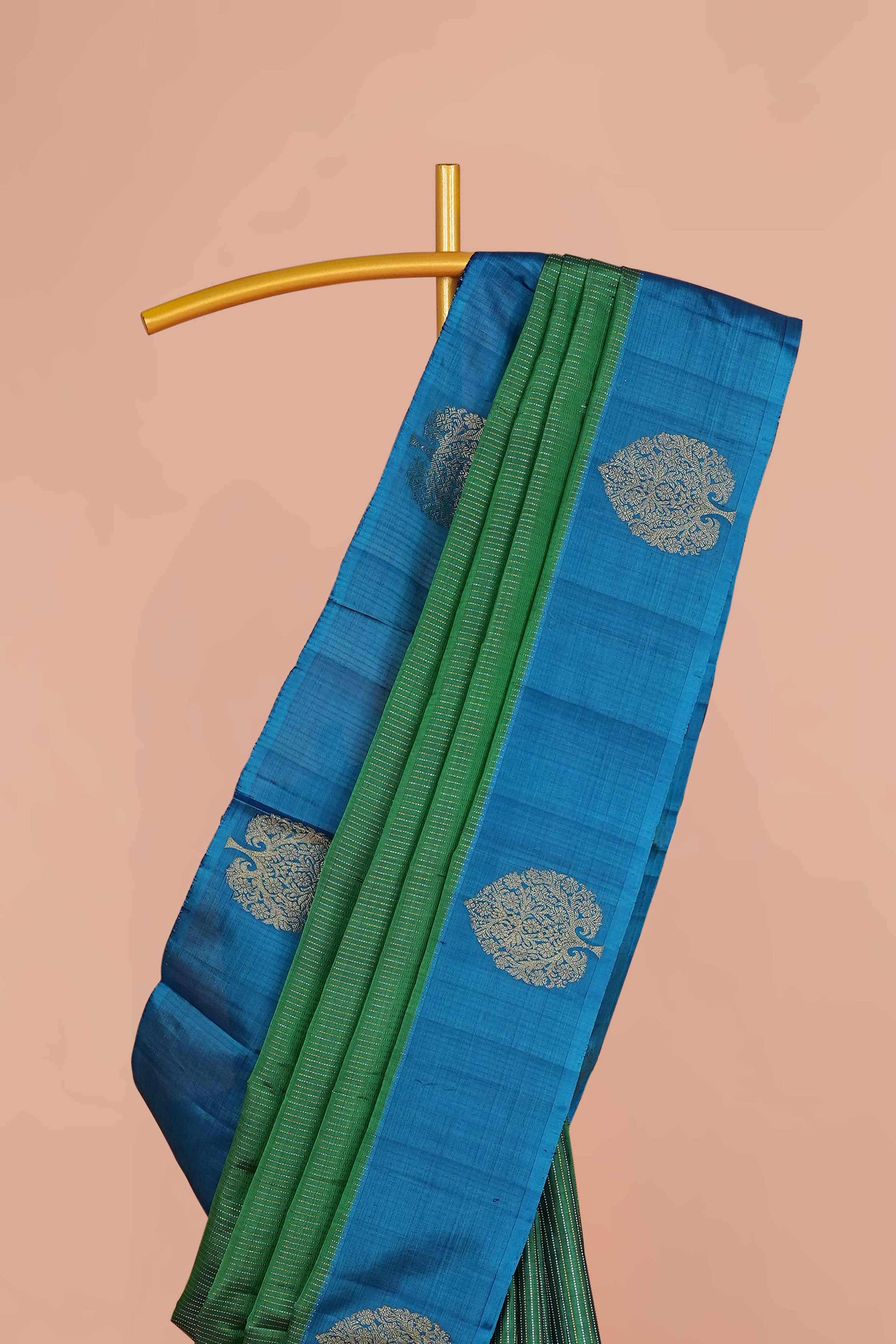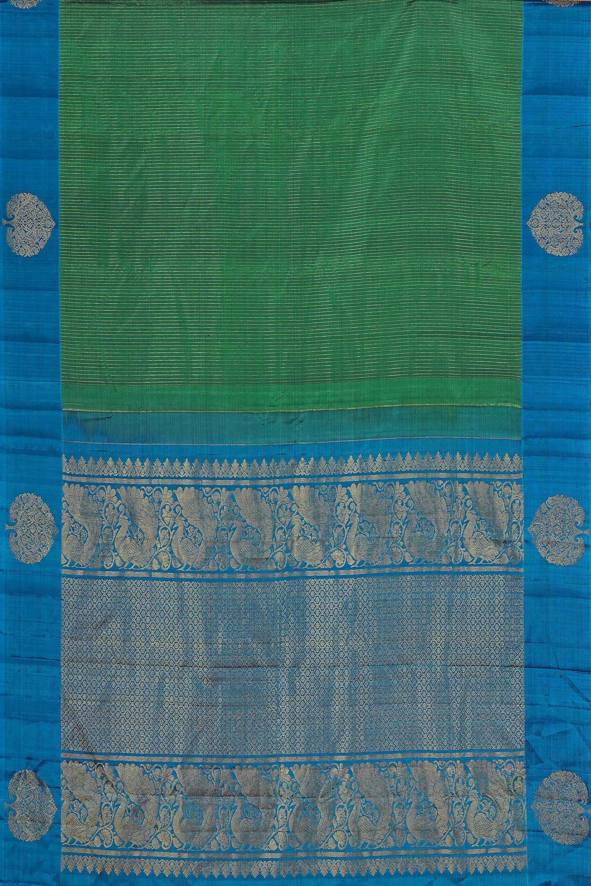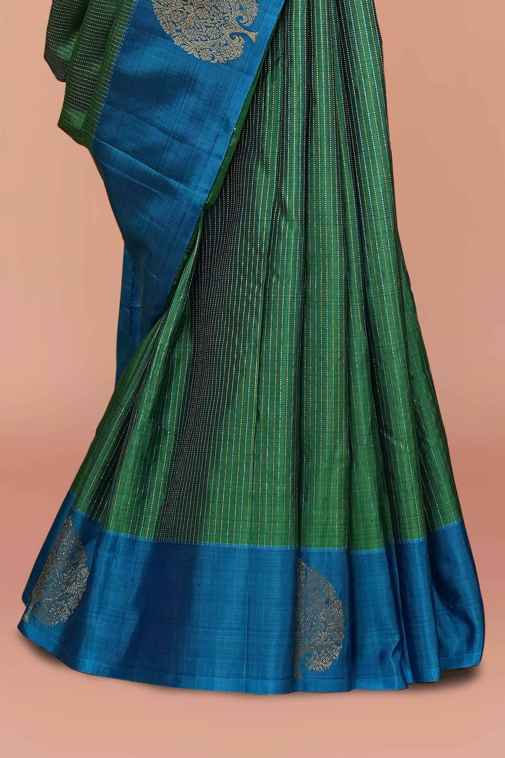 Bottle Green & Royal Blue Striped Border Kanchipuram Pure Silk Saree with Silver Zari Butta