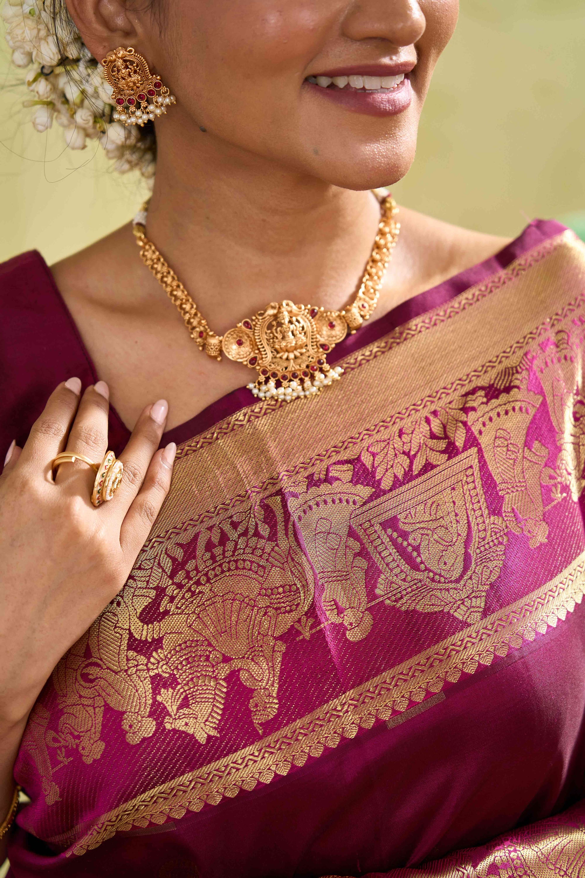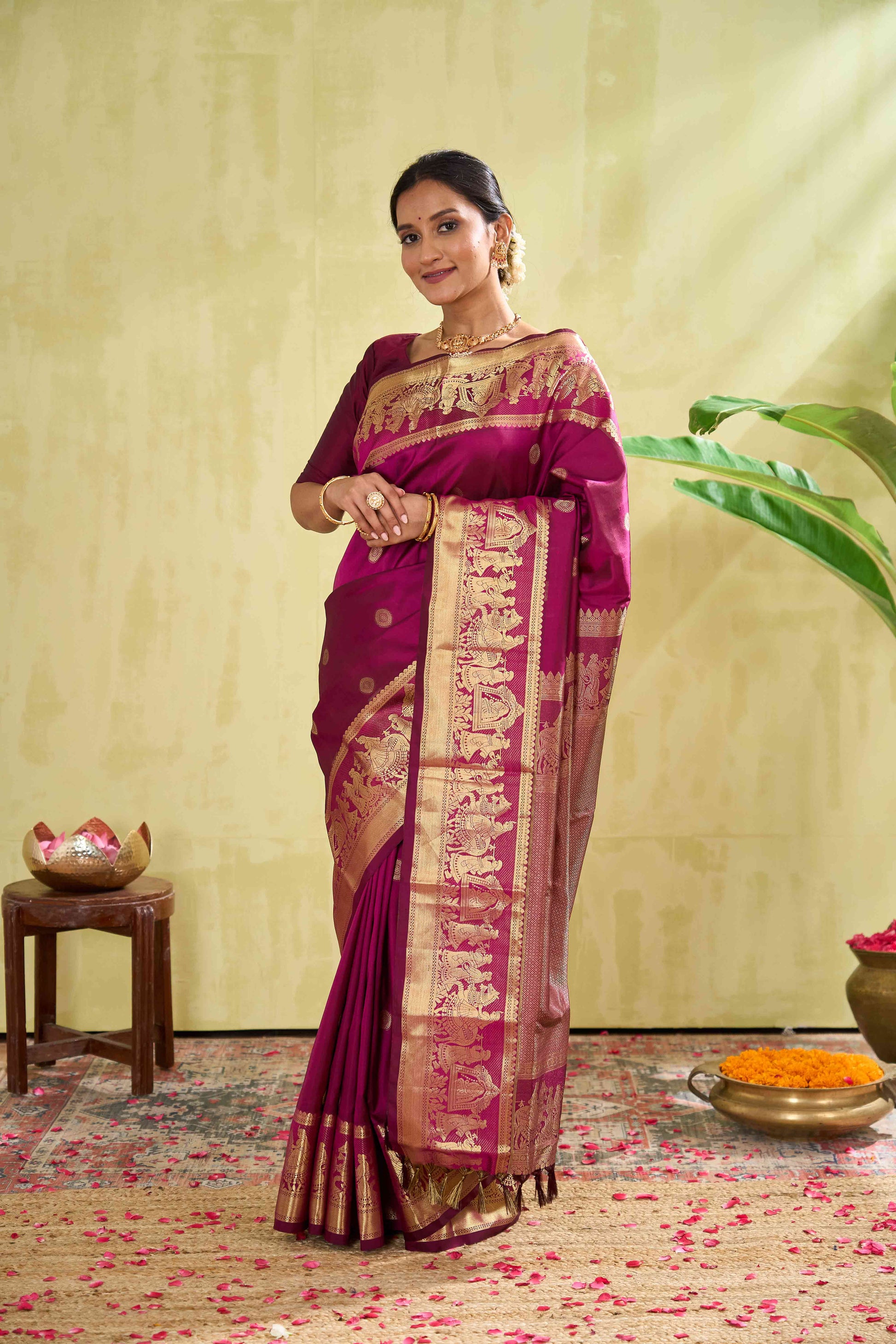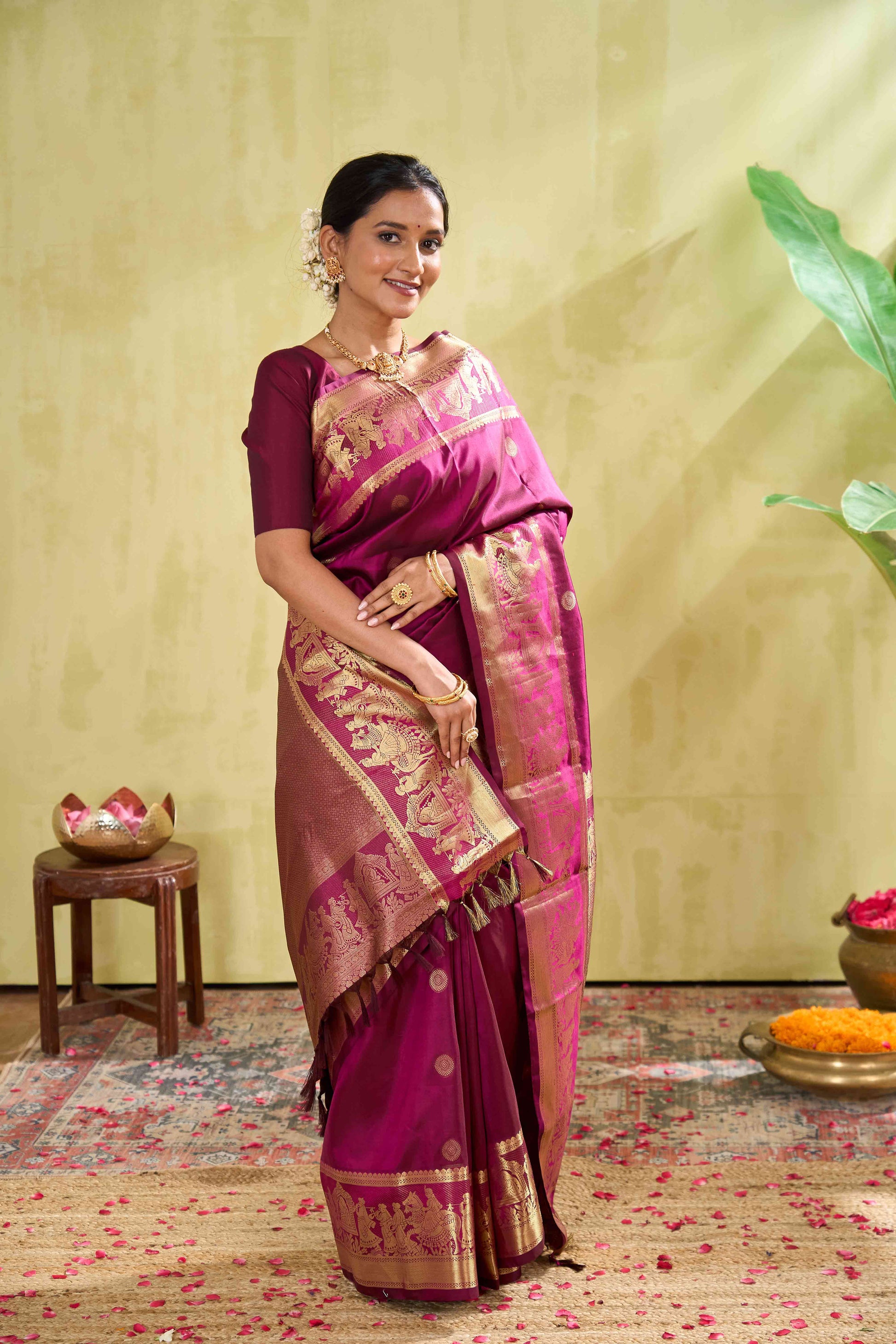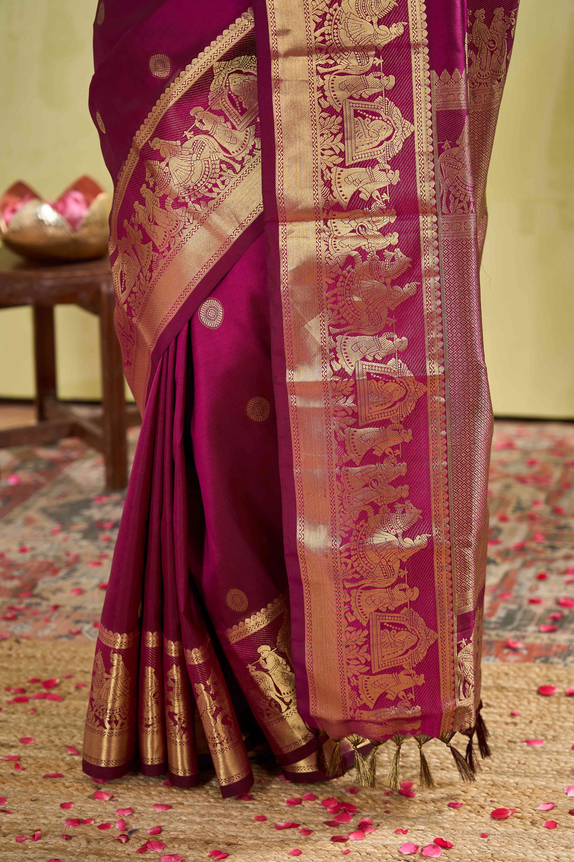 Kanchipuram Traditional Silk Saree in Magenta with Gold Zari Buttas & Self Border