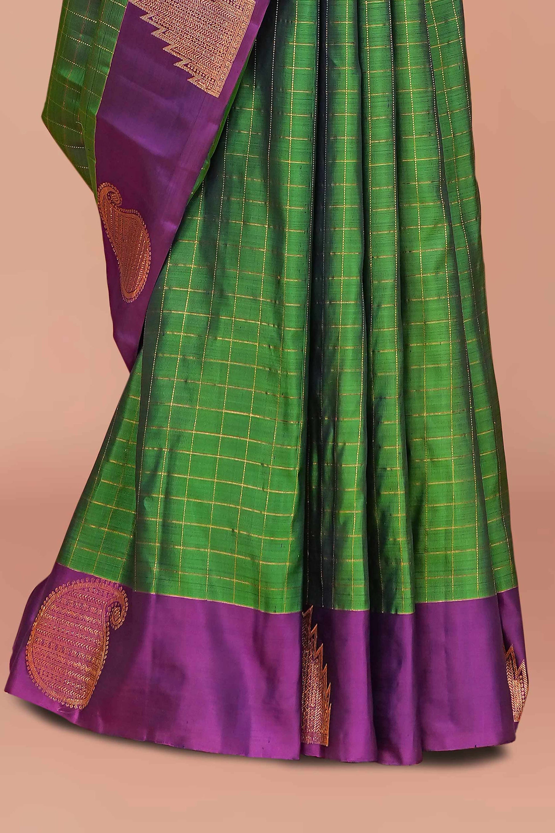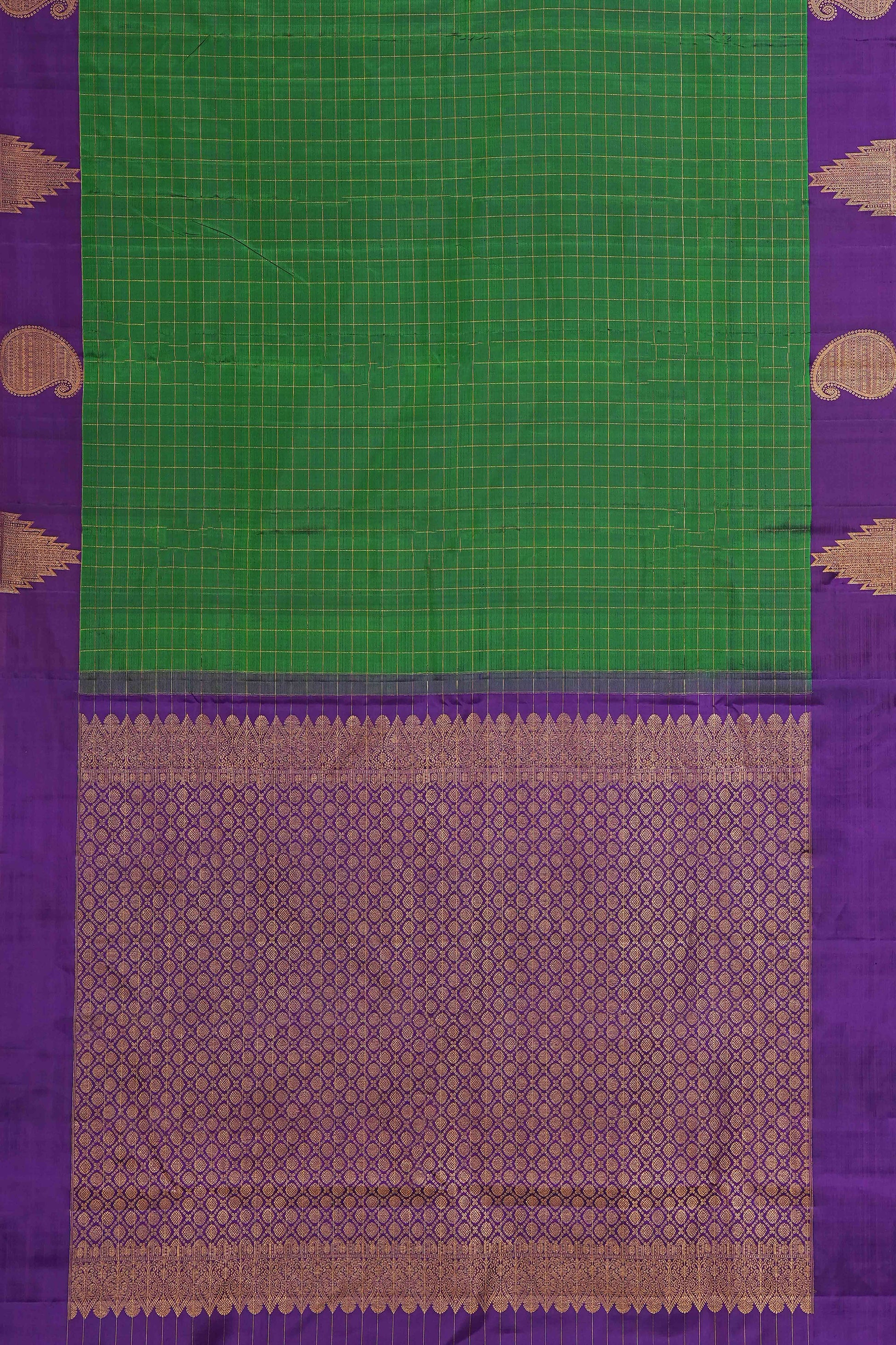 Emerald Green & Royal Purple Body Checked Border Kanchipuram Pure Silk Saree with Gold Butta Accents