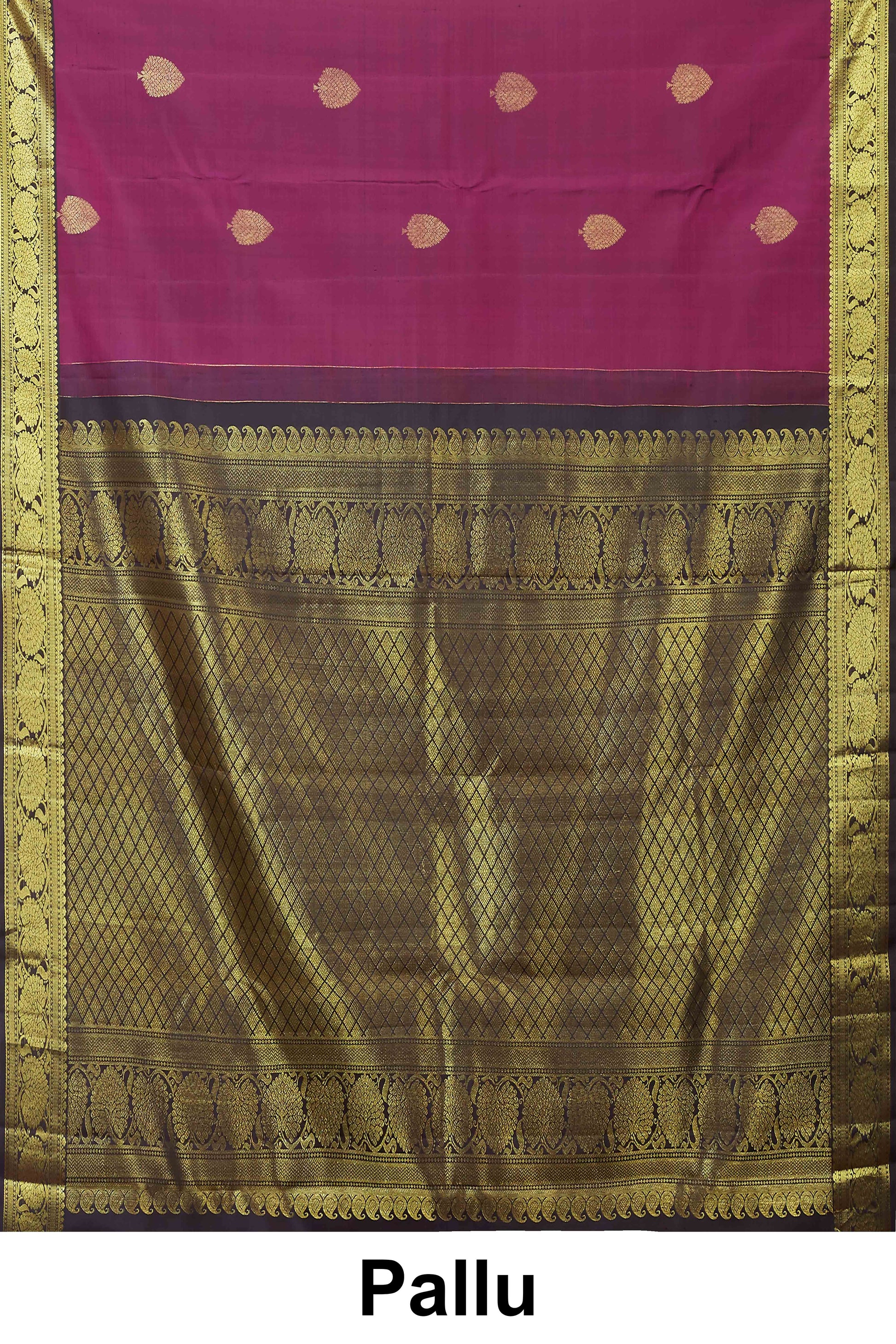 Kanchipuram Traditional Silk Saree in Deep Magenta with Gold Zari Buttas and Contrast Border