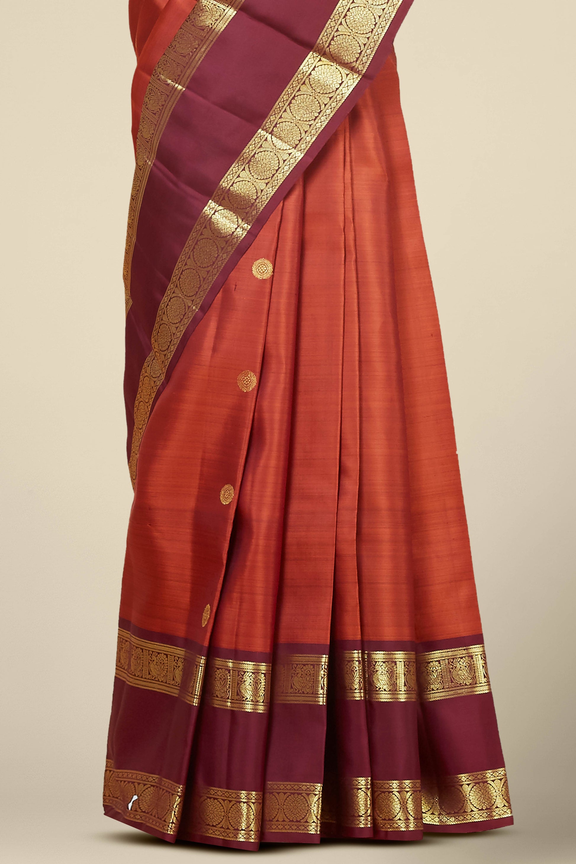 Kanchipuram Traditional Silk Saree in Rust Orange with Maroon Contrast Border and Gold Zari Detailing