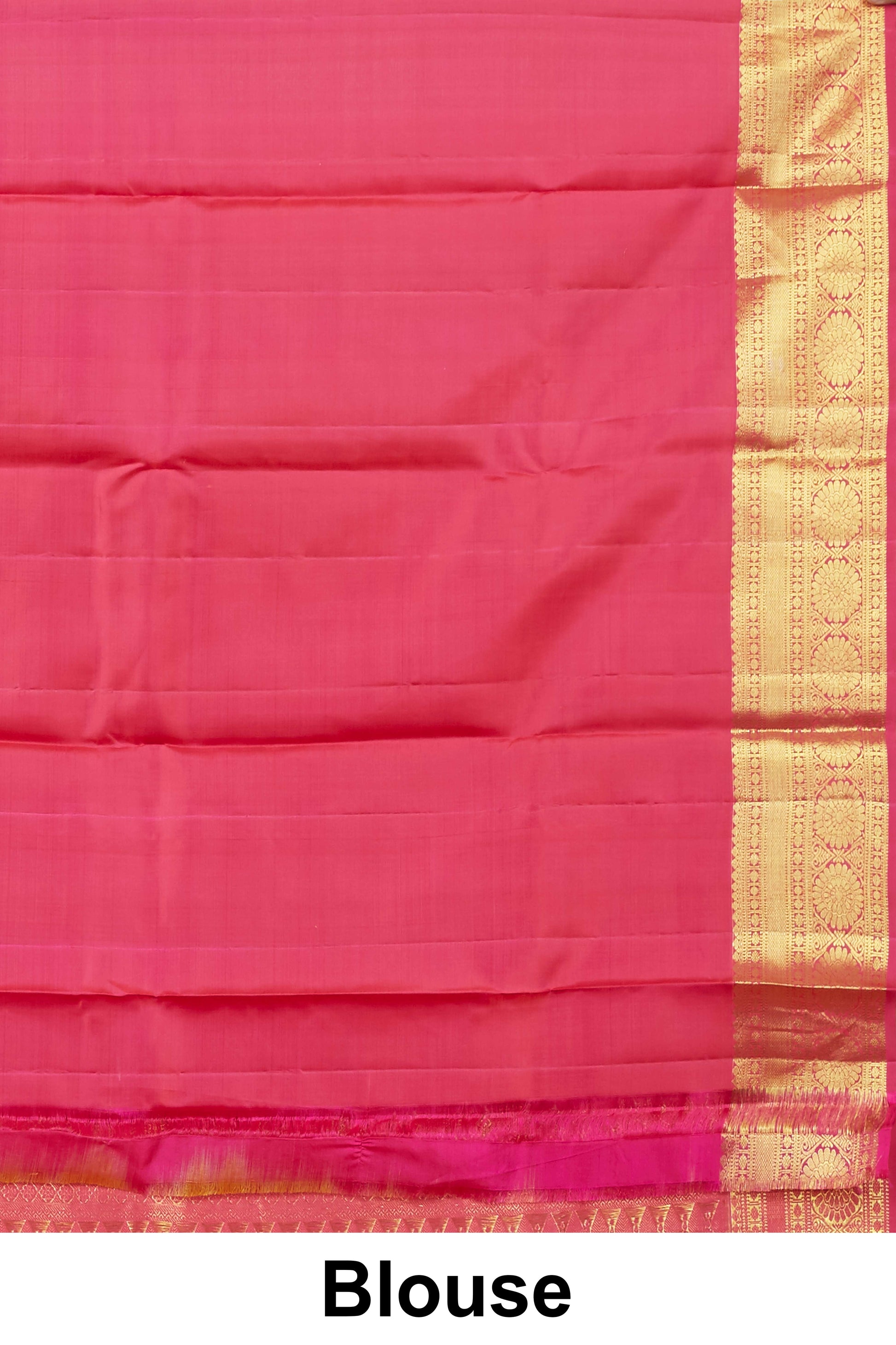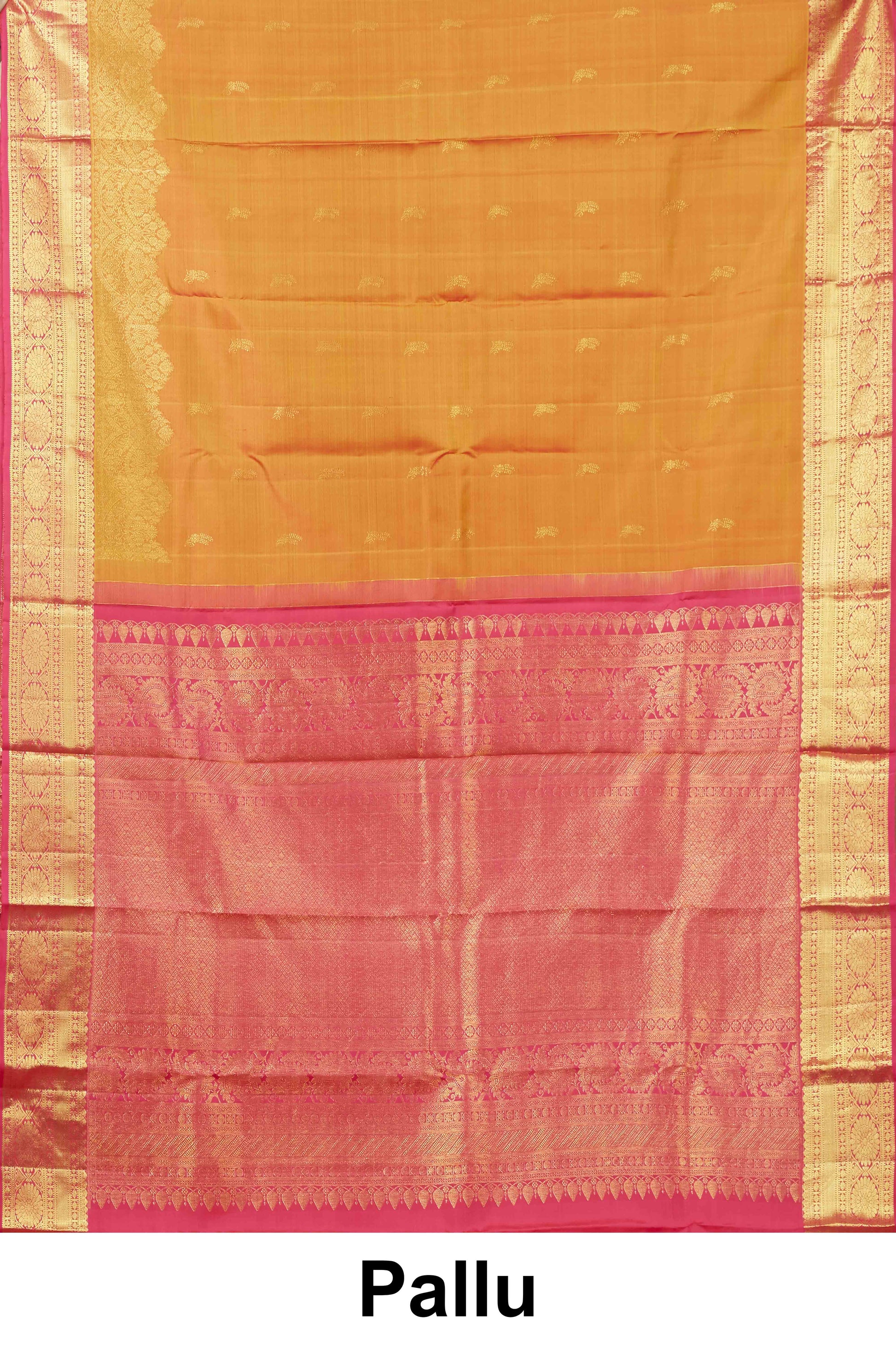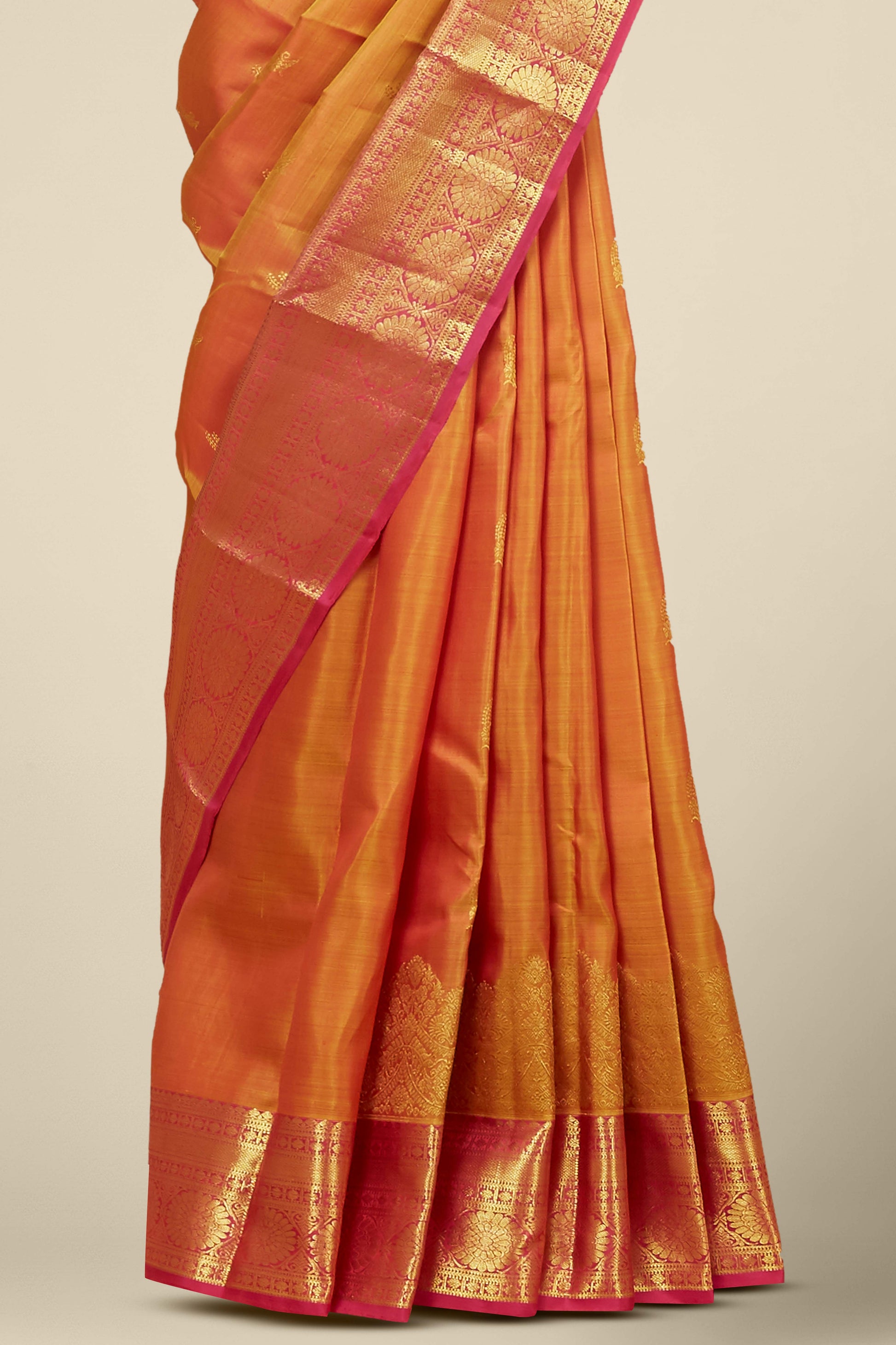 Kanchipuram Traditional Silk Saree in Orange with Gold Zari and Pink Contrast Border